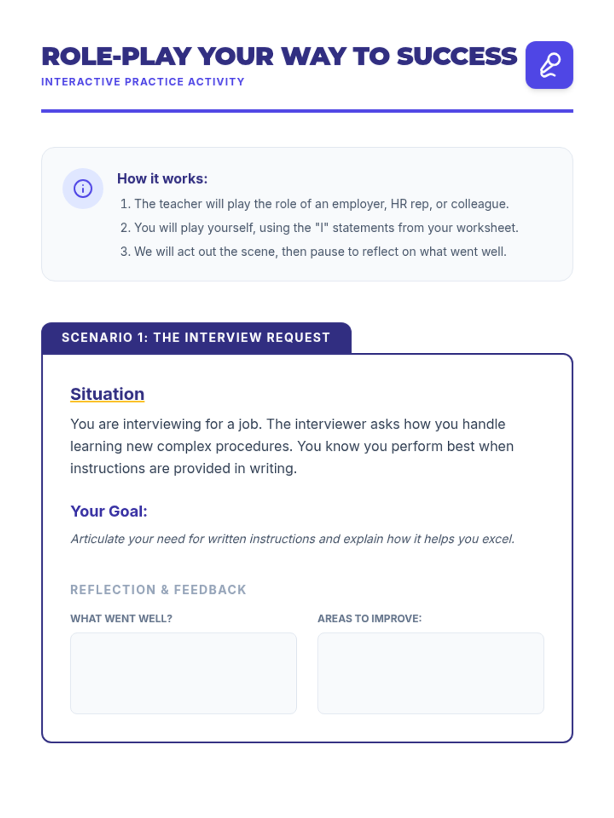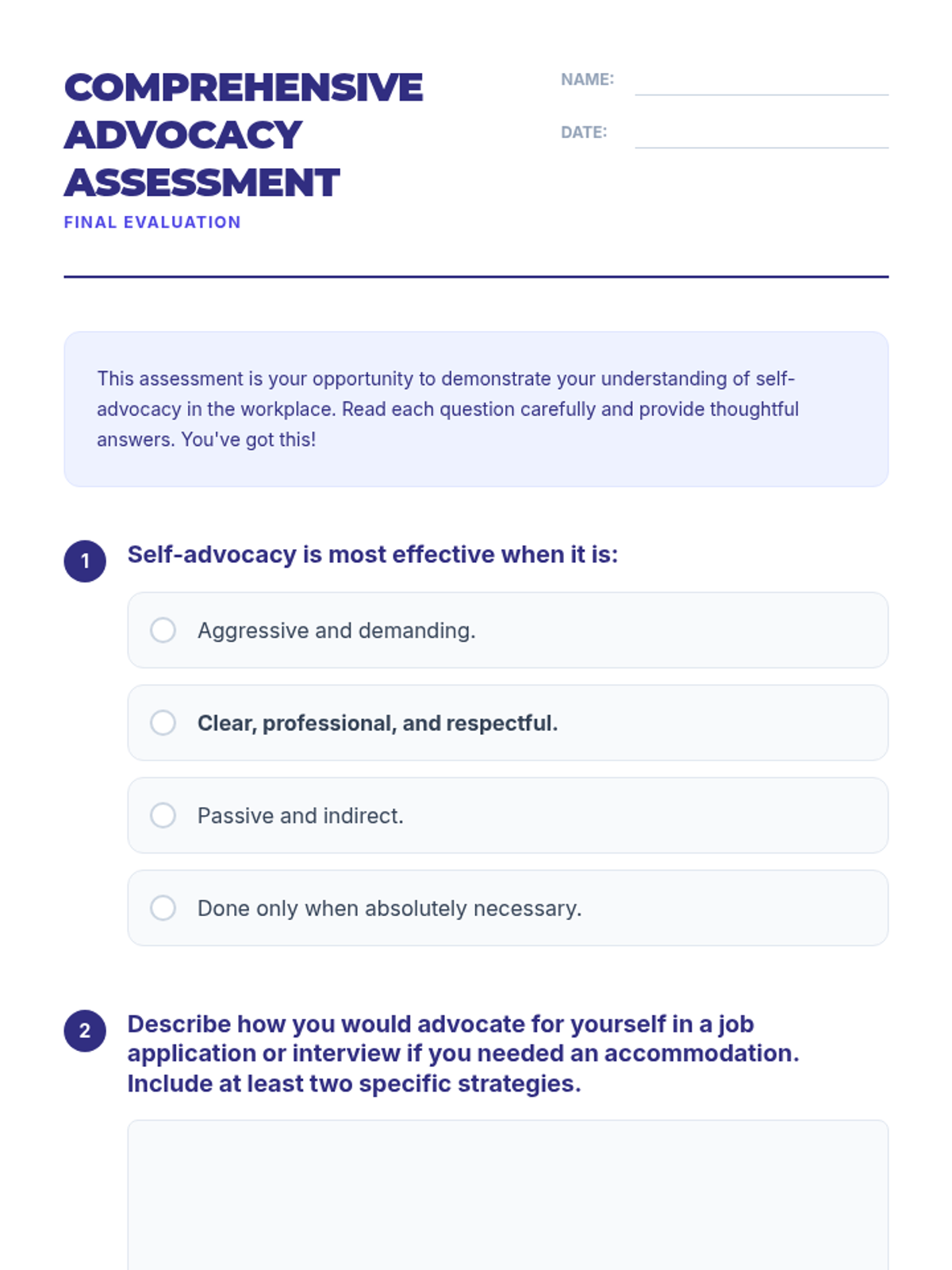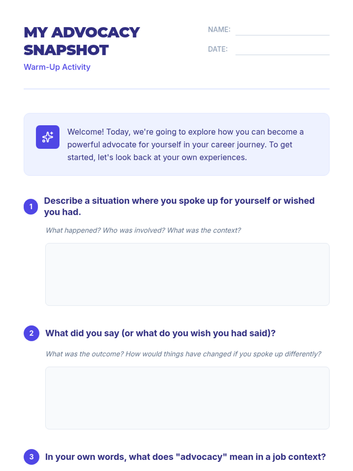 A high-energy, 30-minute coaching session focused on five critical self-advocacy scenarios. Includes role-play, visual aids, and practical toolkits for immediate application in real-world settings.