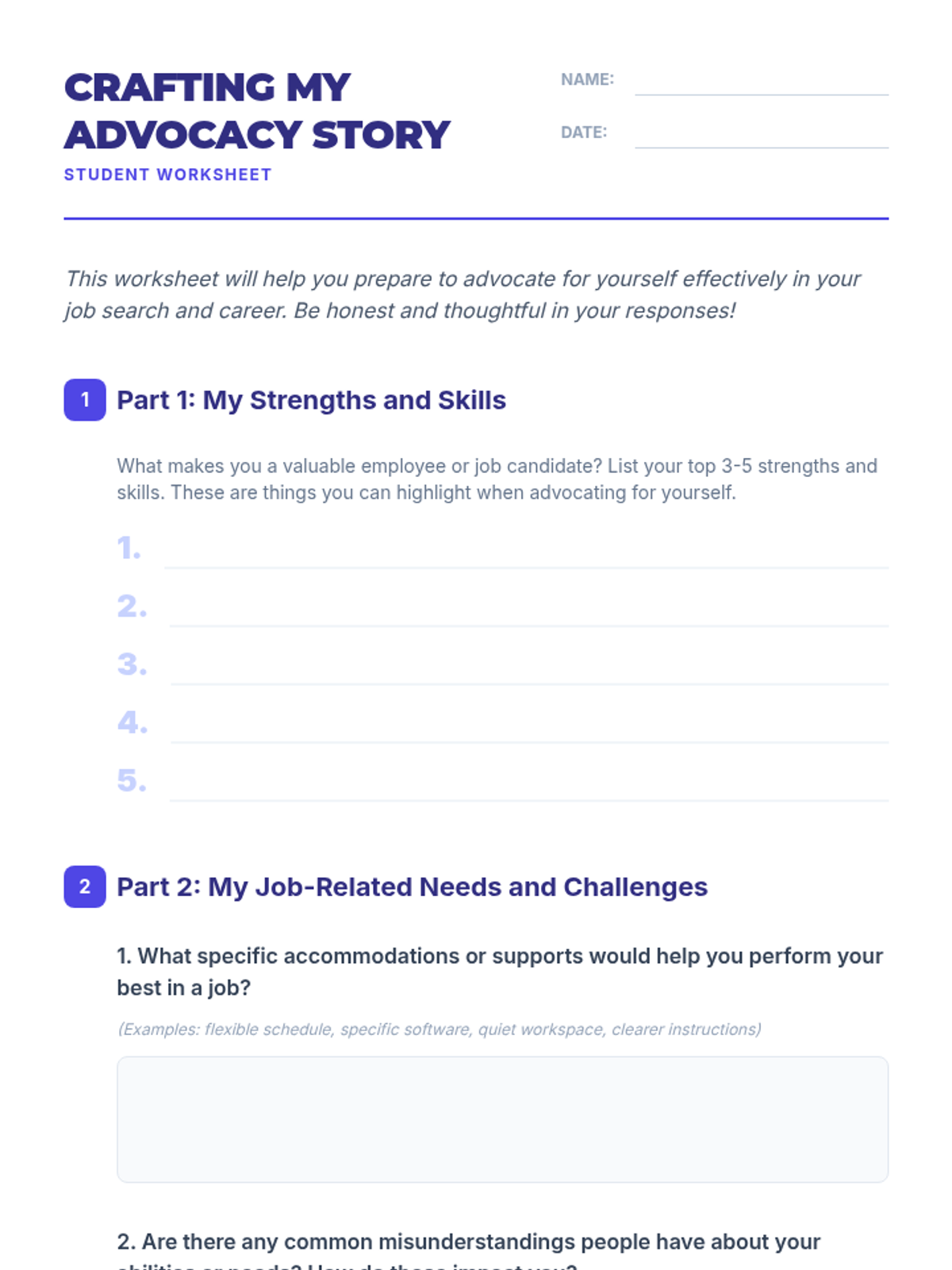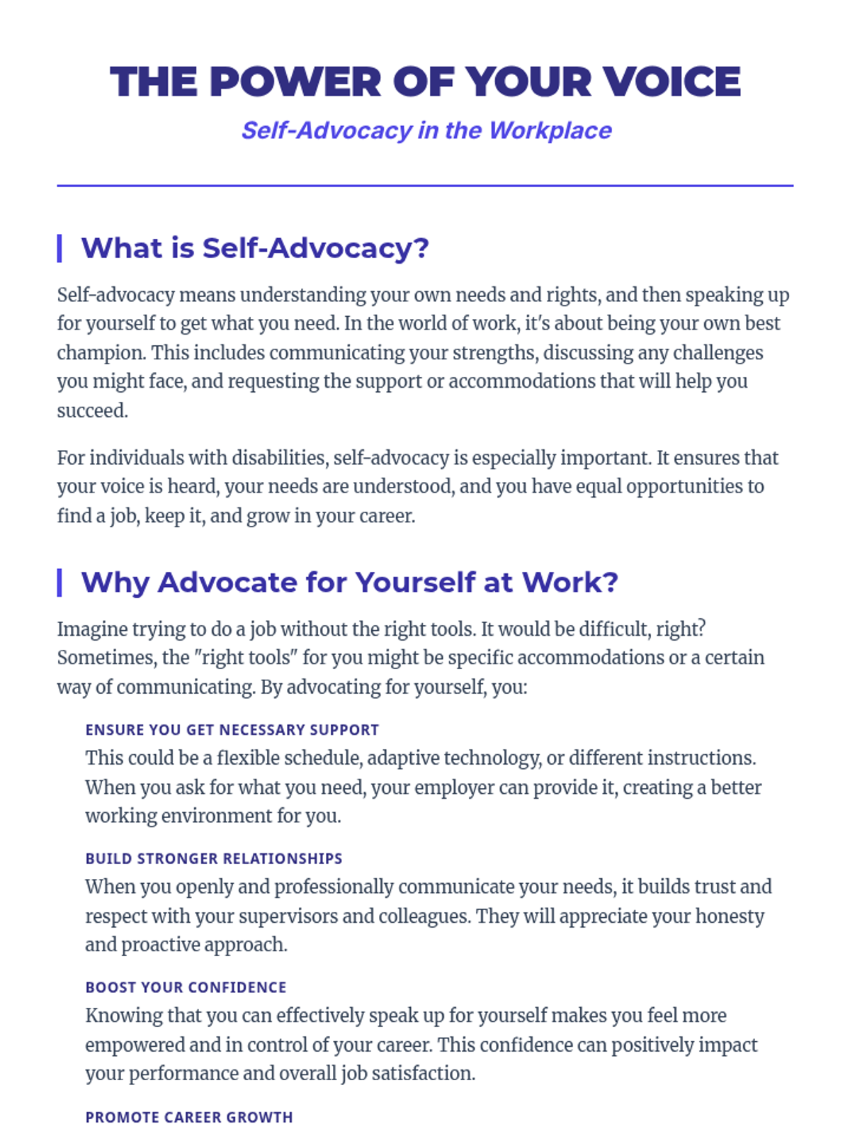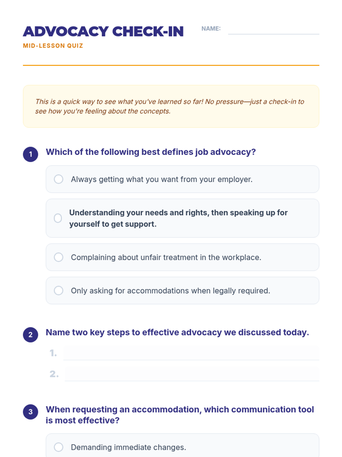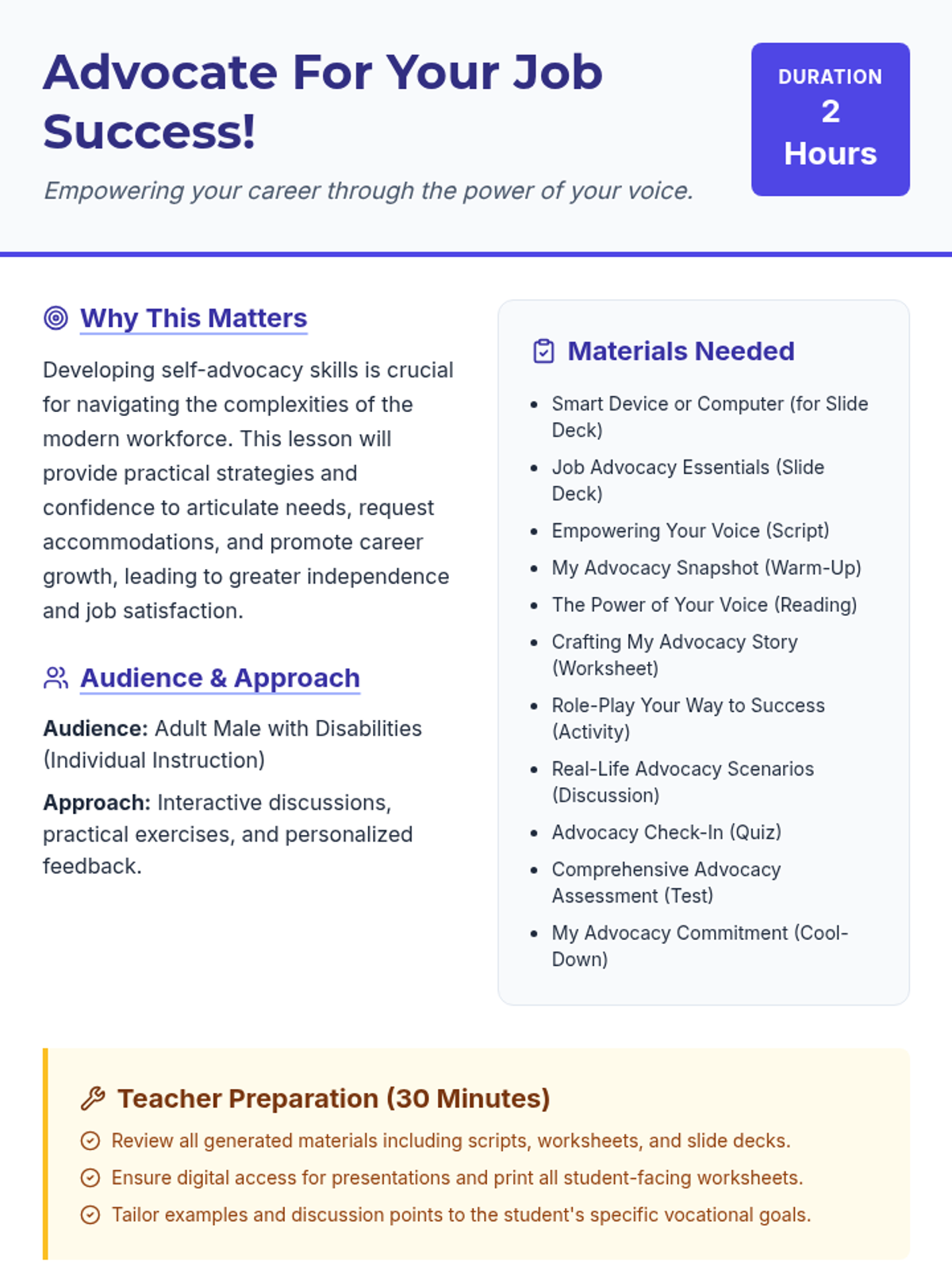 A 2-hour individual lesson for an adult male with disabilities to develop self-advocacy skills for employment, focusing on communicating needs, requesting accommodations, and career advancement.