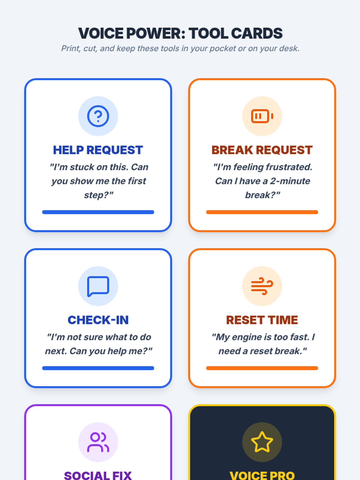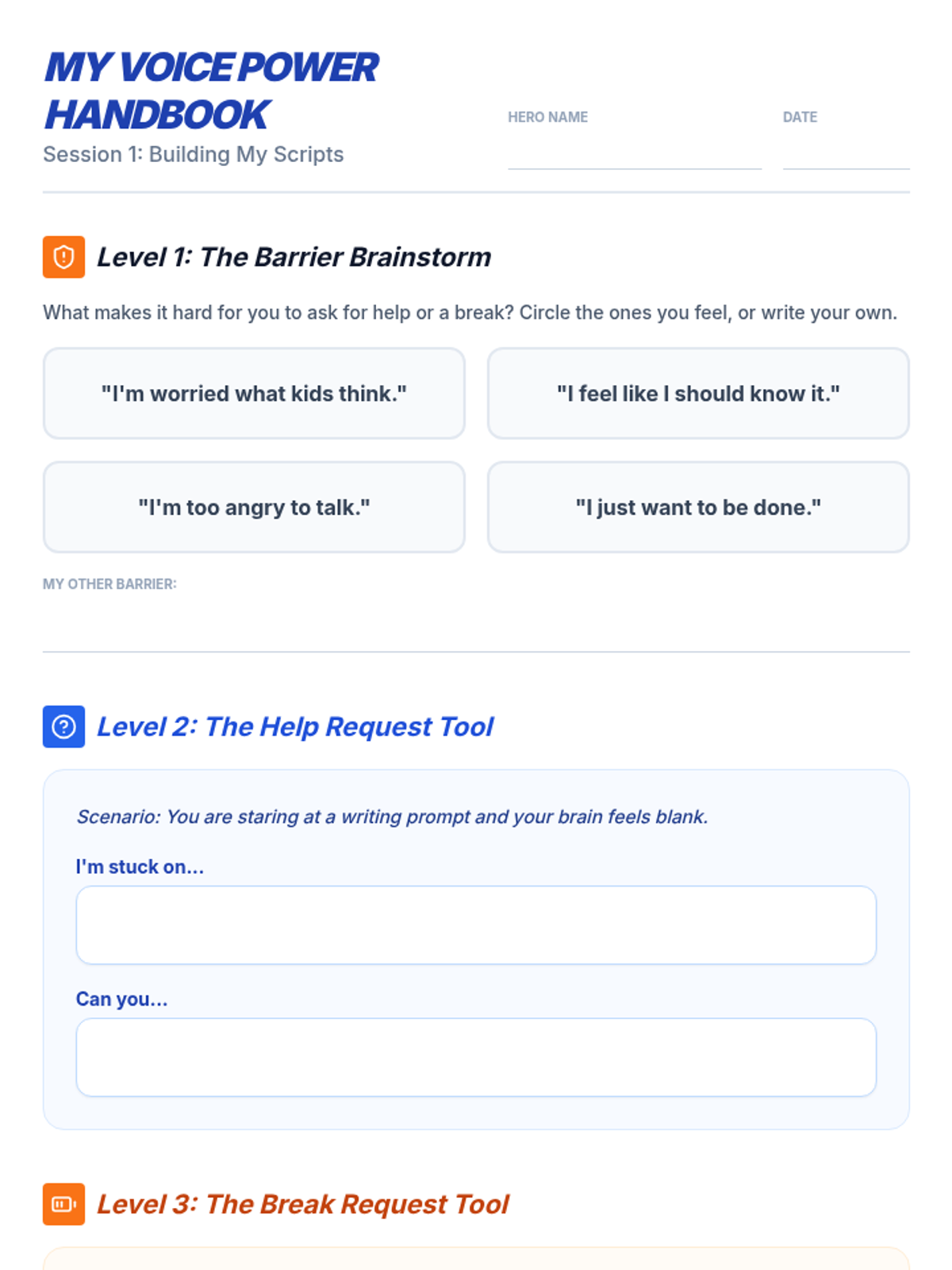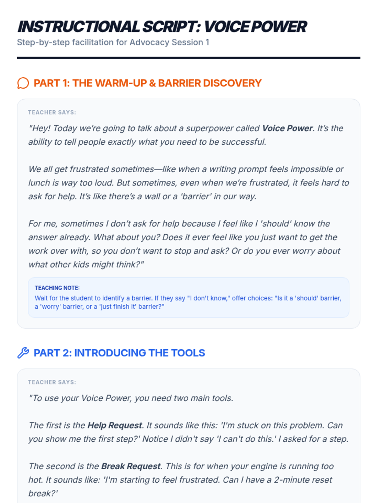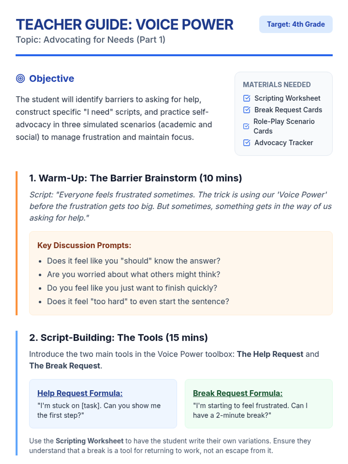 A lesson designed to help a 4th-grade student develop self-advocacy skills, specifically focusing on asking for help and requesting breaks in academic and social contexts.