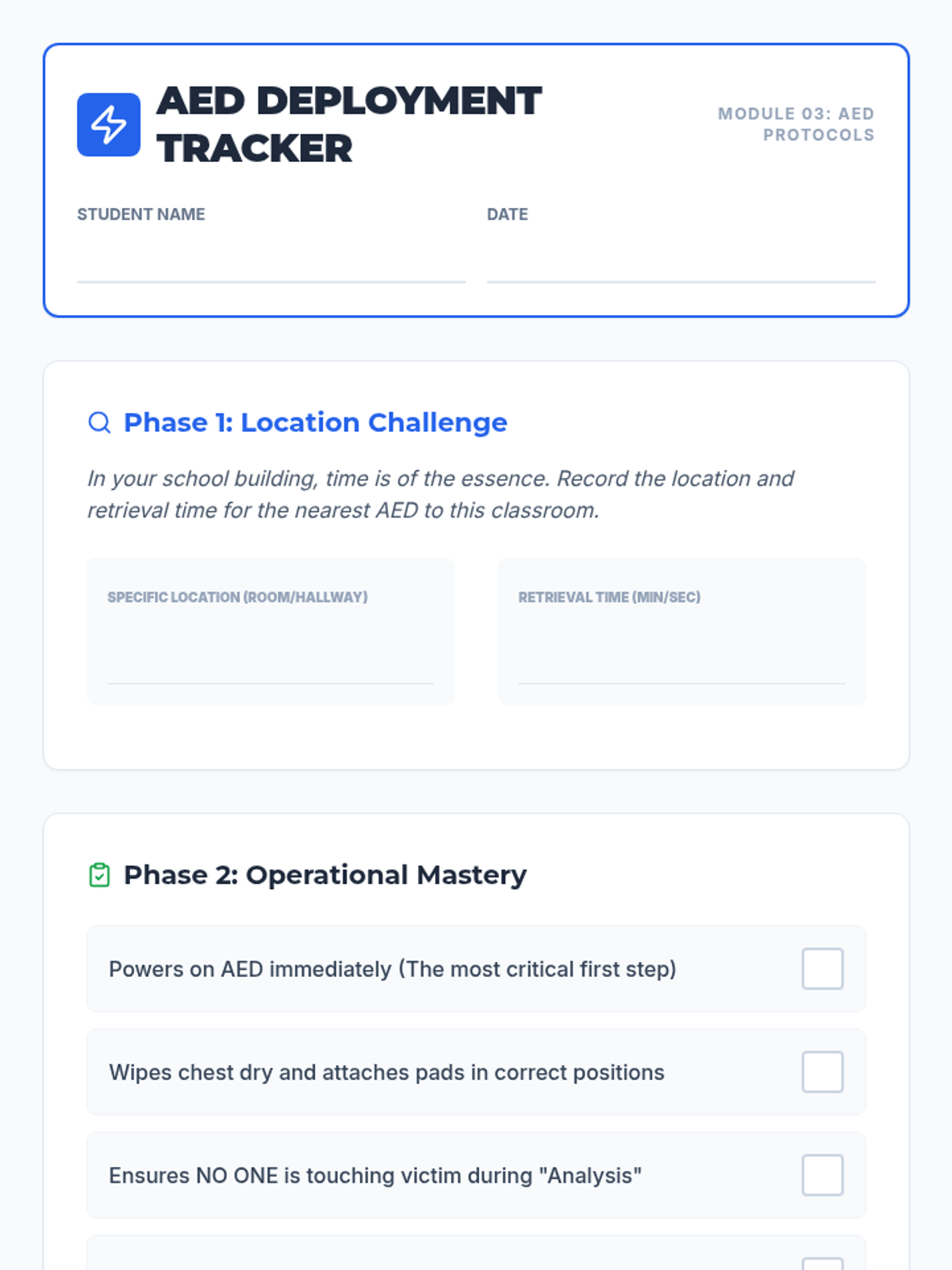 Covers the step-by-step operation of an AED, including pad placement, safety protocols, and integration with ongoing CPR efforts.