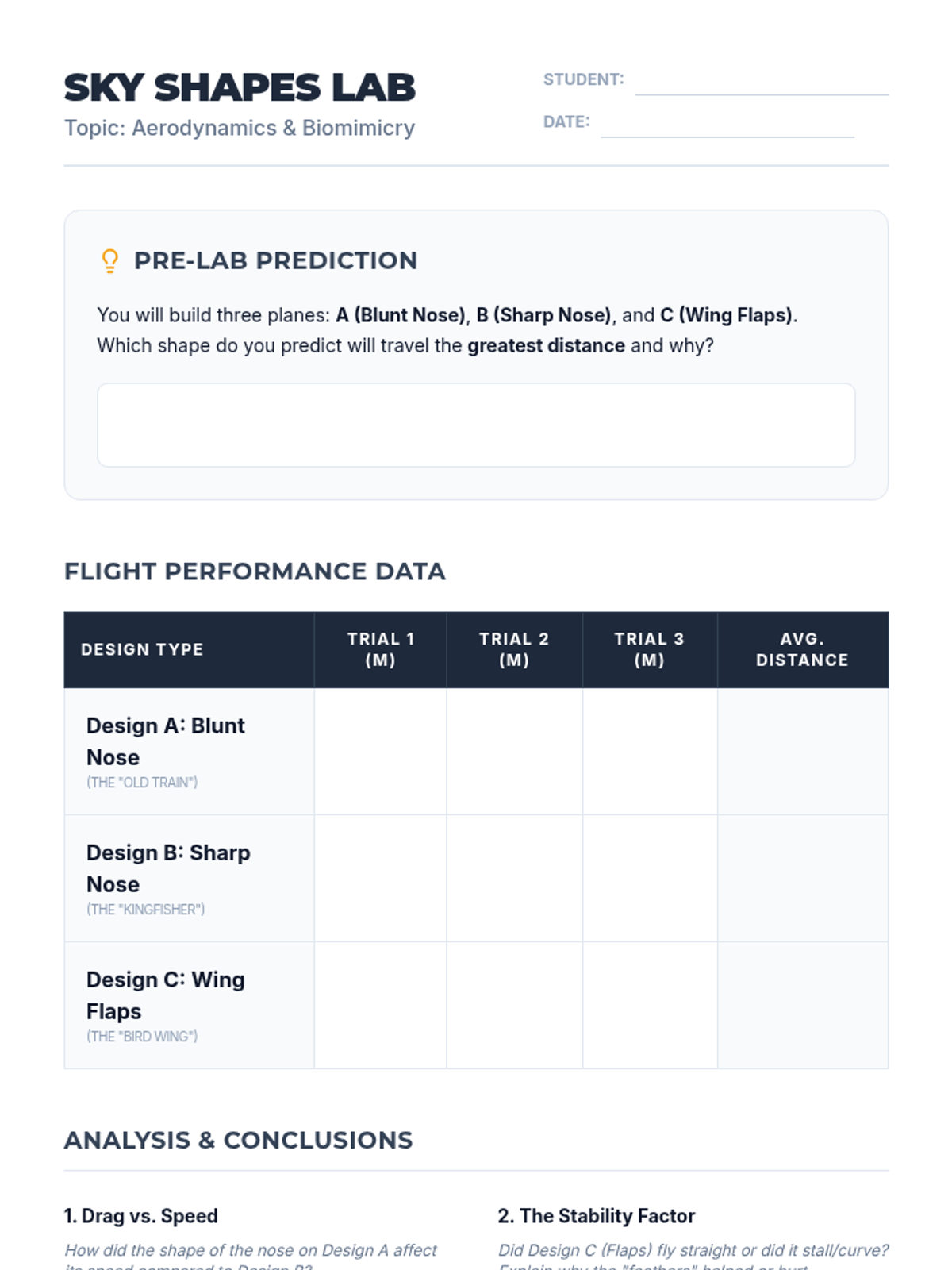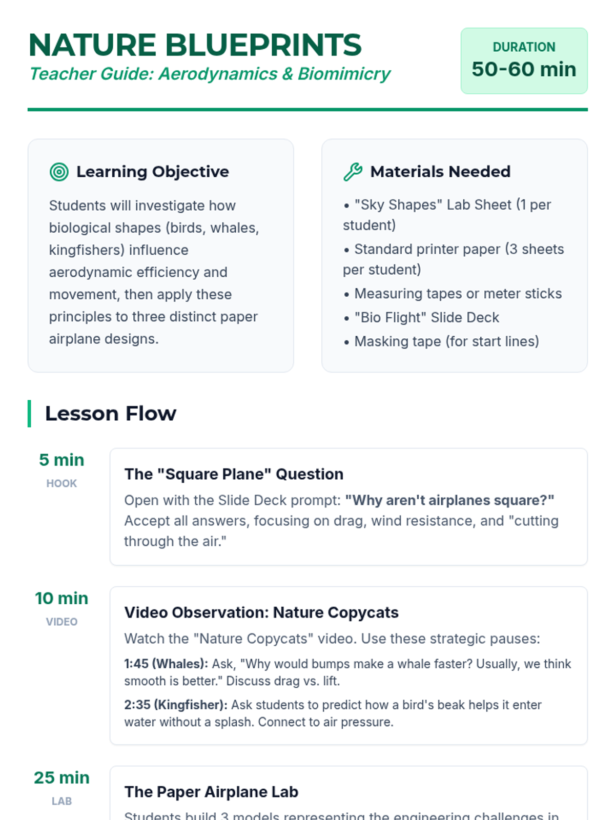 Students investigate aerodynamics and biomimicry by comparing nature's designs (birds, whales, kingfishers) to human engineering (planes, turbines, trains) through a hands-on paper airplane lab.