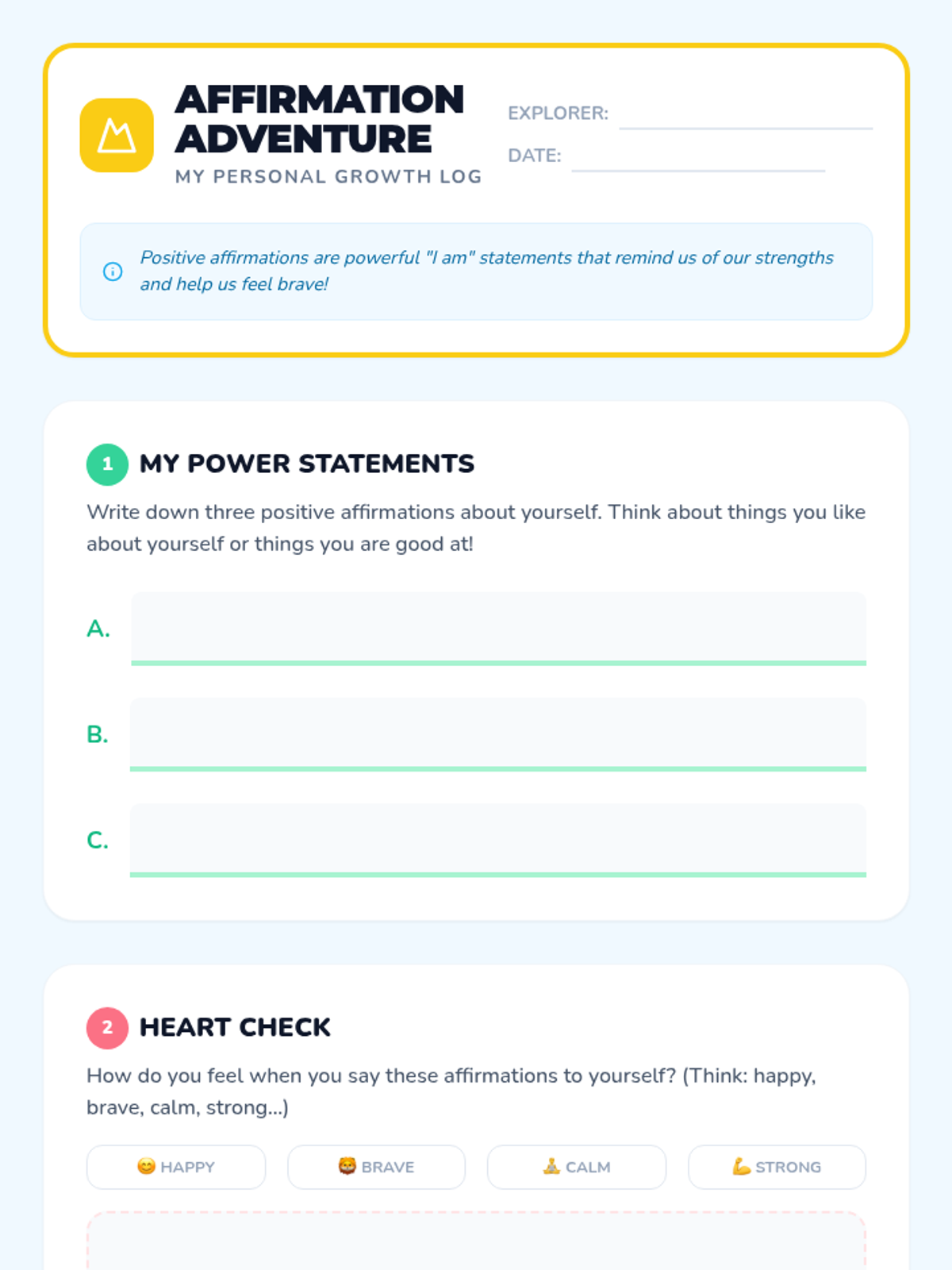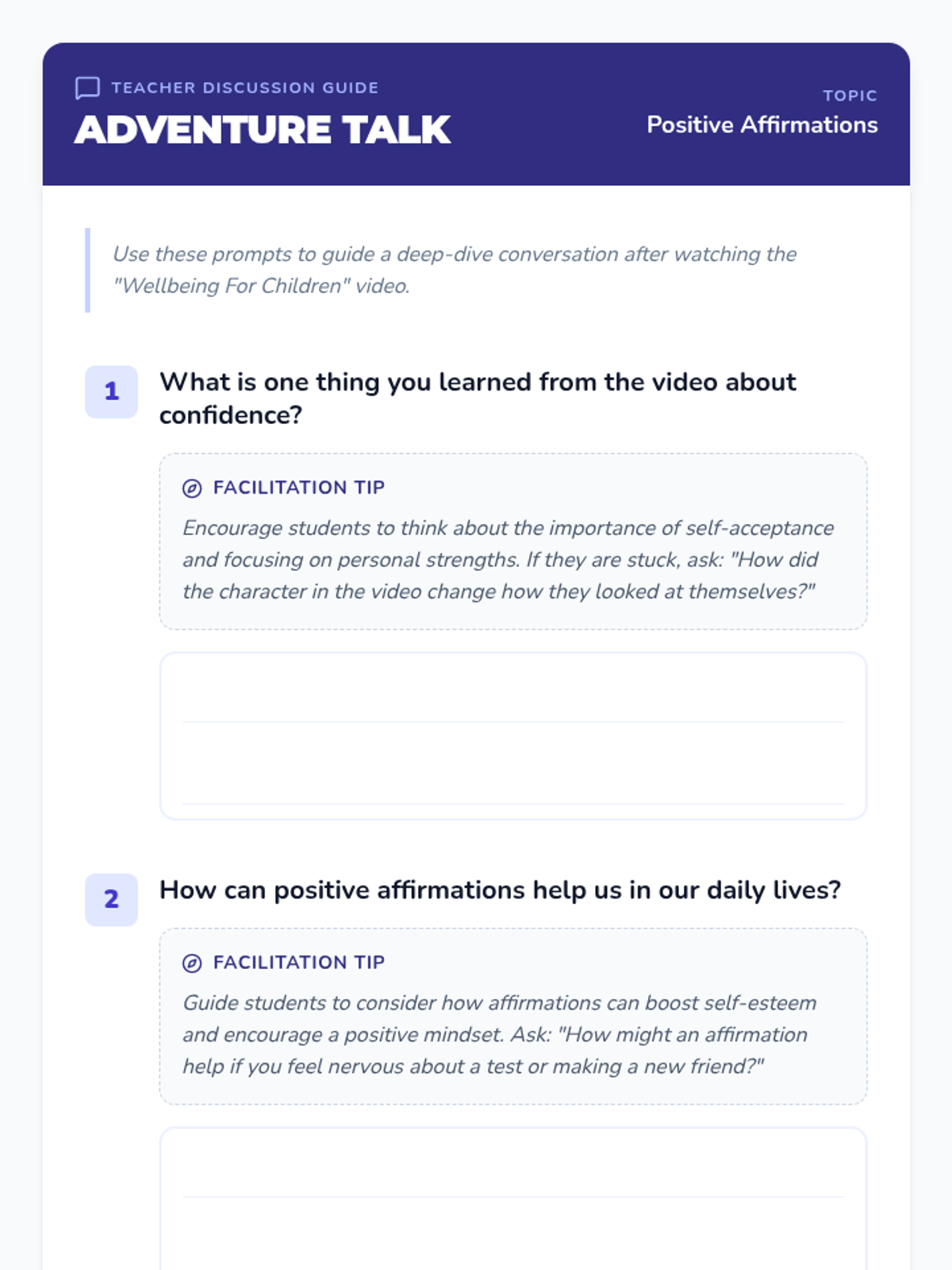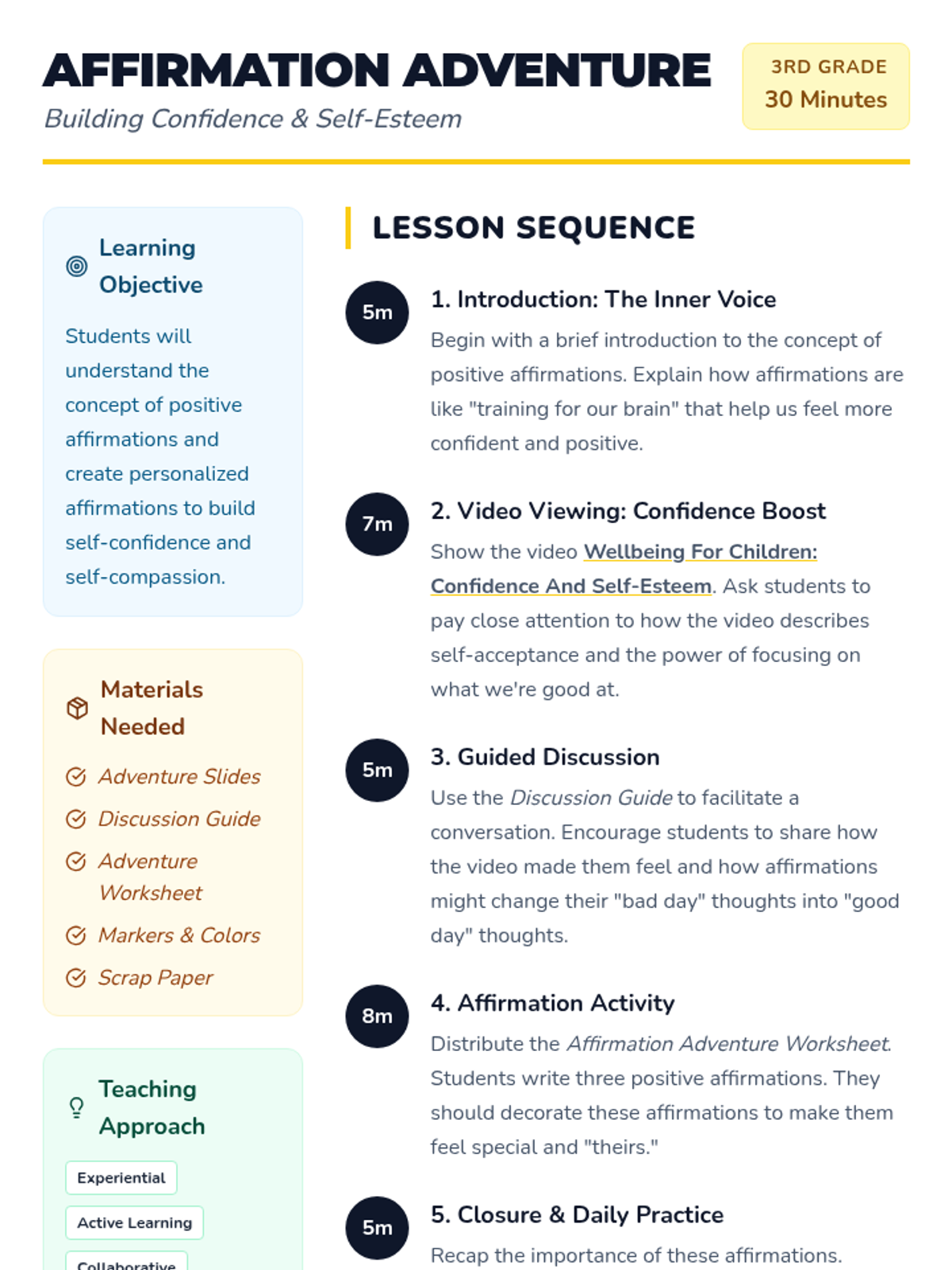 This lesson introduces third-grade students to the concept of positive affirmations, helping them build confidence and self-esteem. Students will learn to recognize their strengths and practice self-compassion through video, discussion, and creative activities.