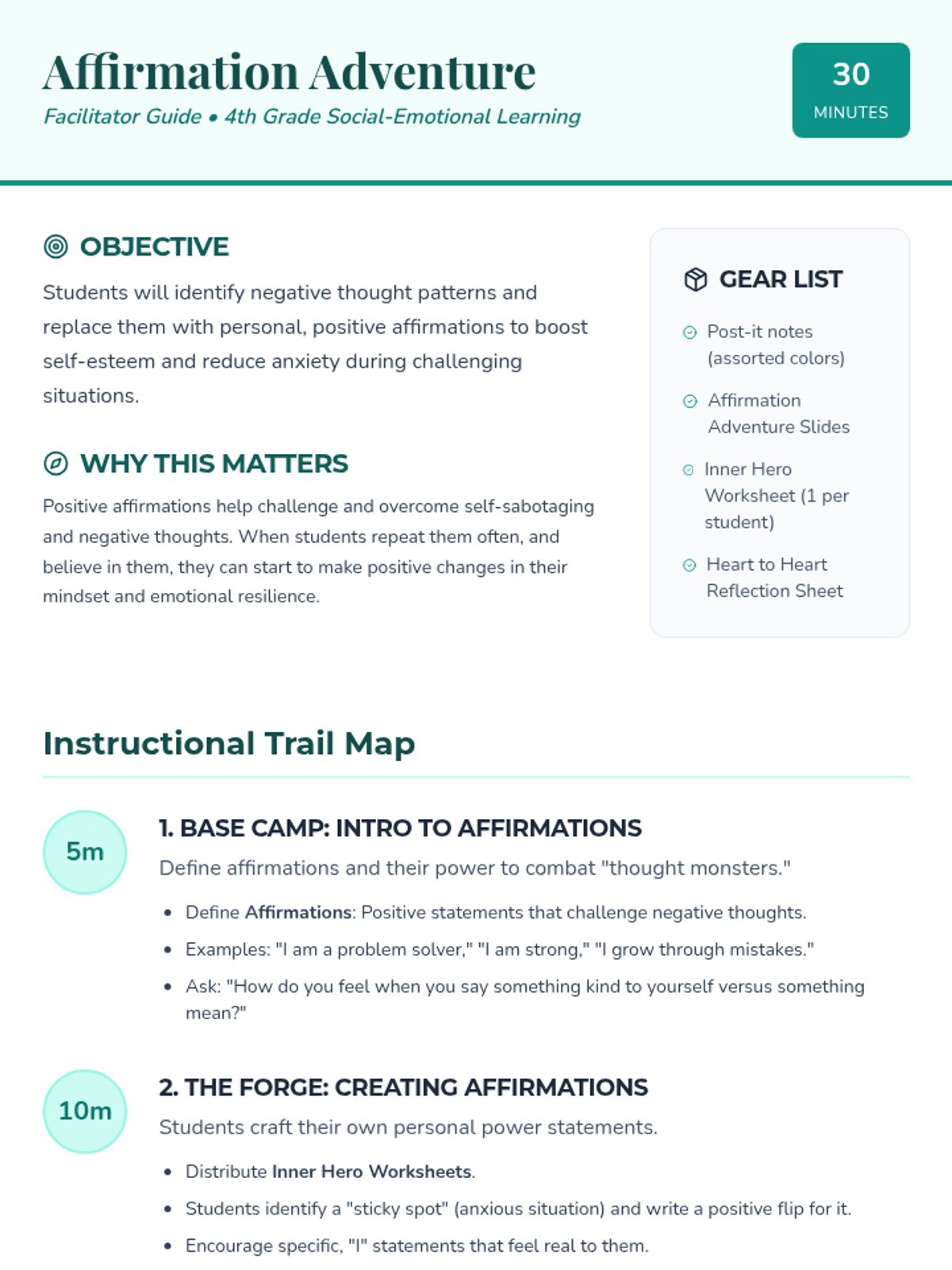 A 30-minute lesson for 4th graders to discover the power of positive affirmations, build self-esteem, and manage anxiety through creative writing and peer sharing.