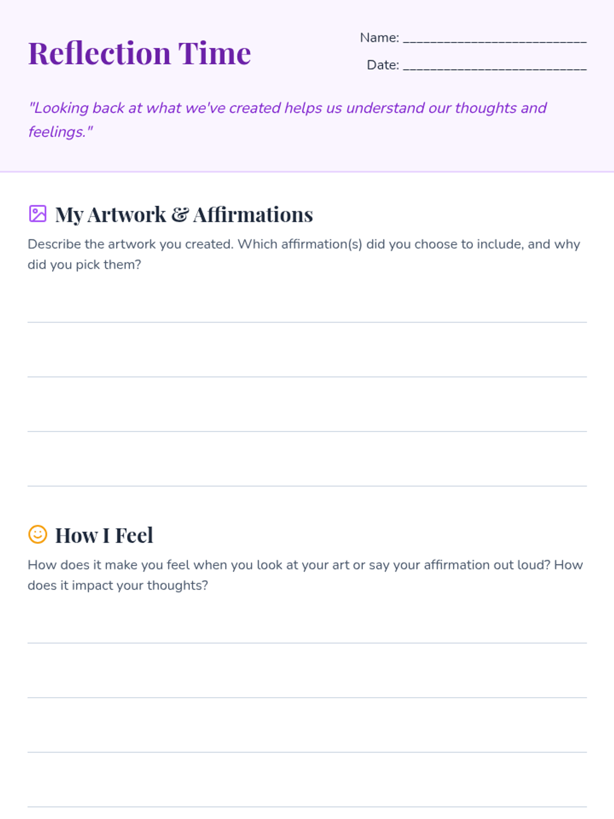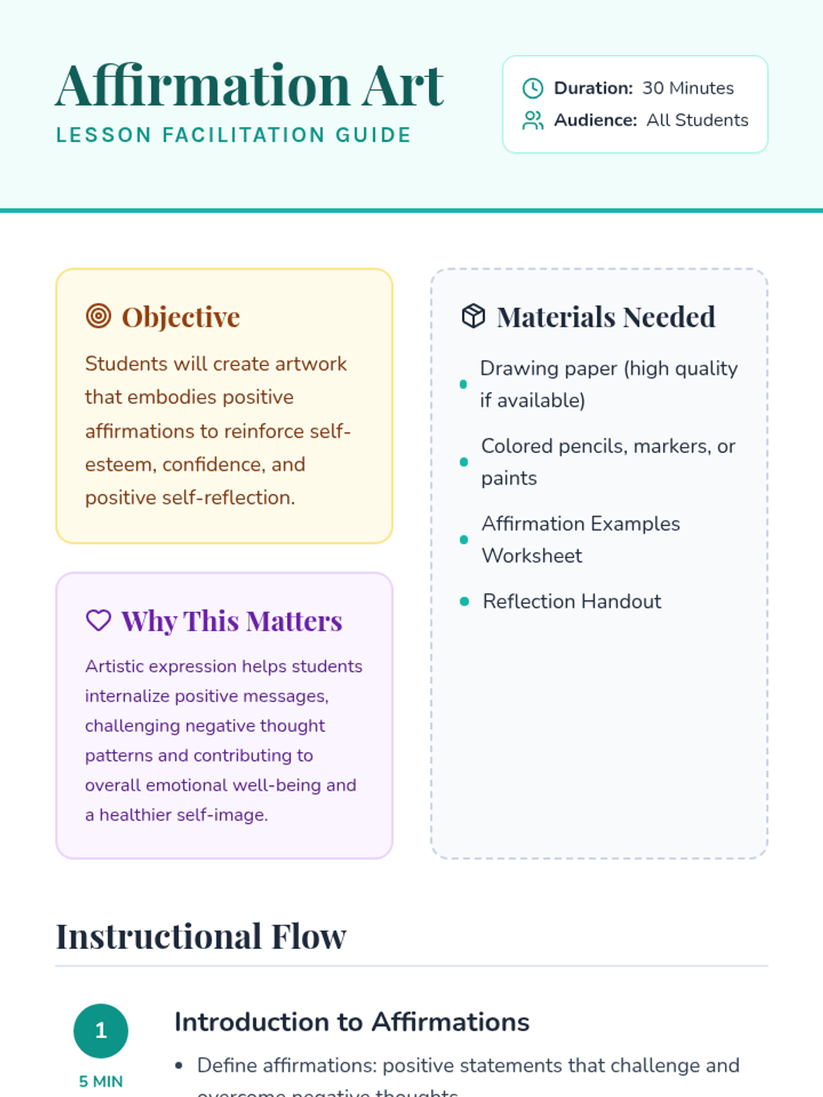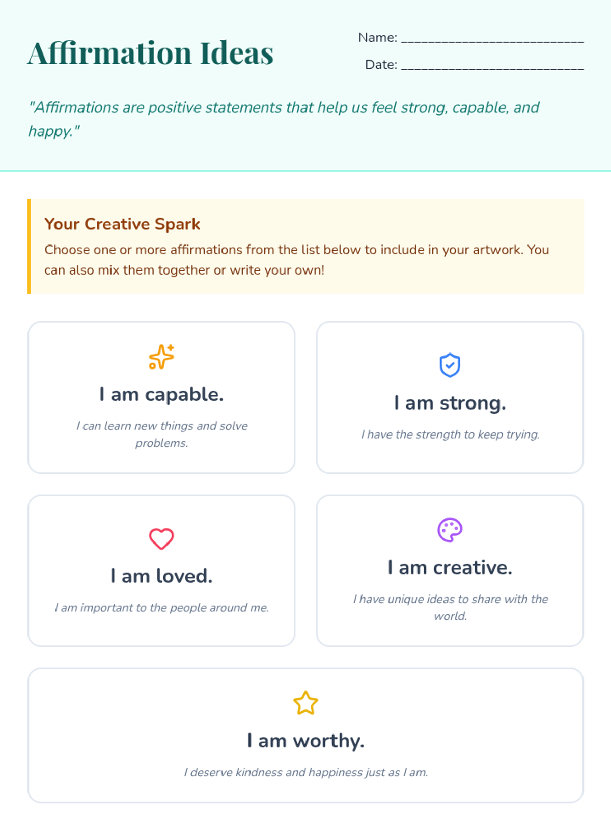 A creative lesson where students explore self-esteem and confidence by creating artwork based on positive affirmations, fostering a positive self-image and emotional well-being.