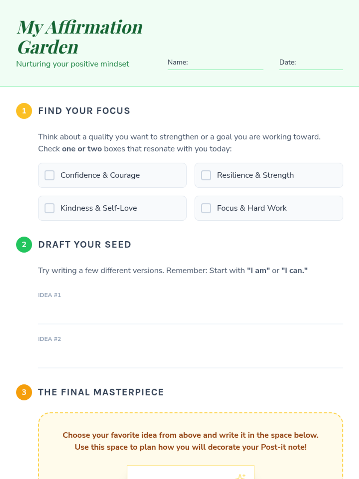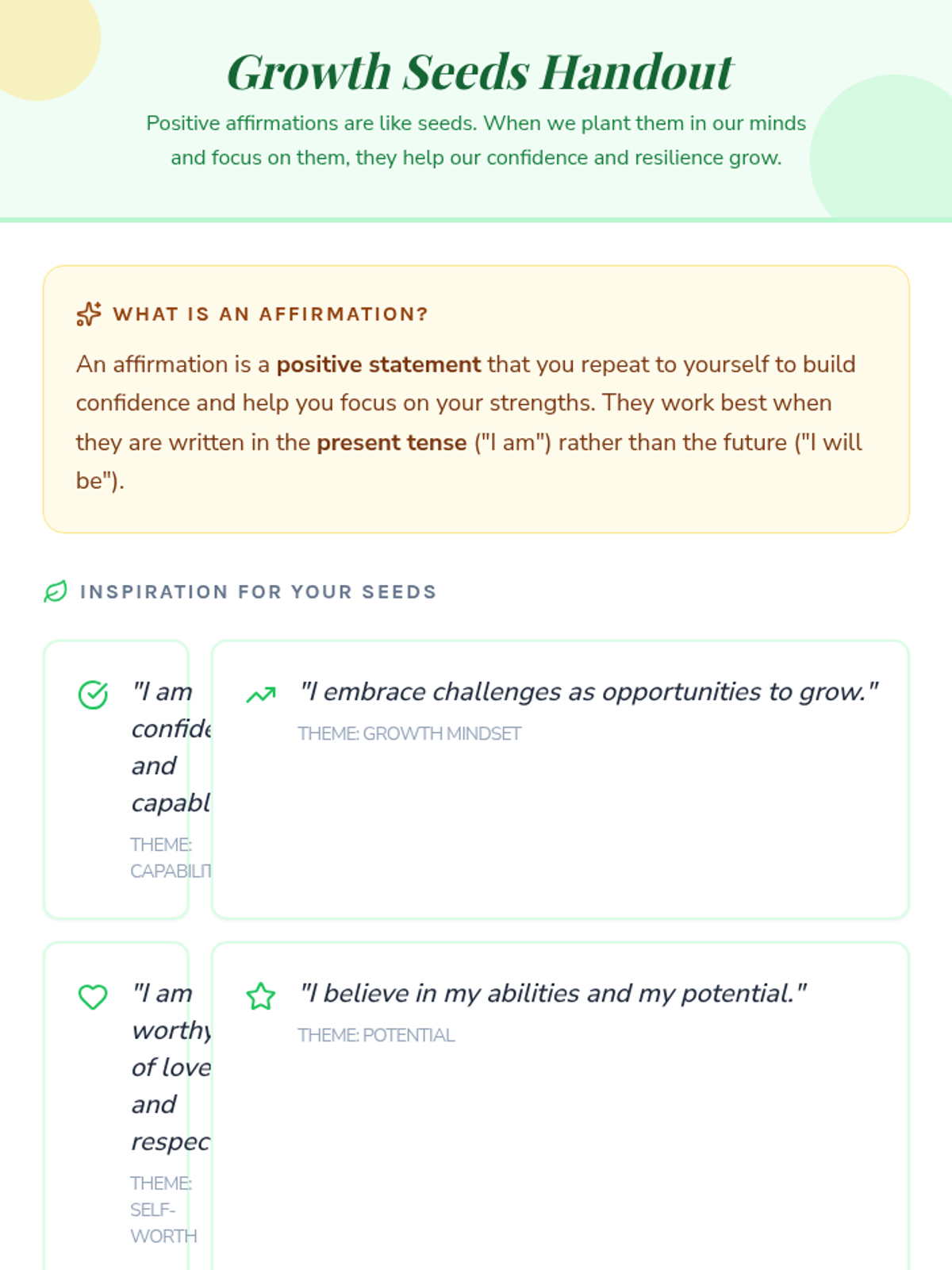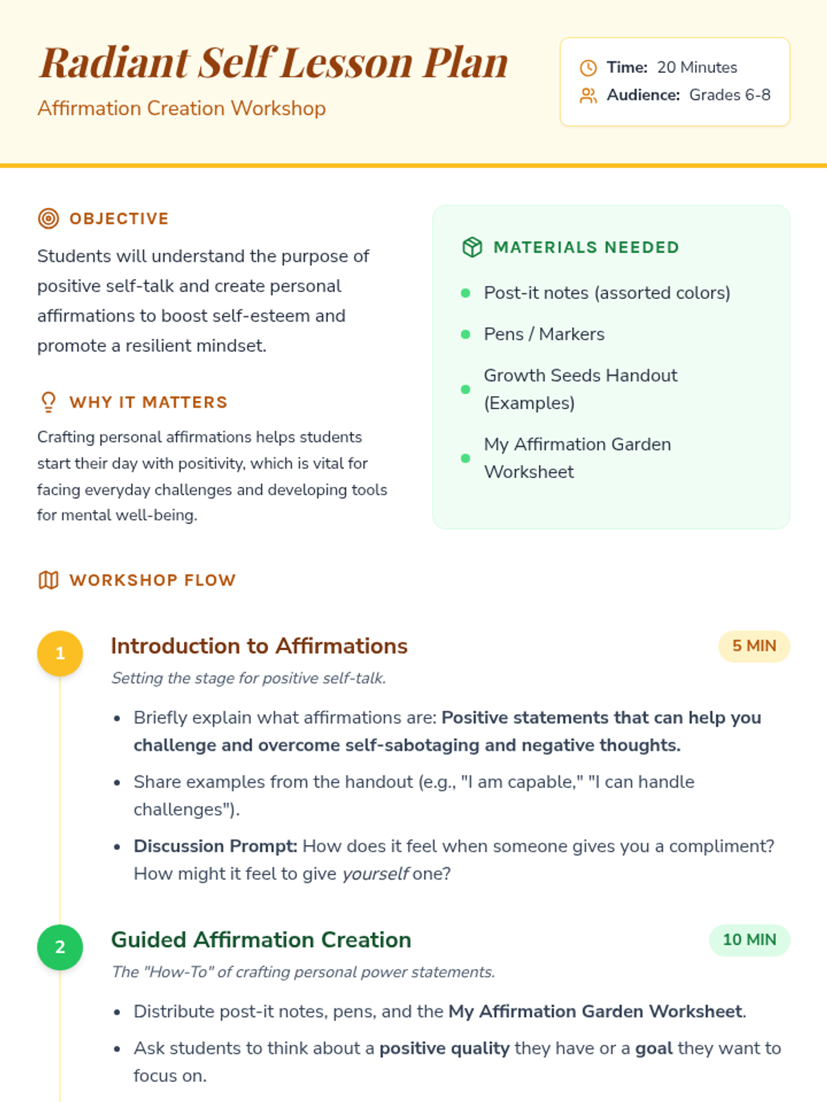 A 20-minute workshop designed for middle school students to explore the power of positive self-talk and craft their own personal affirmations to build resilience and self-esteem.