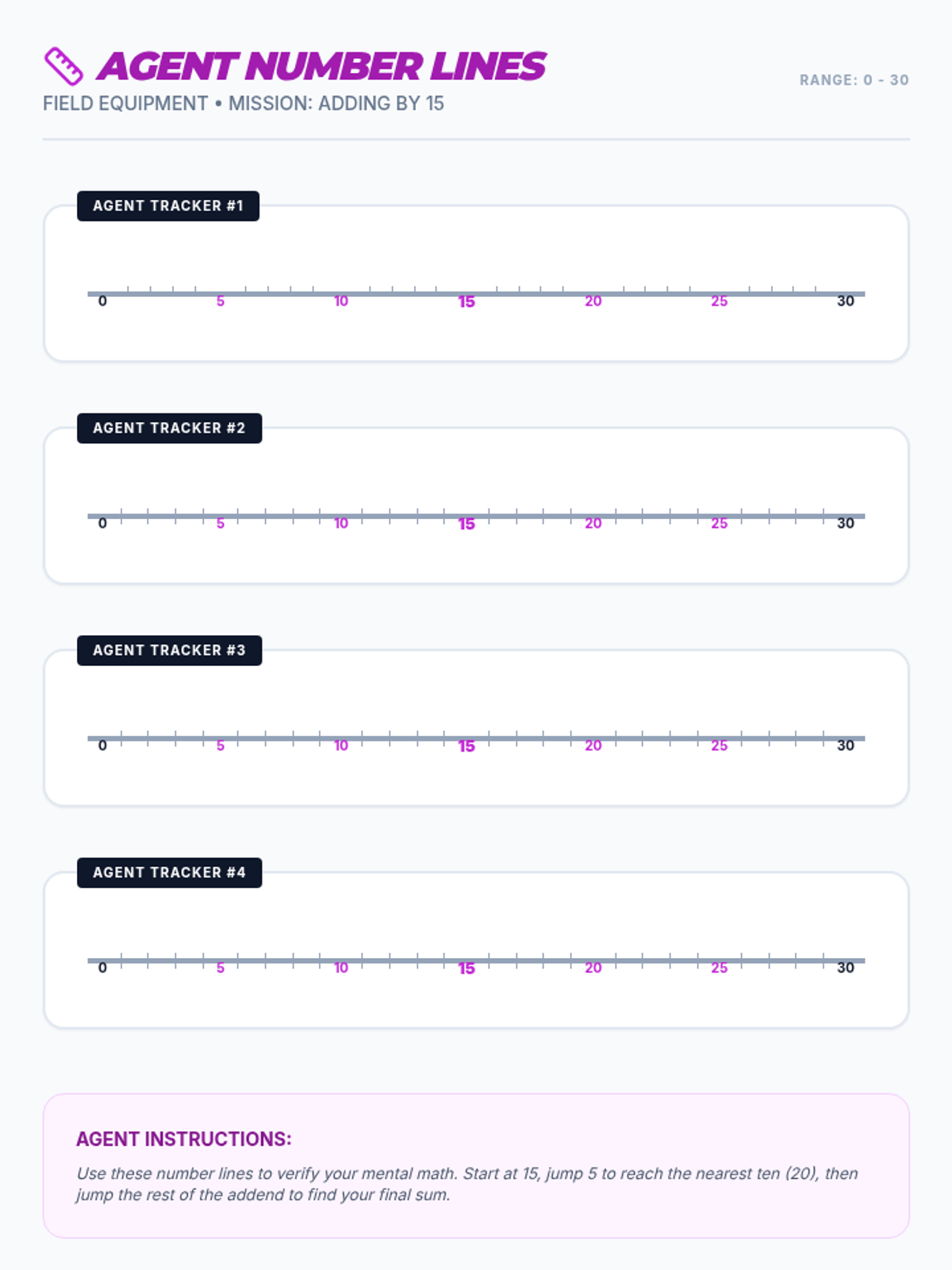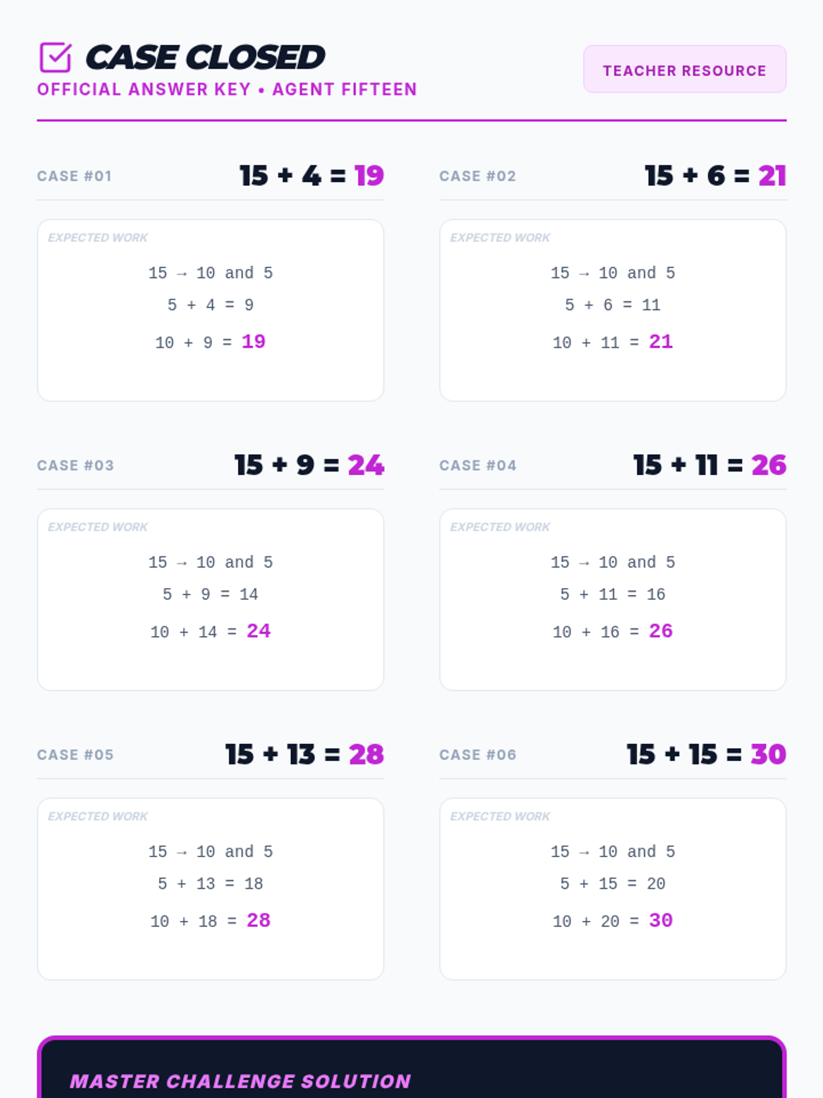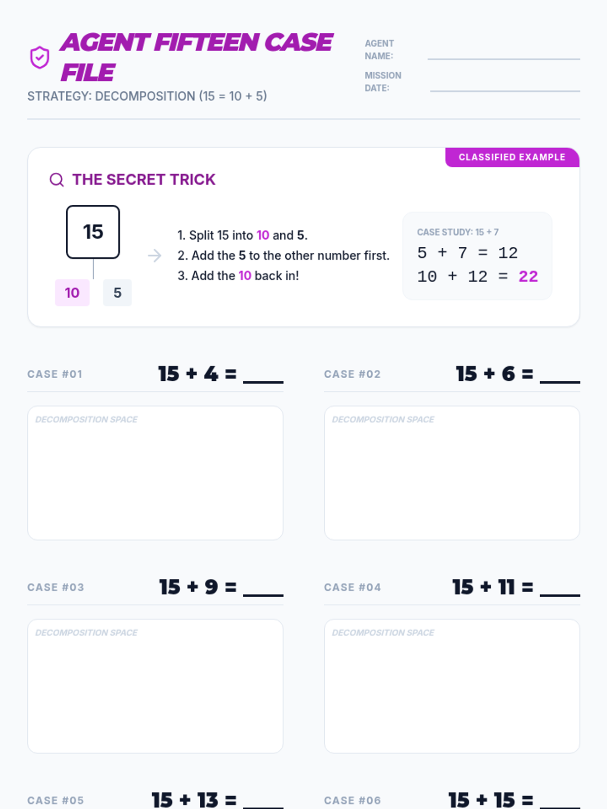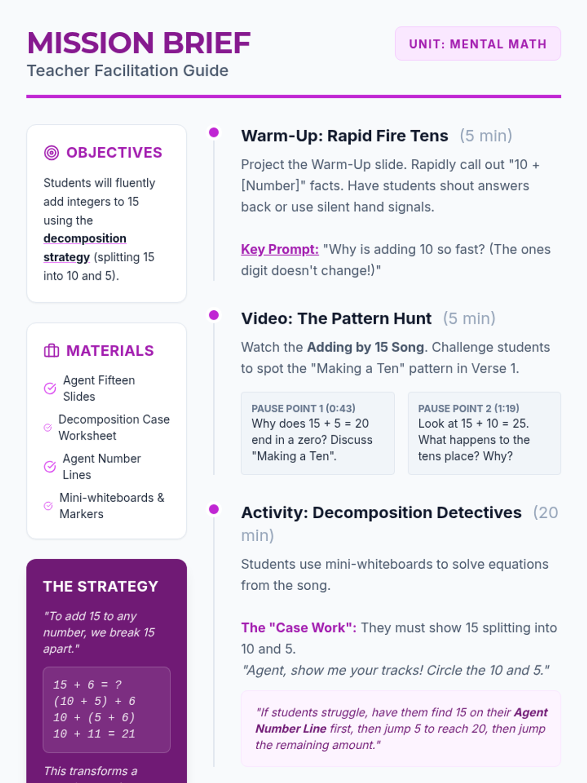 A high-energy math lesson where 2nd-grade 'agents' use the power of decomposition (15 = 10 + 5) to master mental addition facts to 30. Includes a rhythmic video, guided practice slides, and a detective-themed activity sheet.