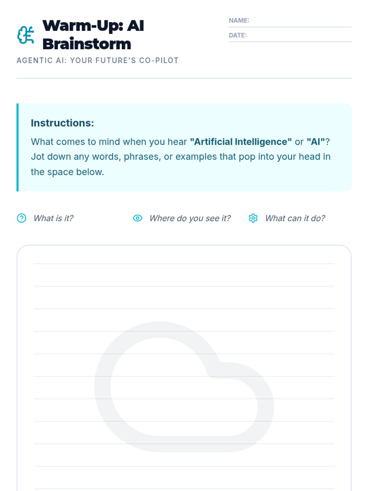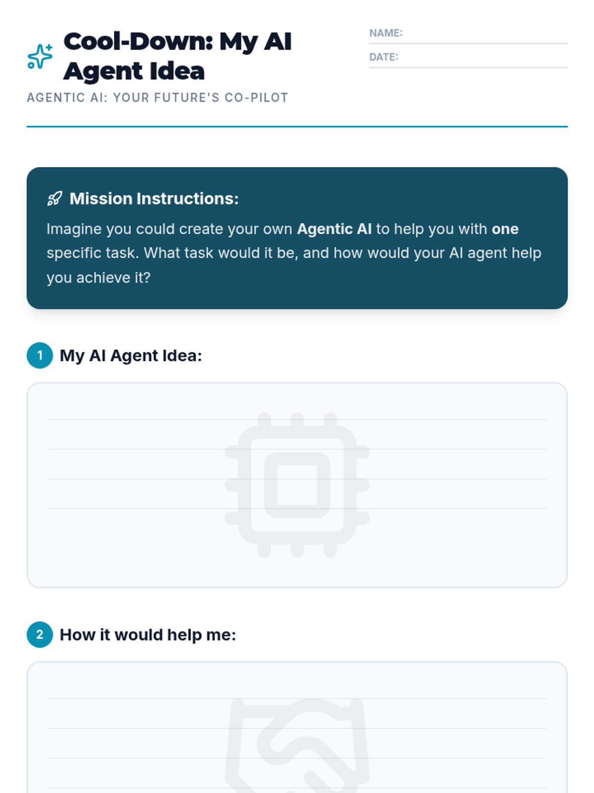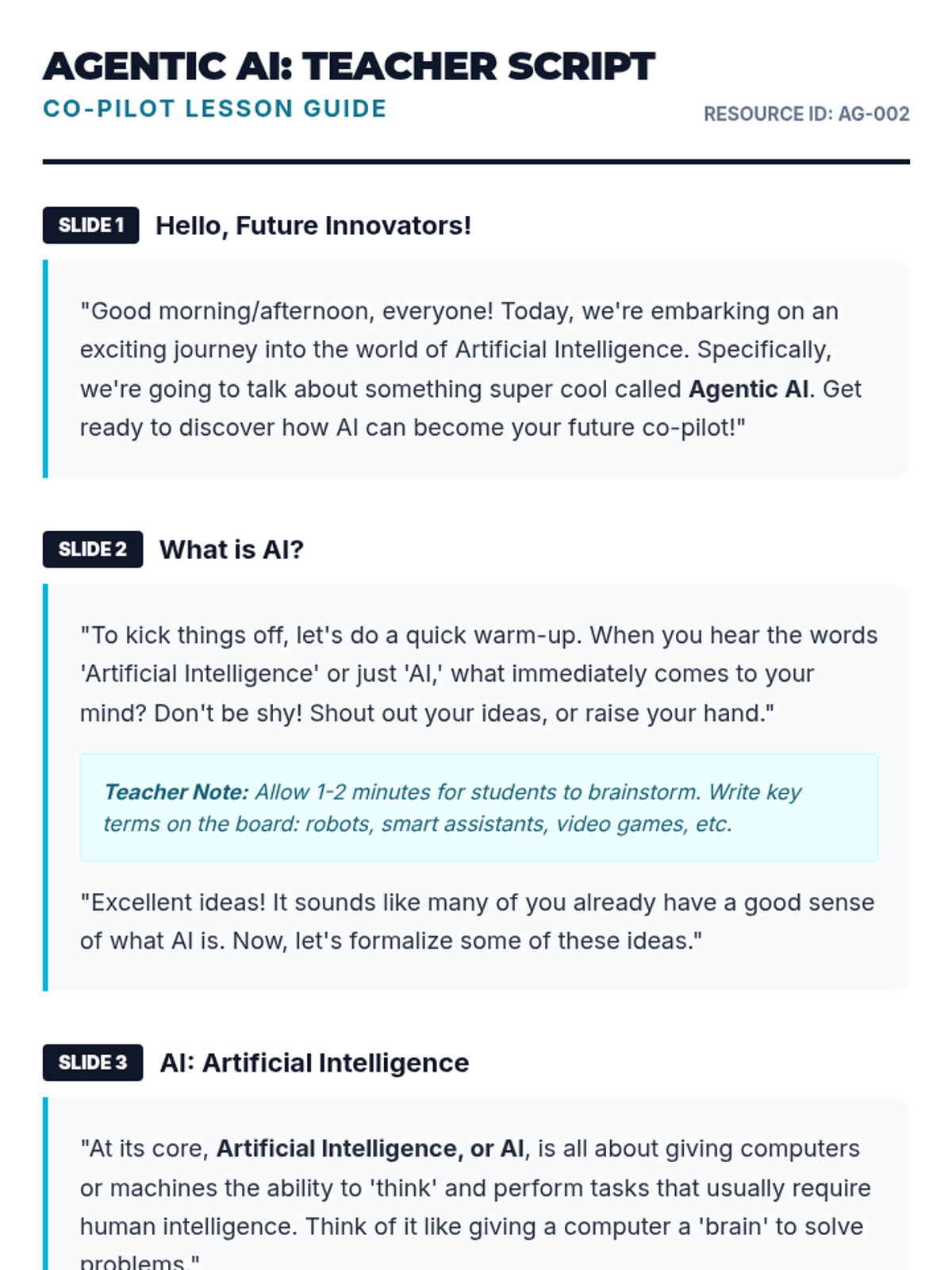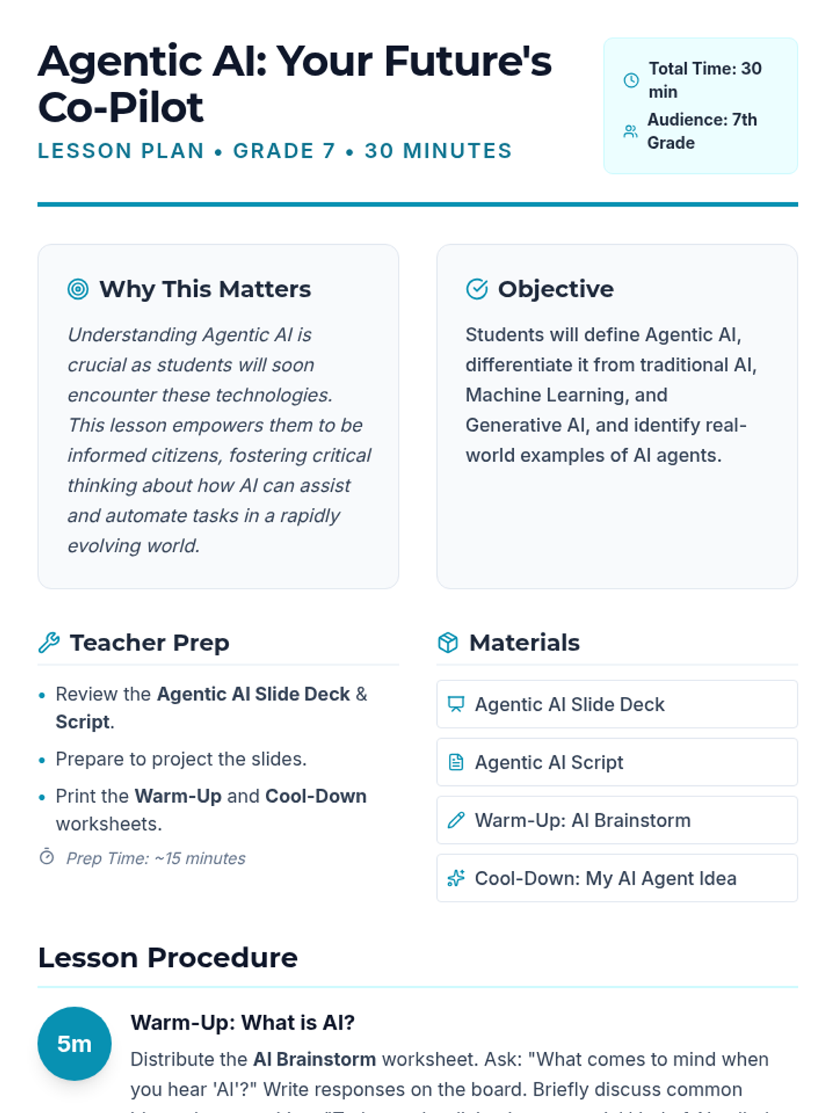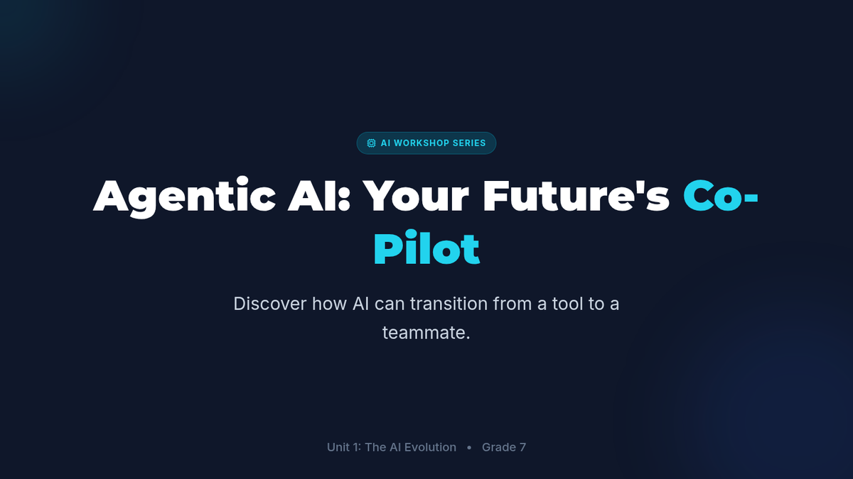 A 30-minute introductory lesson for 7th-grade students on Agentic AI, exploring how AI agents work as goal-oriented co-pilots and how they differ from traditional AI, ML, and Gen AI.