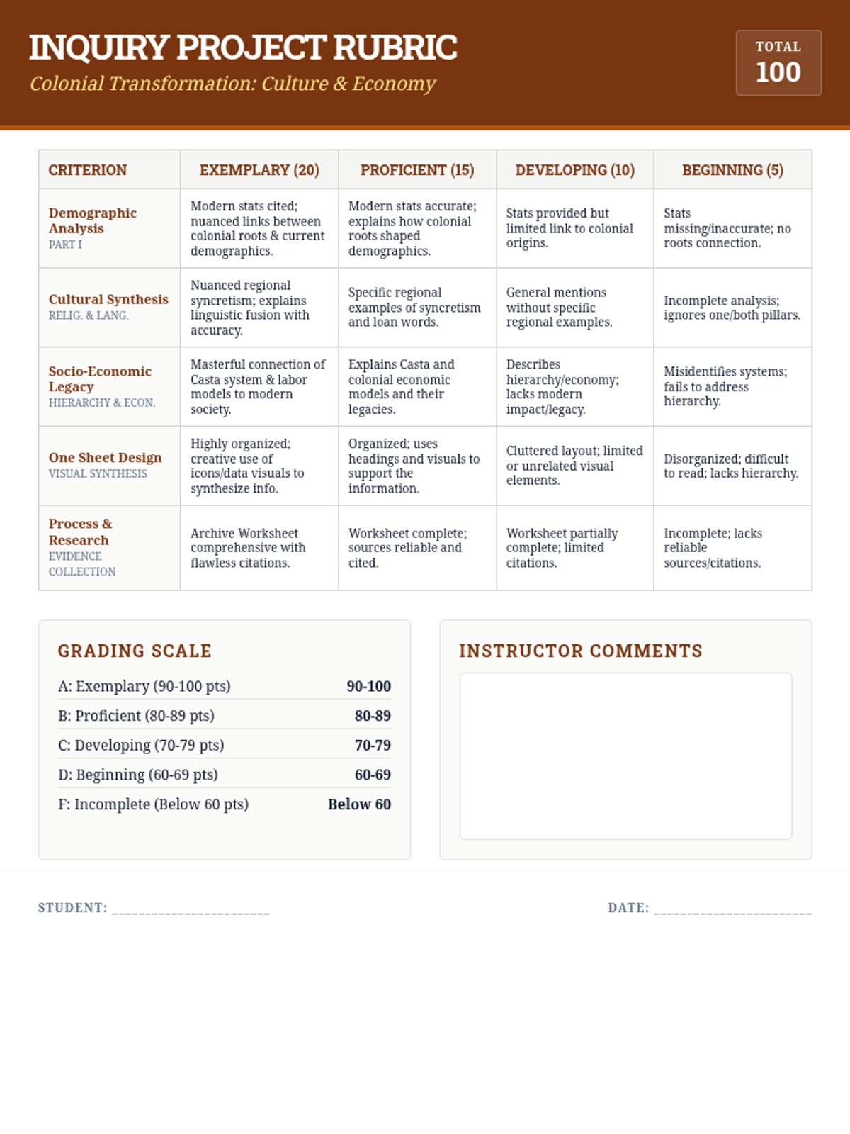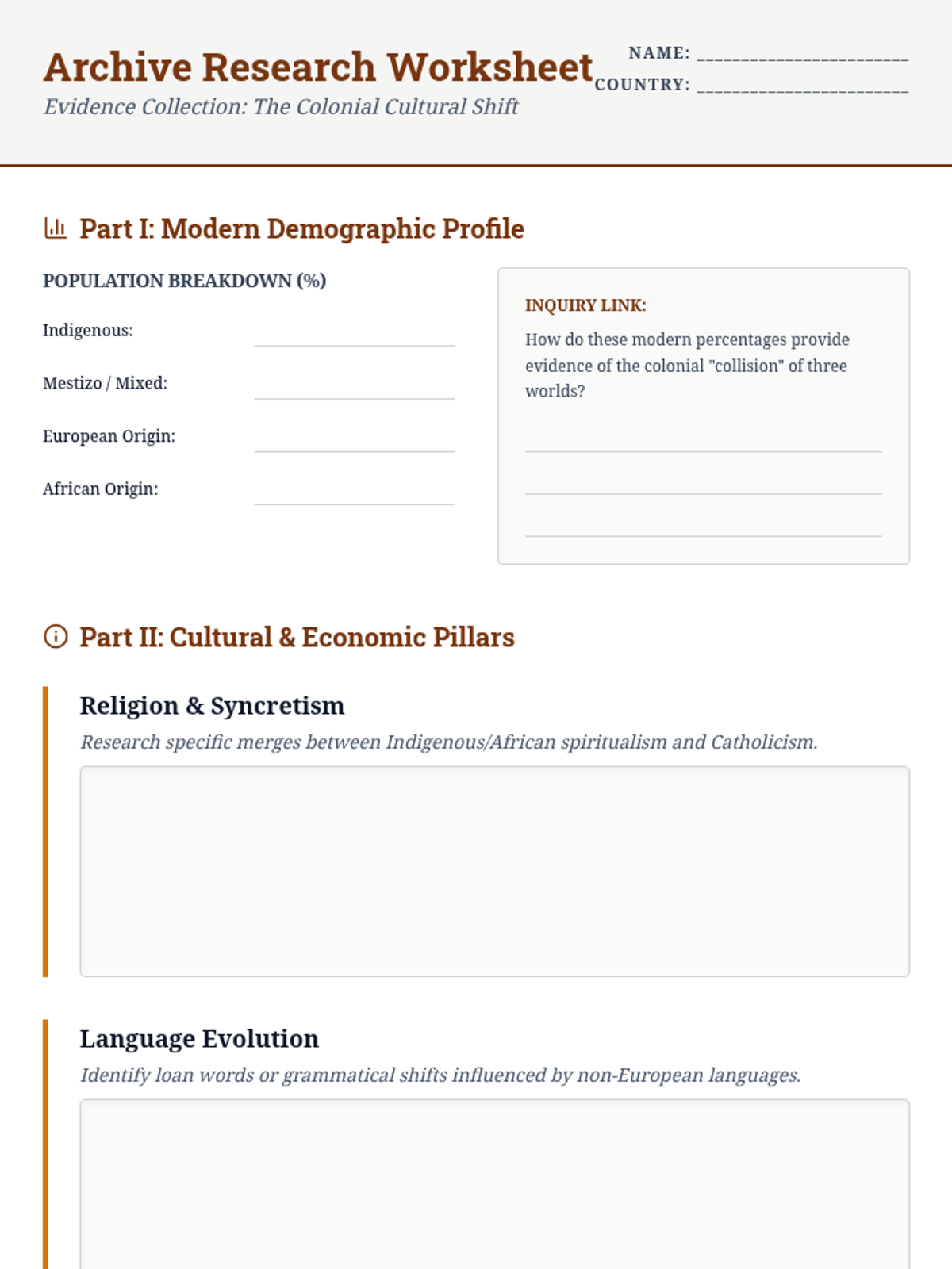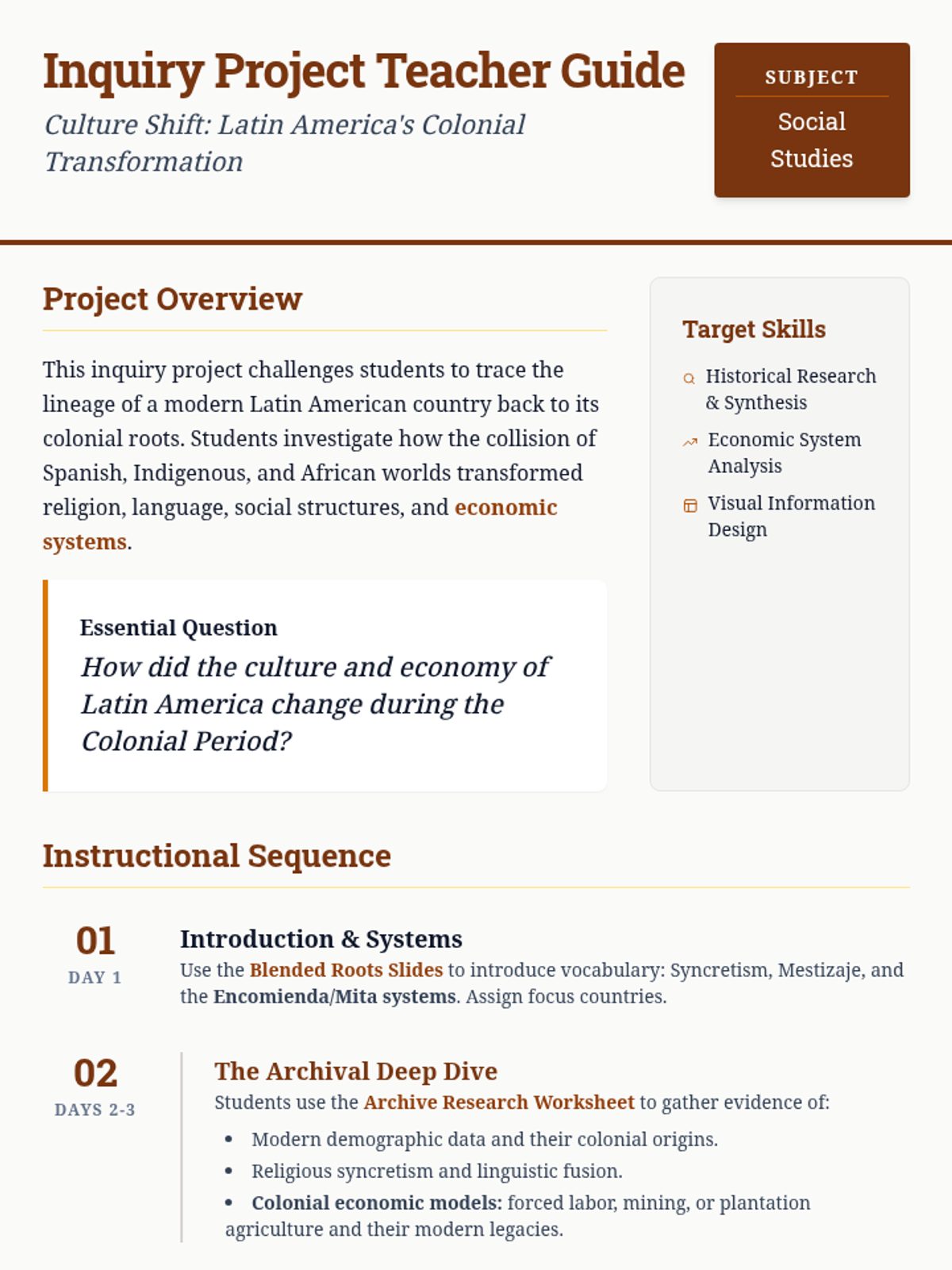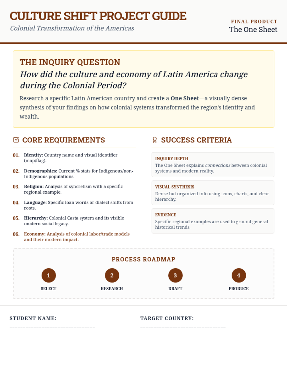 An inquiry-based project where students research the cultural transformation of a Latin American country during the colonial era, focusing on the blending of Spanish, Indigenous, and African influences in religion, language, and social structures.