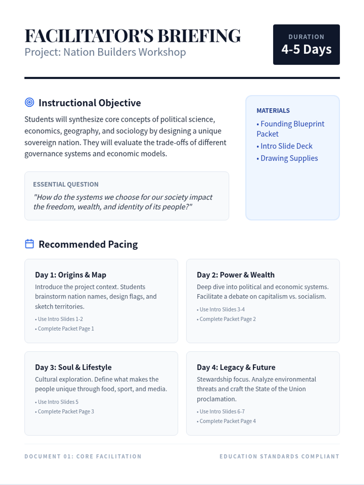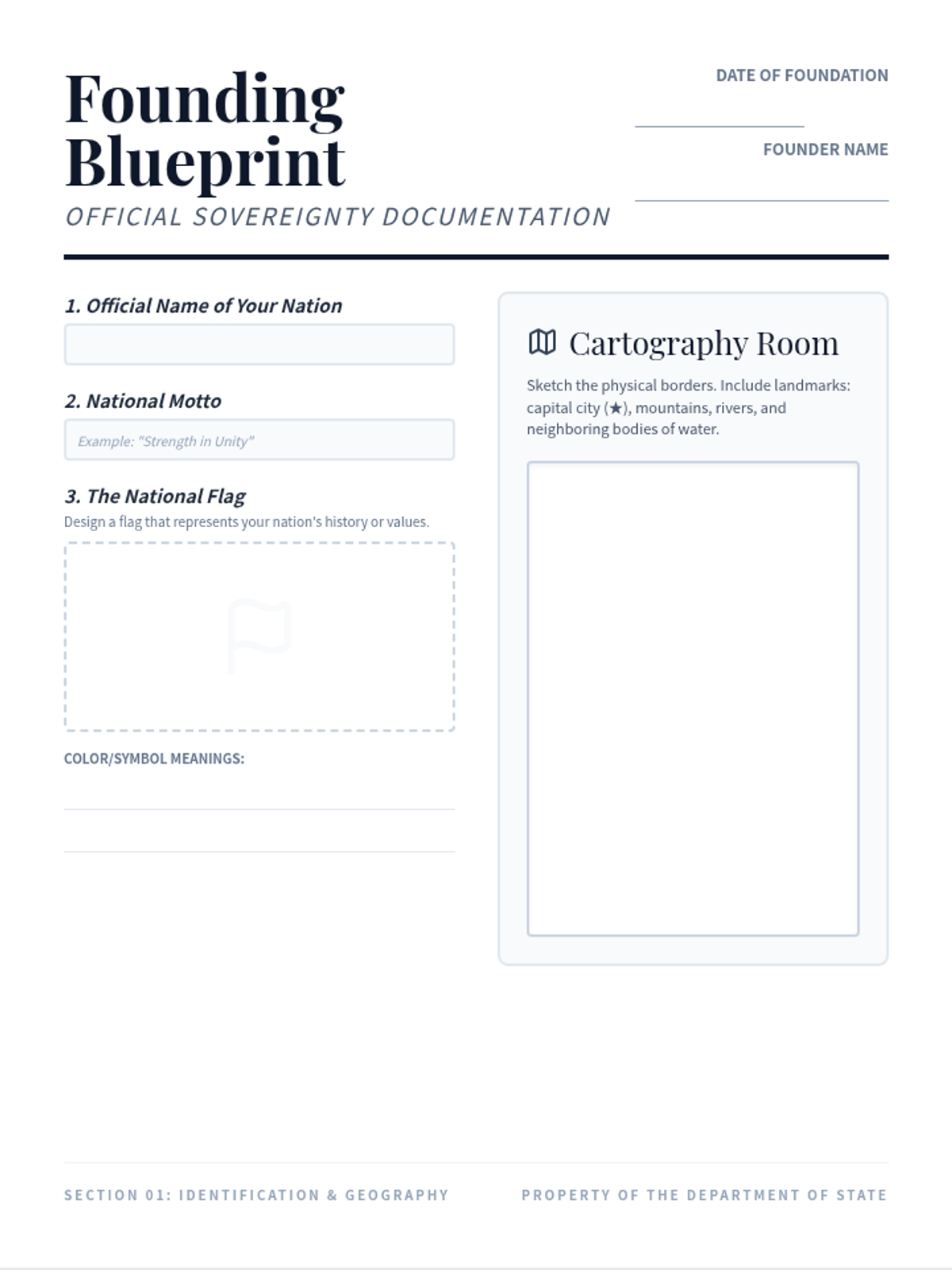An immersive project-based lesson where students step into the role of national founders. They will synthesize concepts of geography, political science, economics, and environmental stewardship to build a functioning society from the ground up.