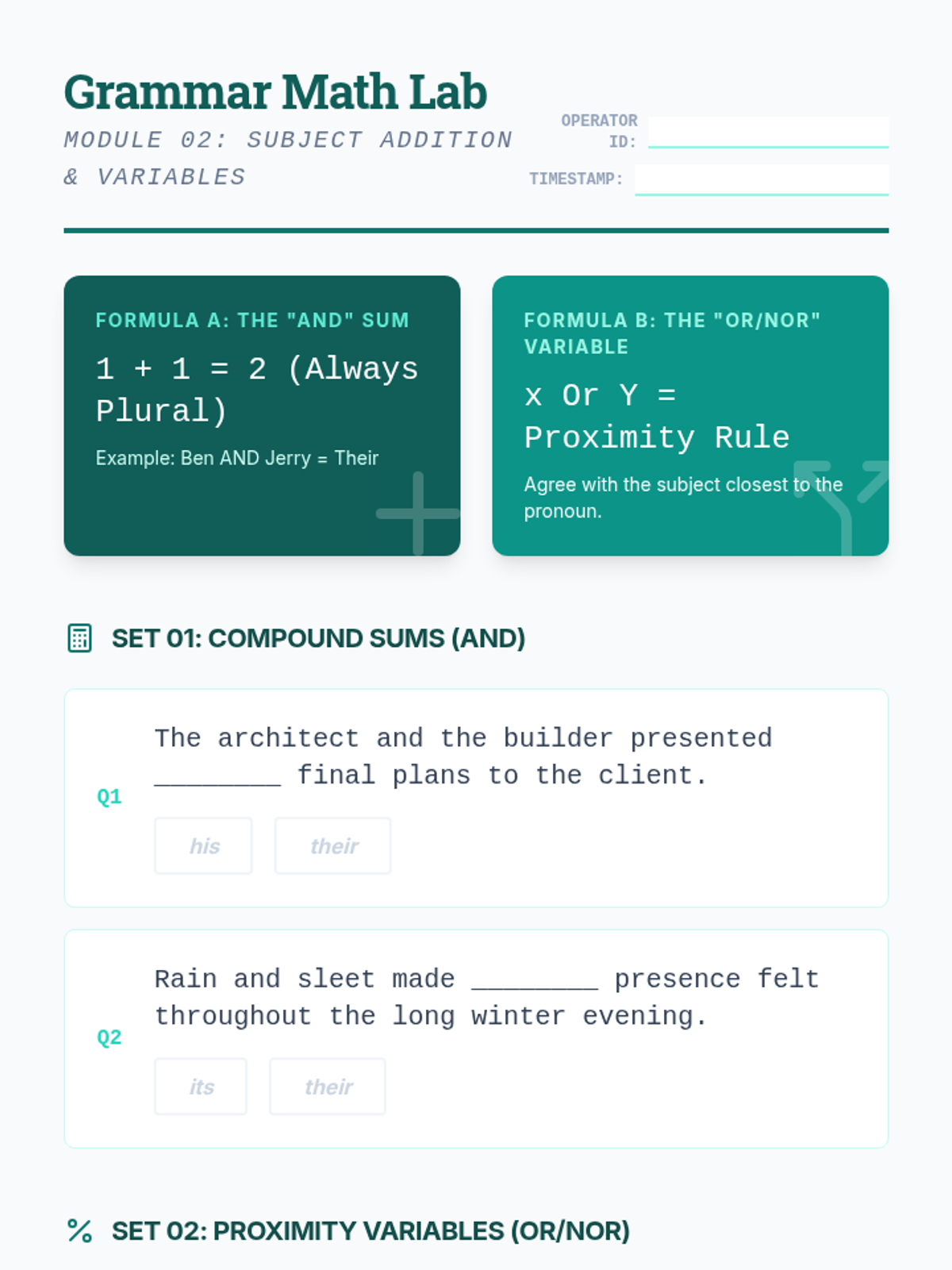 Focuses on singular and plural agreement, with a deep dive into compound subjects joined by 'and', 'or', and 'nor'.