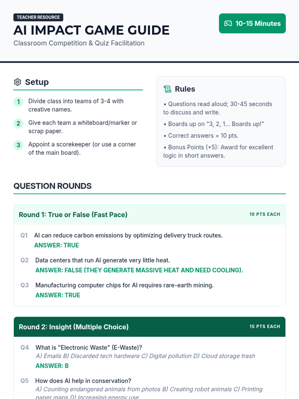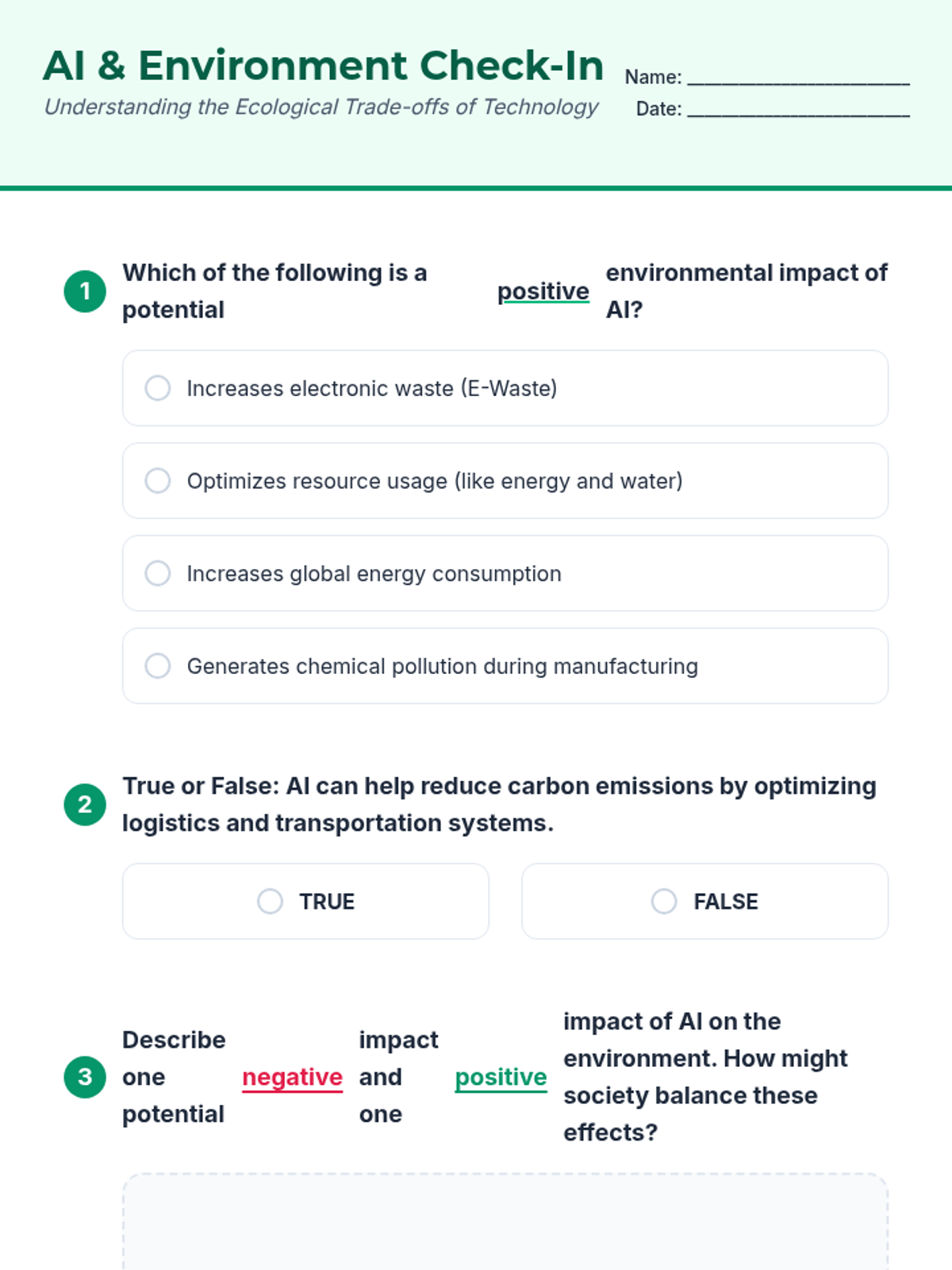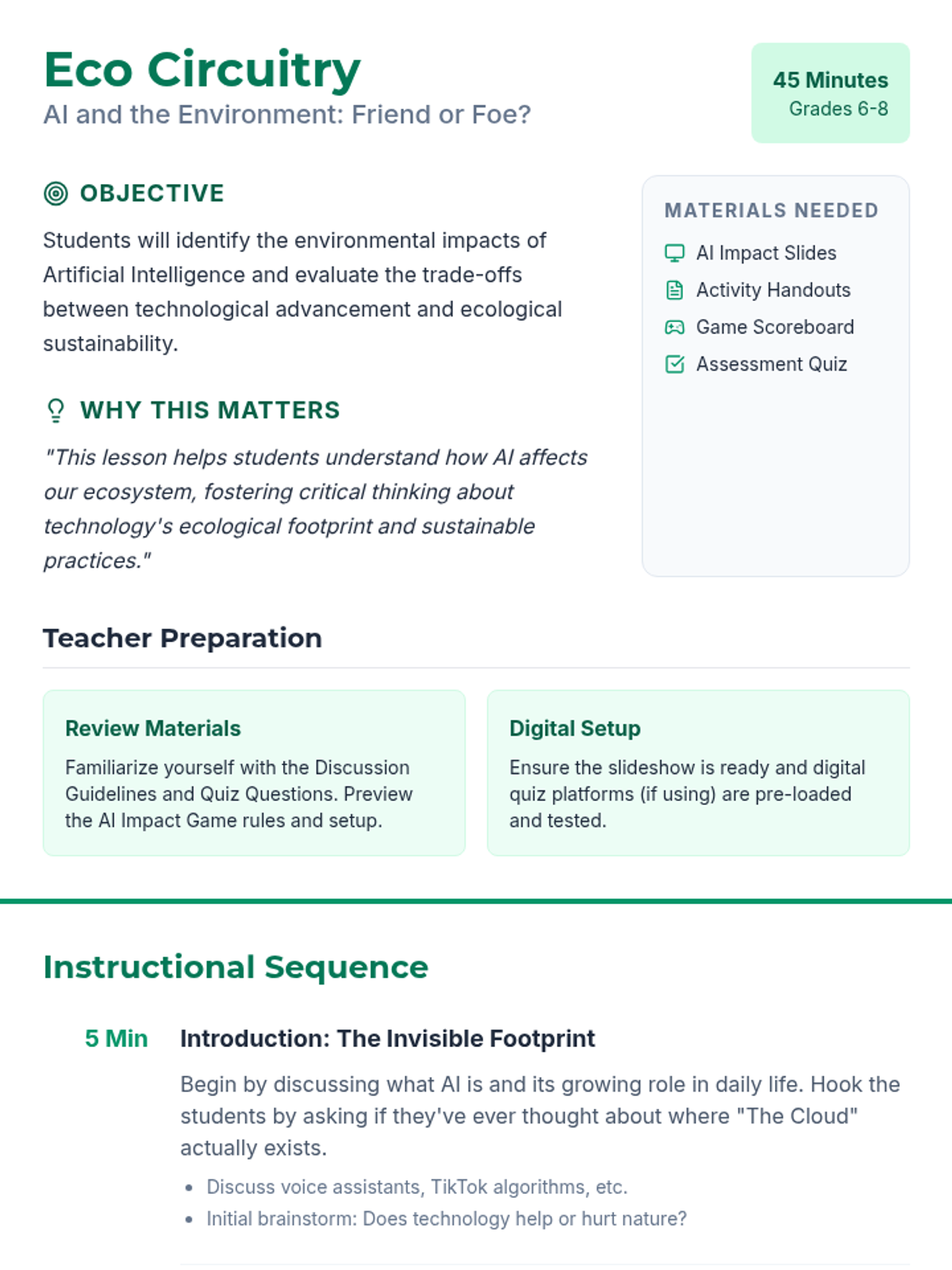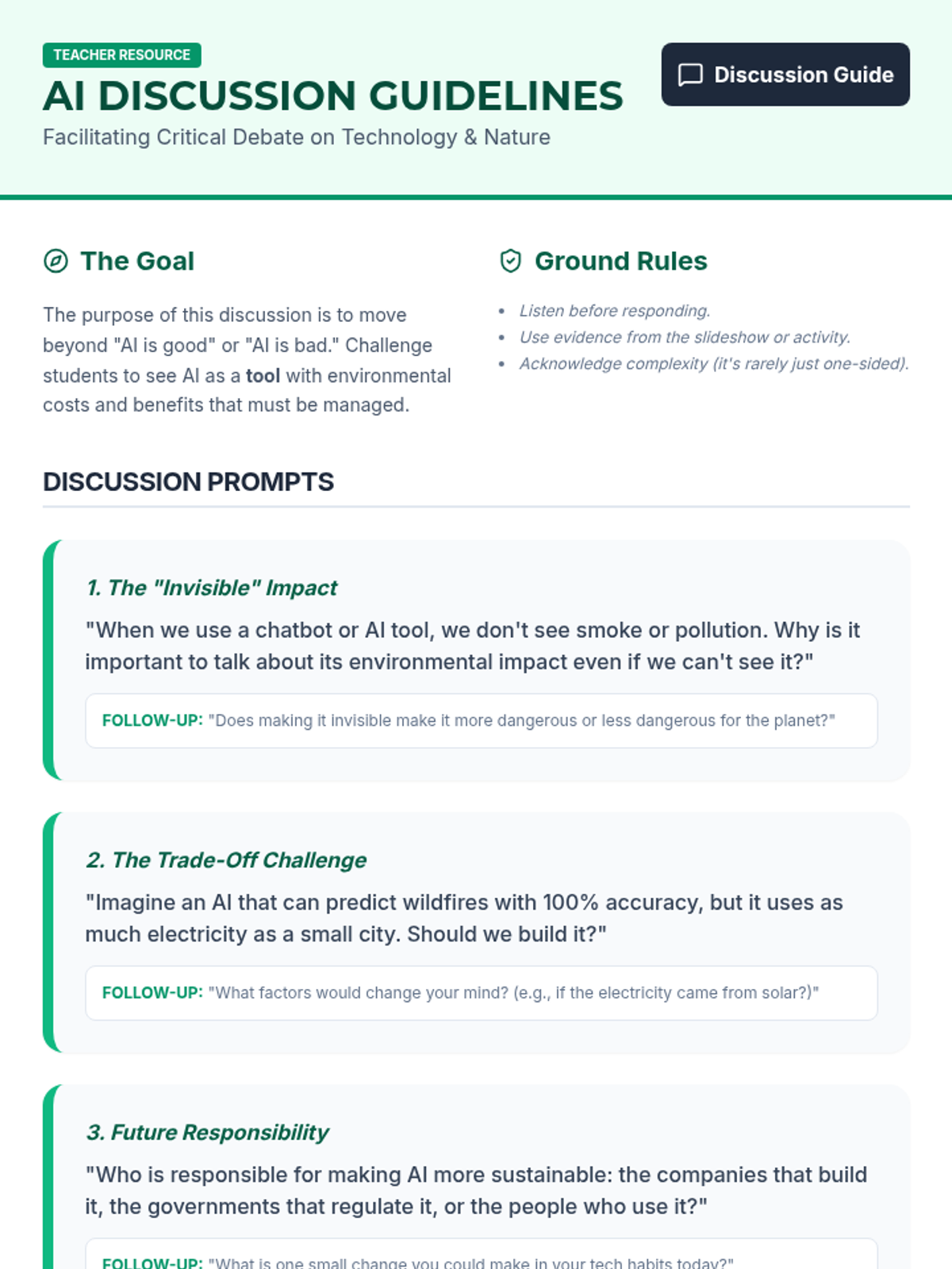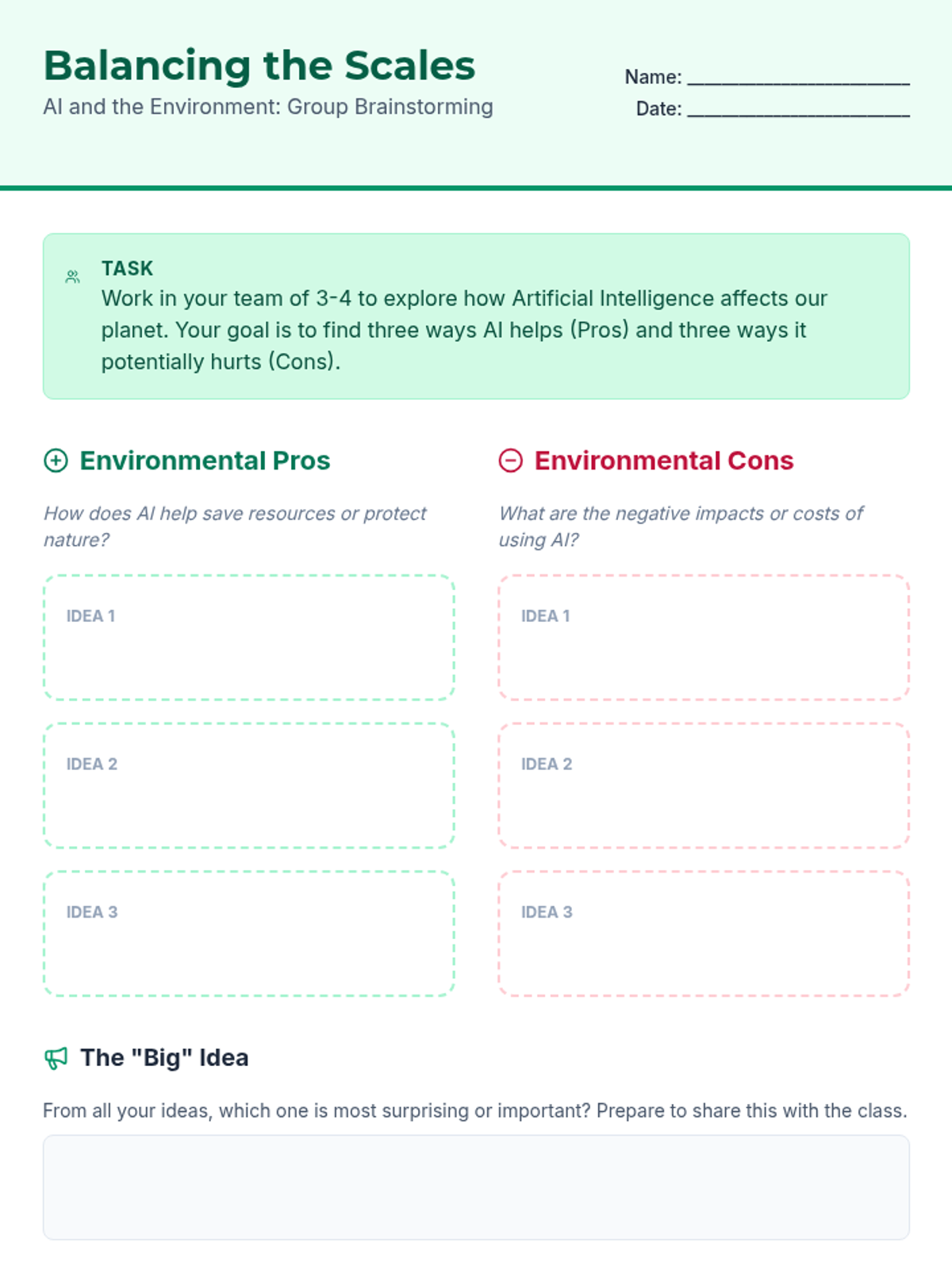 Students explore the environmental impacts of Artificial Intelligence, weighing the pros and cons of AI usage to foster critical thinking about technology's ecological footprint and sustainable practices.