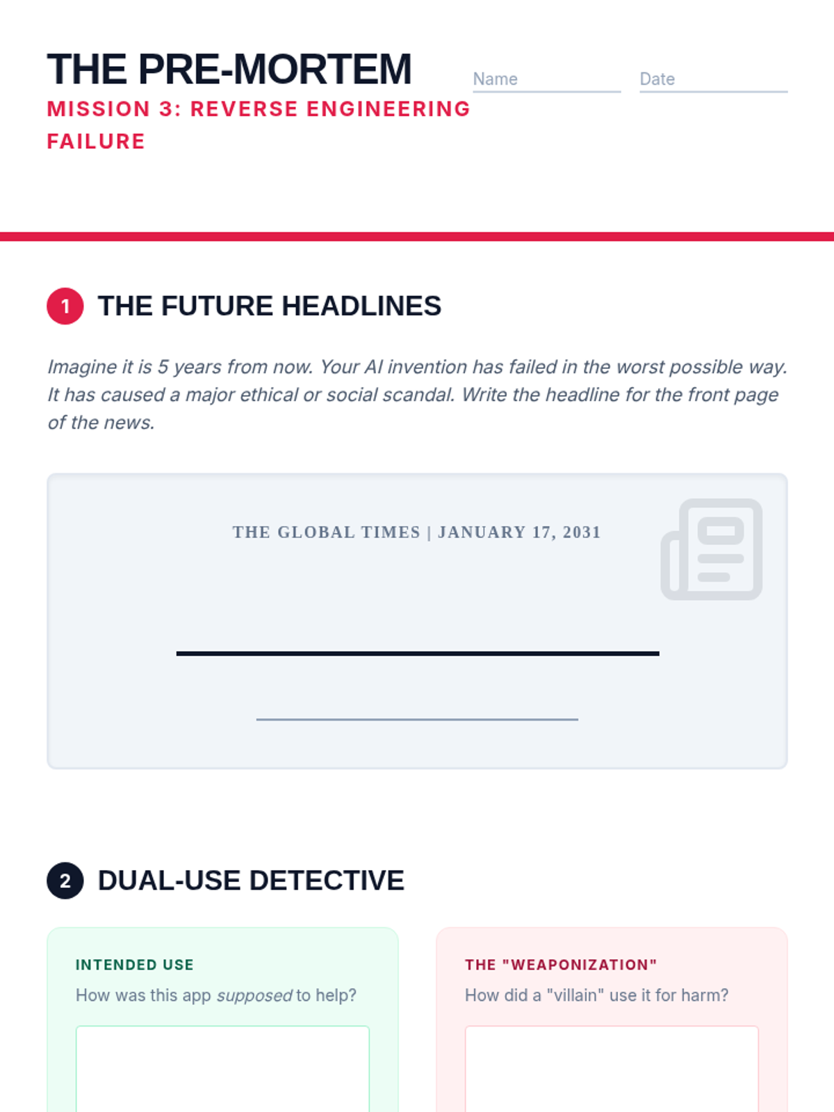 Students conduct a 'Pre-Mortem' exercise where they assume their project has failed ethically in the future, working backward to determine how their tool could be weaponized or misused.
