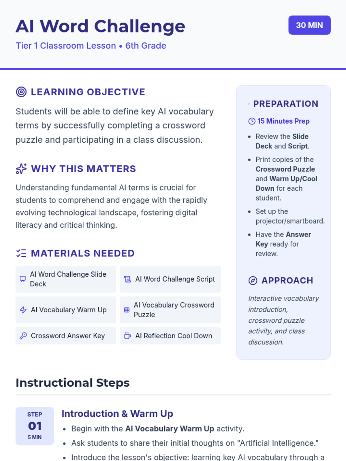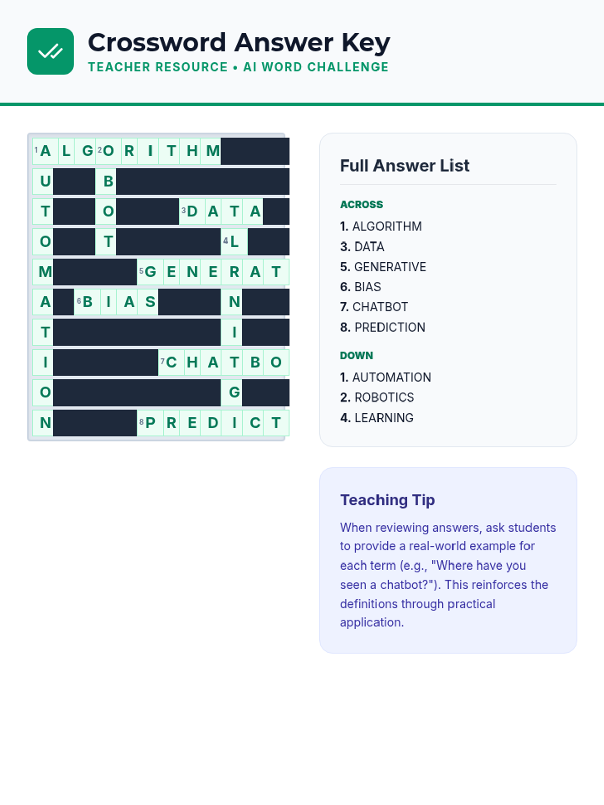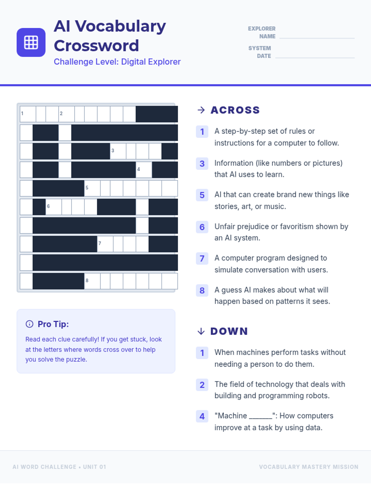 A 30-minute introductory lesson for 6th graders to learn fundamental artificial intelligence vocabulary through an engaging crossword challenge. Students explore key concepts like algorithms, data, and machine learning to build digital literacy.