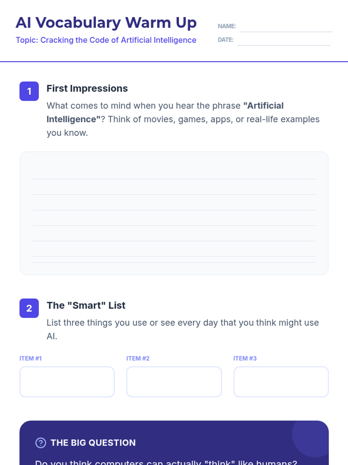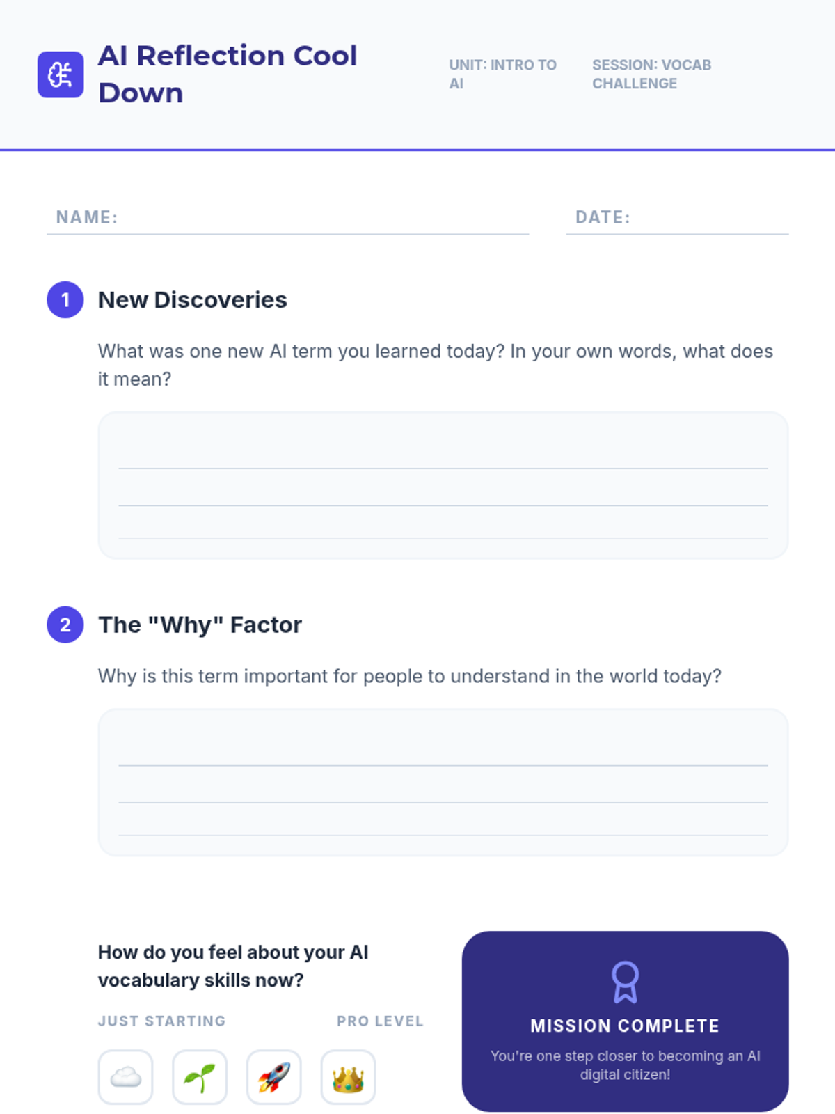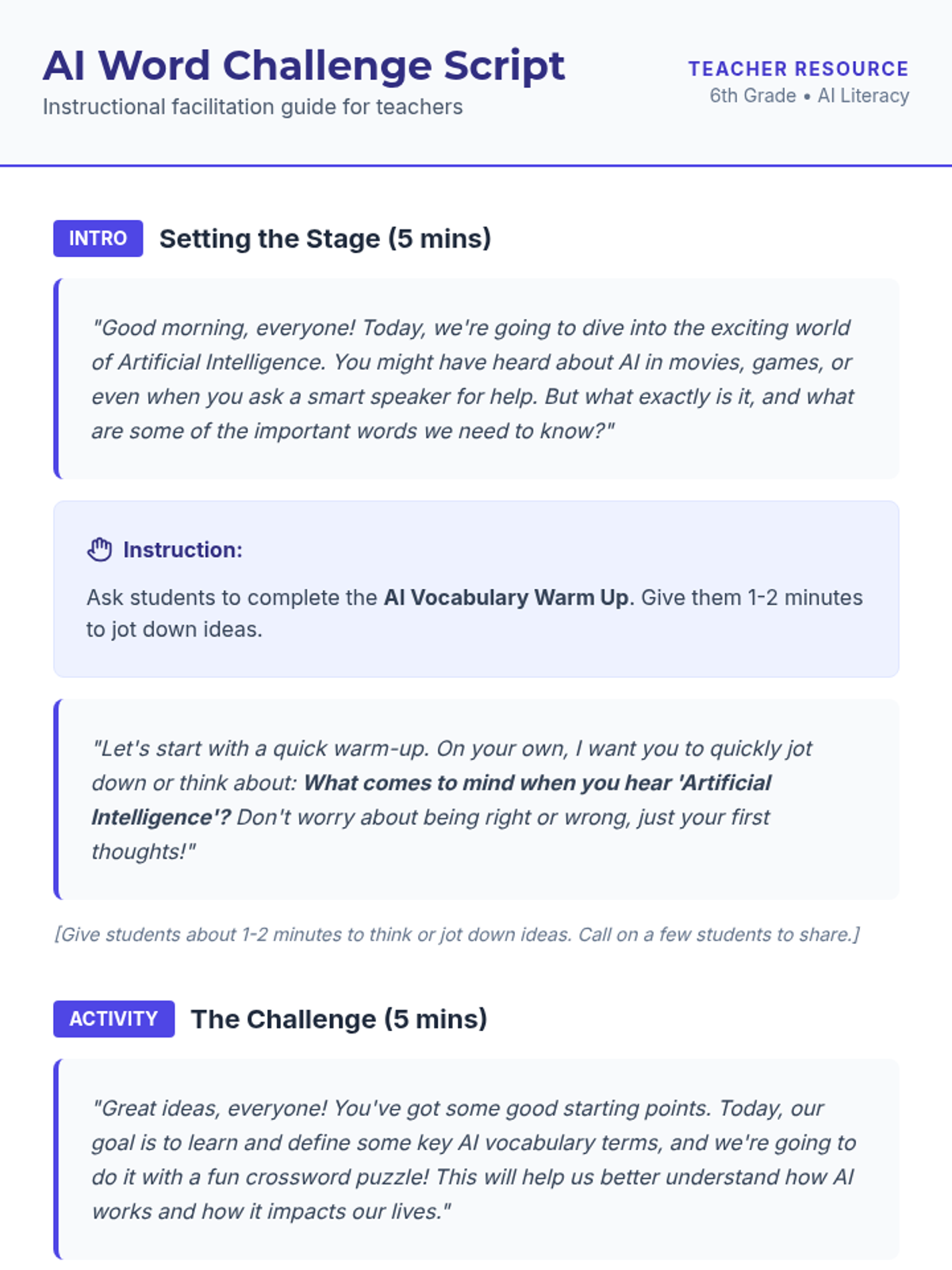 A 30-minute introductory lesson for 6th graders to learn fundamental artificial intelligence vocabulary through an engaging crossword challenge. Students explore key concepts like algorithms, data, and machine learning to build digital literacy.