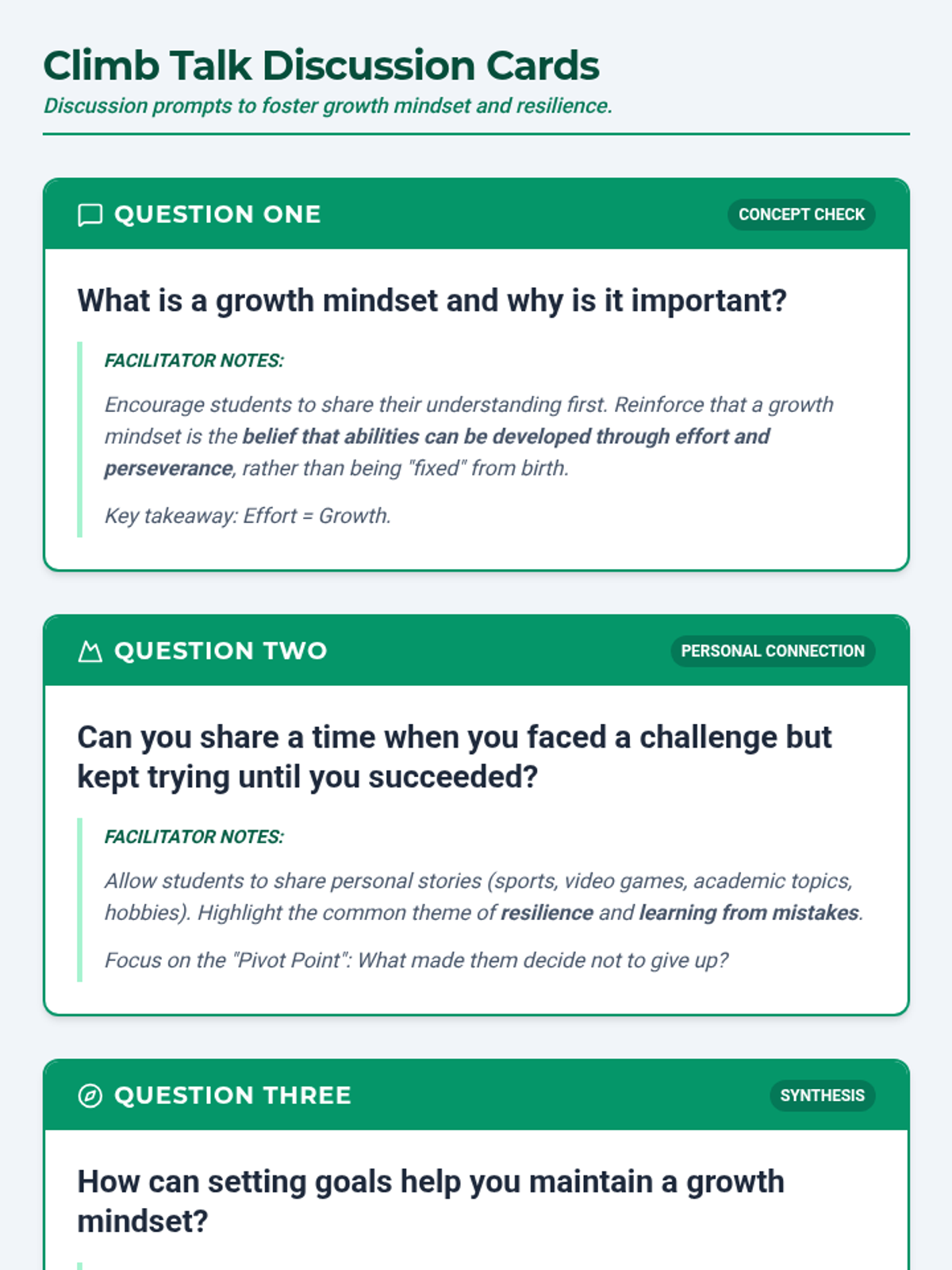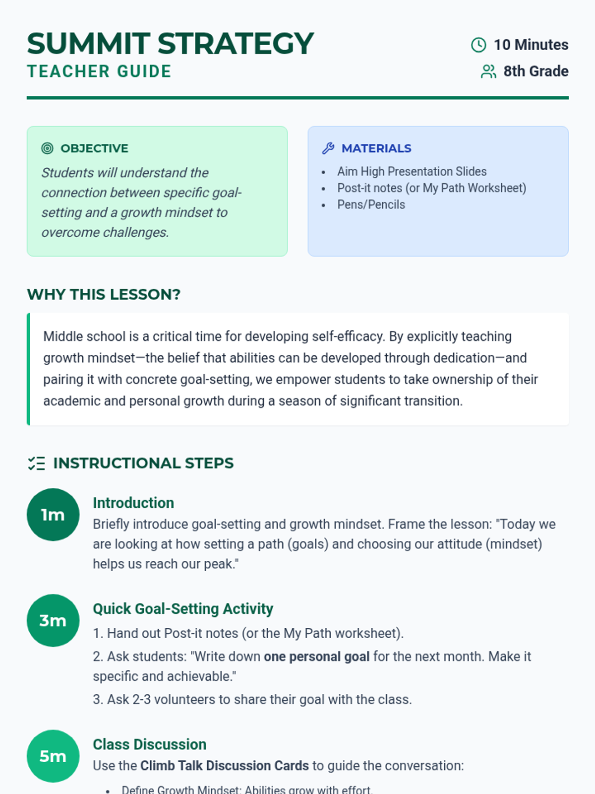 Students will learn about the importance of setting goals and developing a growth mindset through a personal goal-setting activity and a collaborative class discussion. This lesson helps 8th graders understand how effort and perseverance lead to academic and personal success.