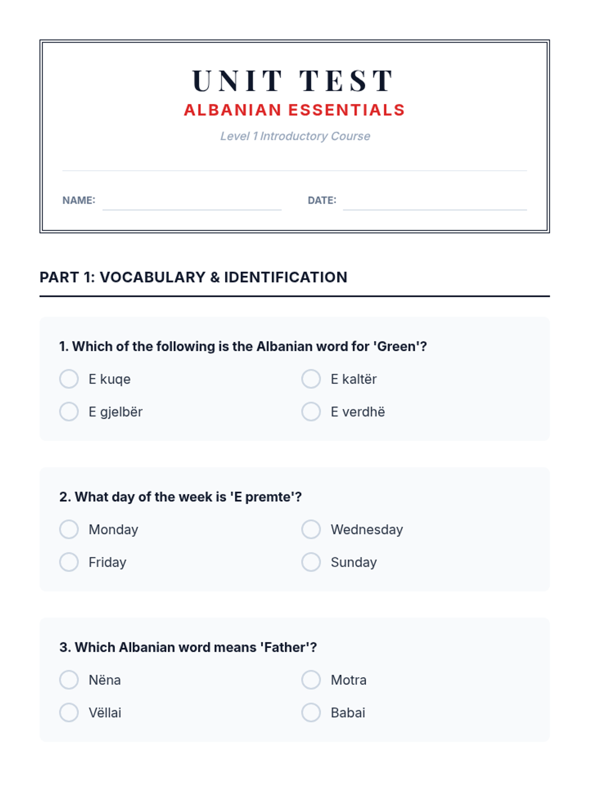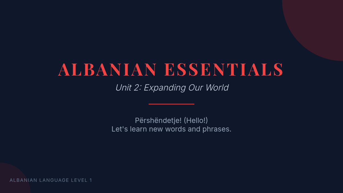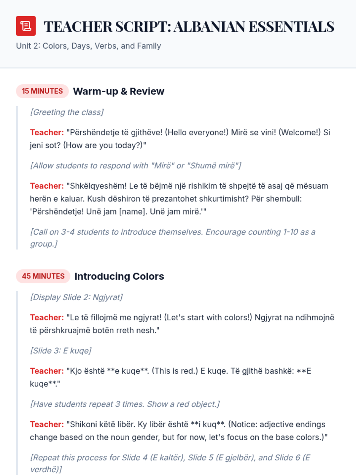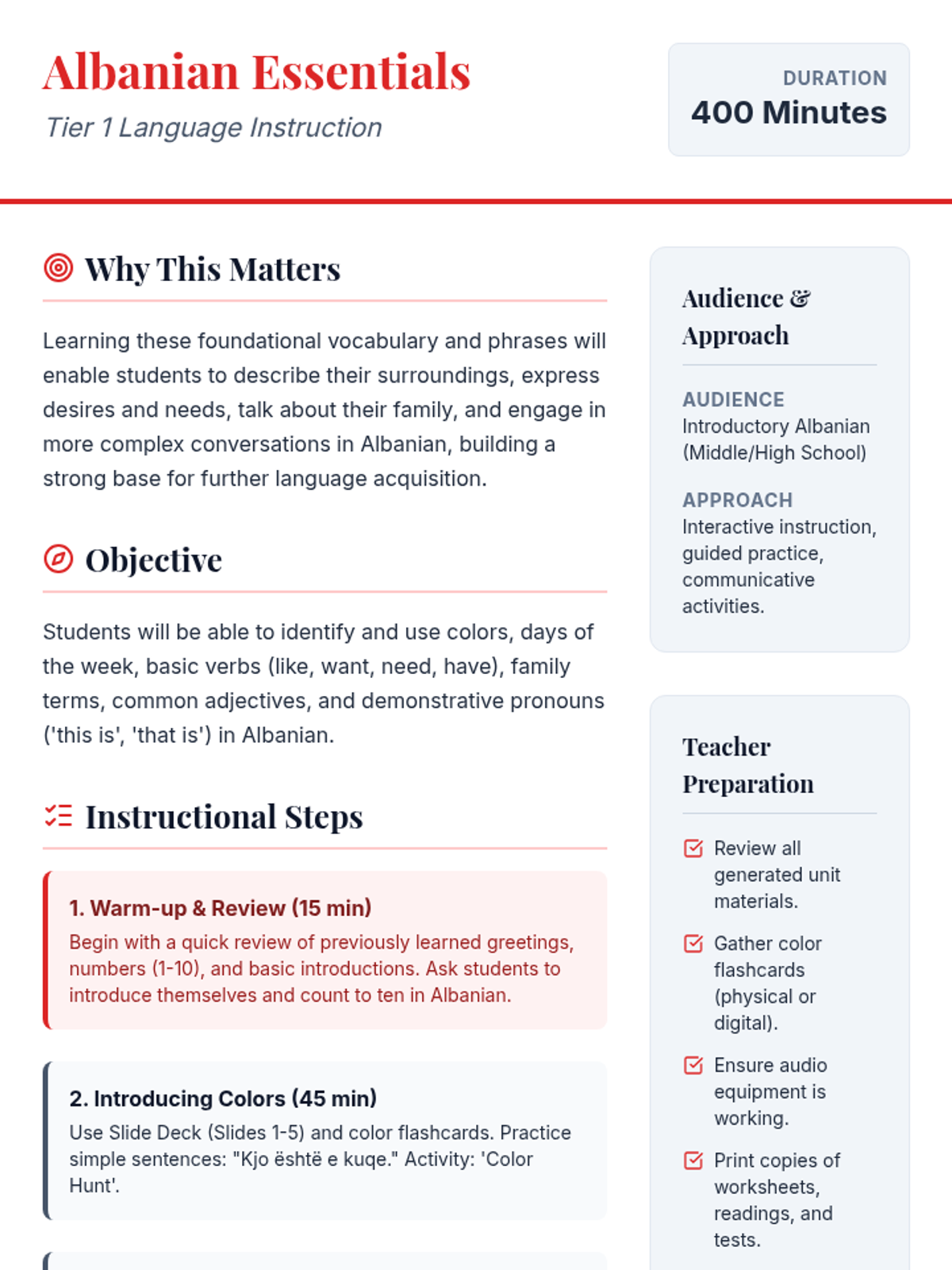 A comprehensive Tier 1 introductory unit on Albanian essentials, covering colors, days of the week, basic verbs, family members, and adjectives. Designed for 400 minutes of instruction across multiple sessions for English-speaking students.