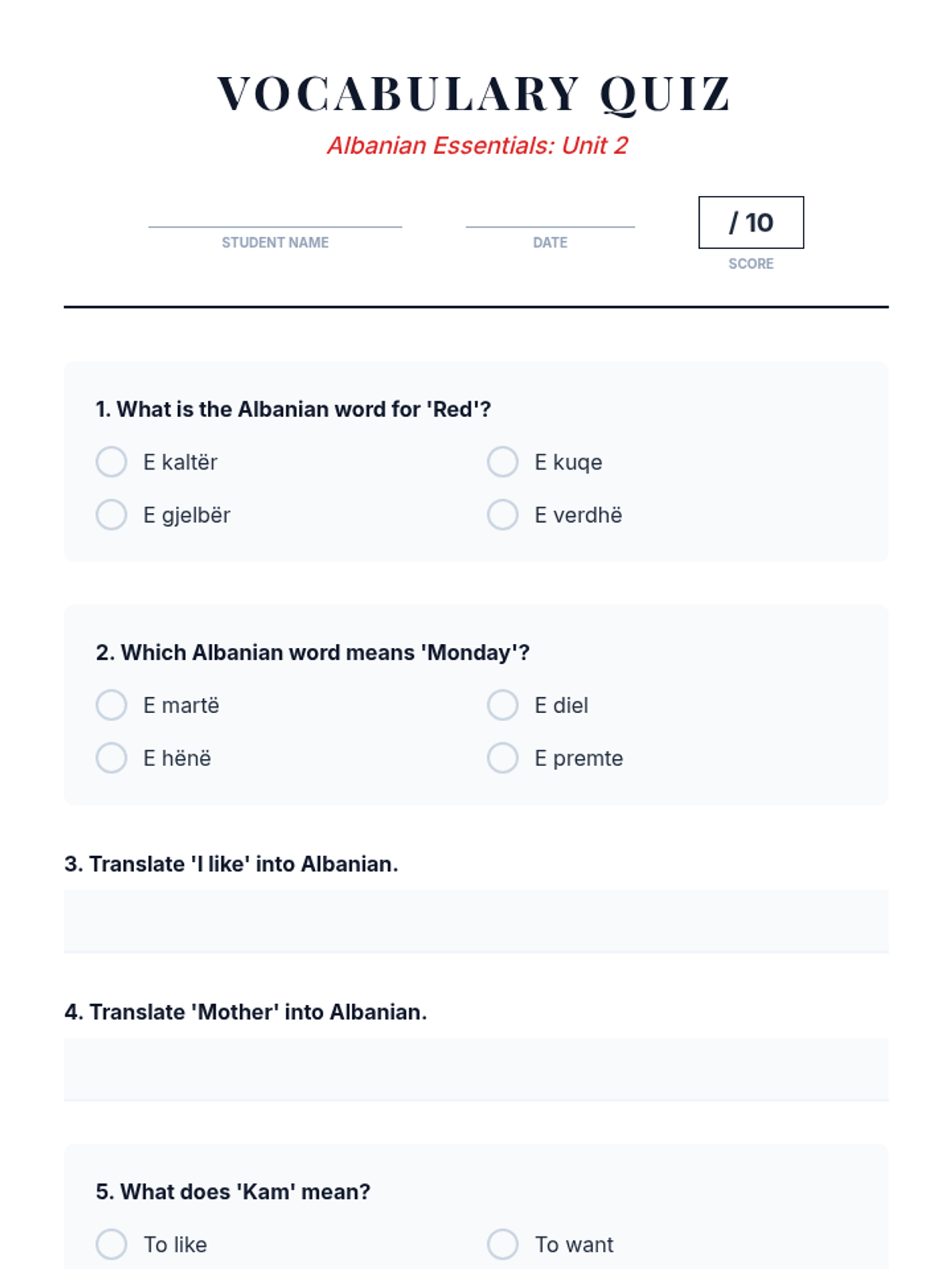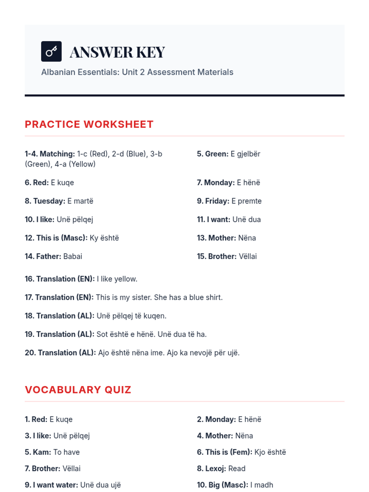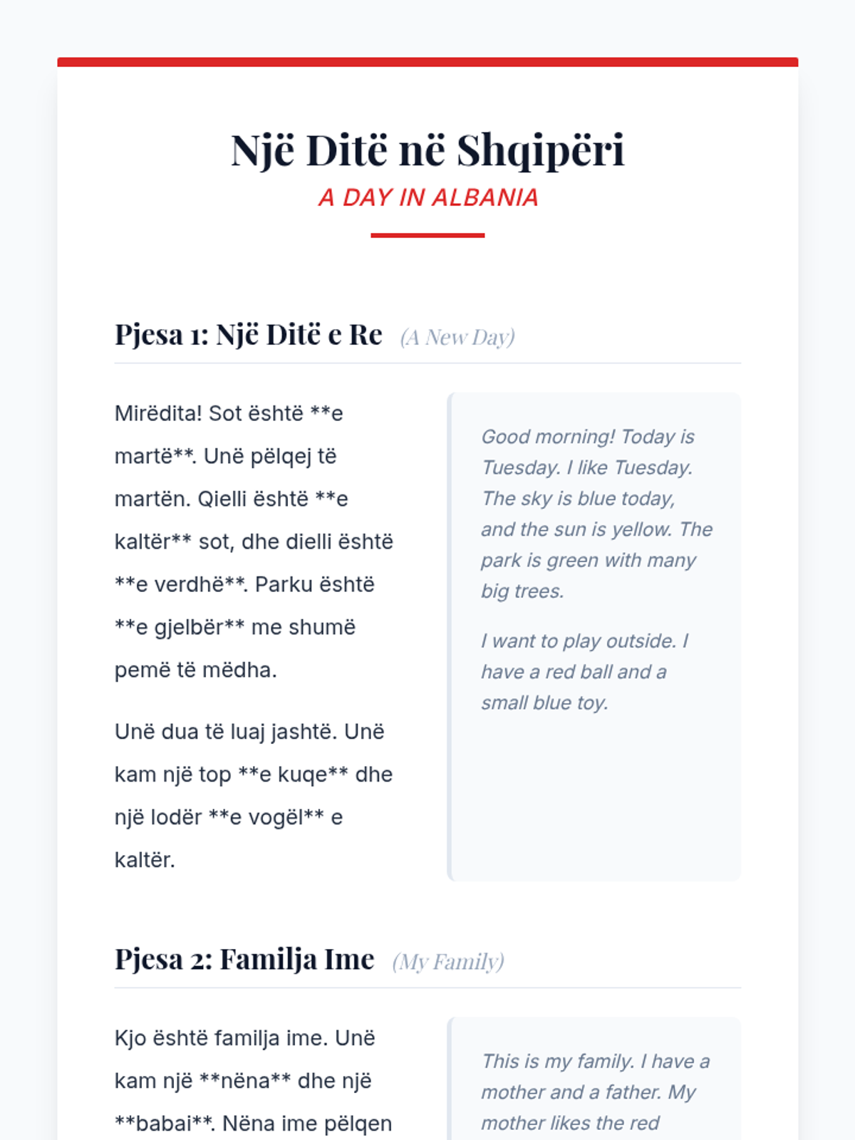 A comprehensive Tier 1 introductory unit on Albanian essentials, covering colors, days of the week, basic verbs, family members, and adjectives. Designed for 400 minutes of instruction across multiple sessions for English-speaking students.