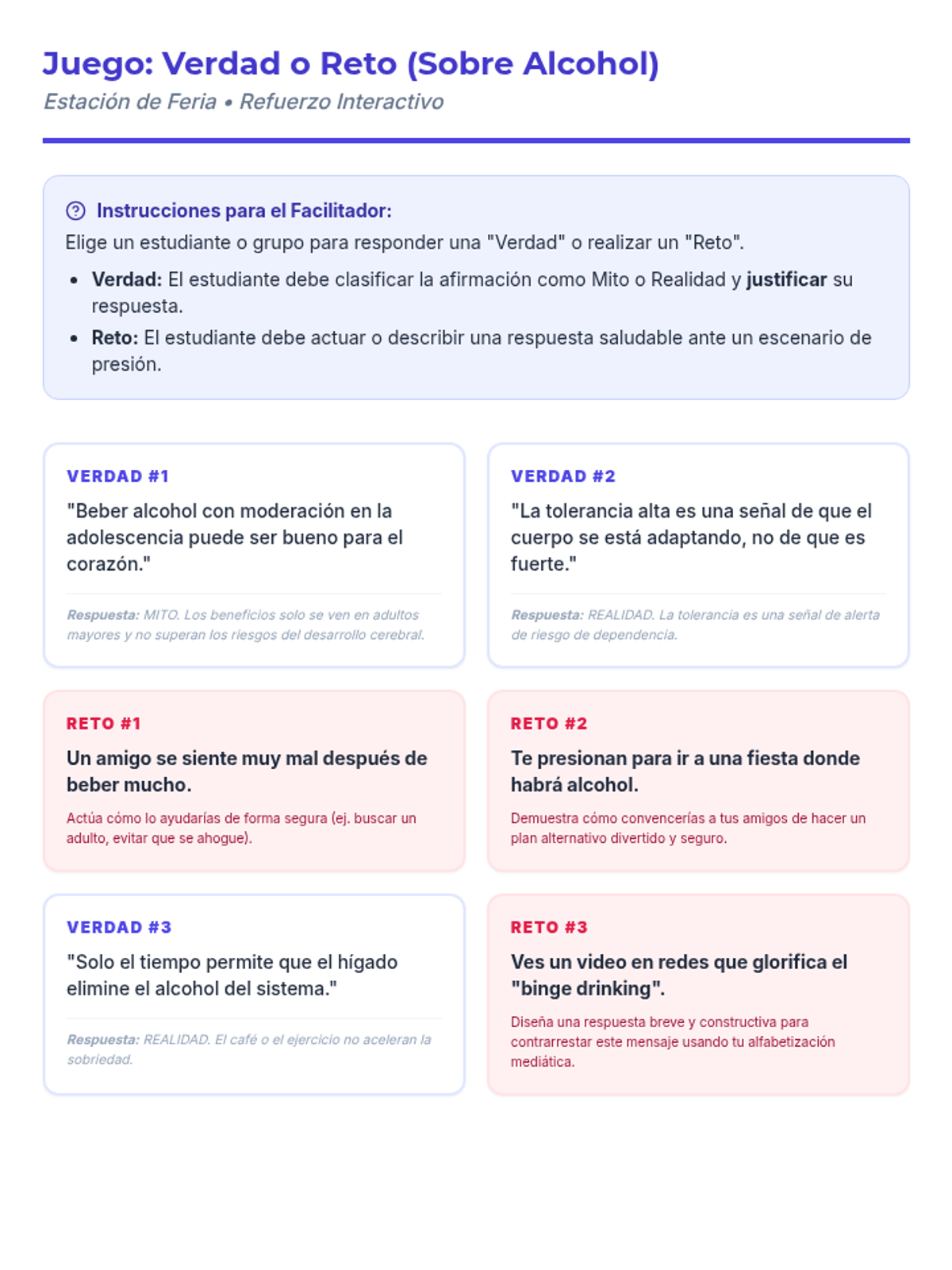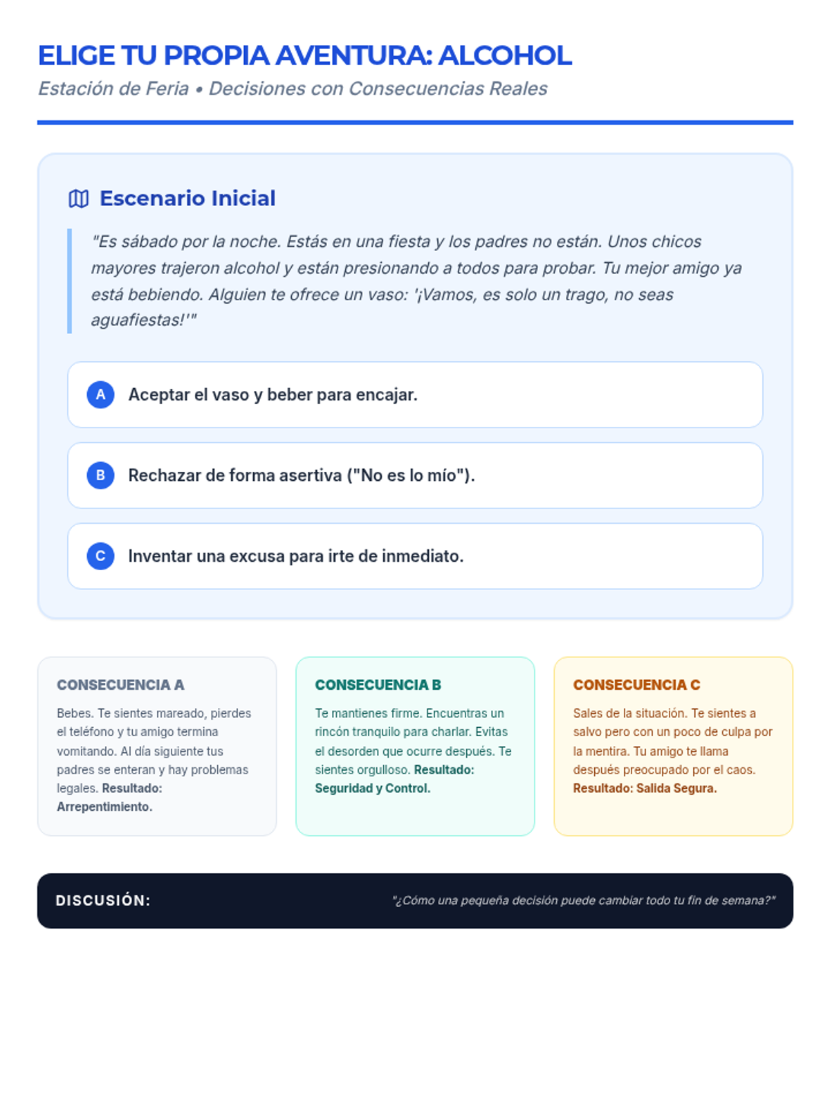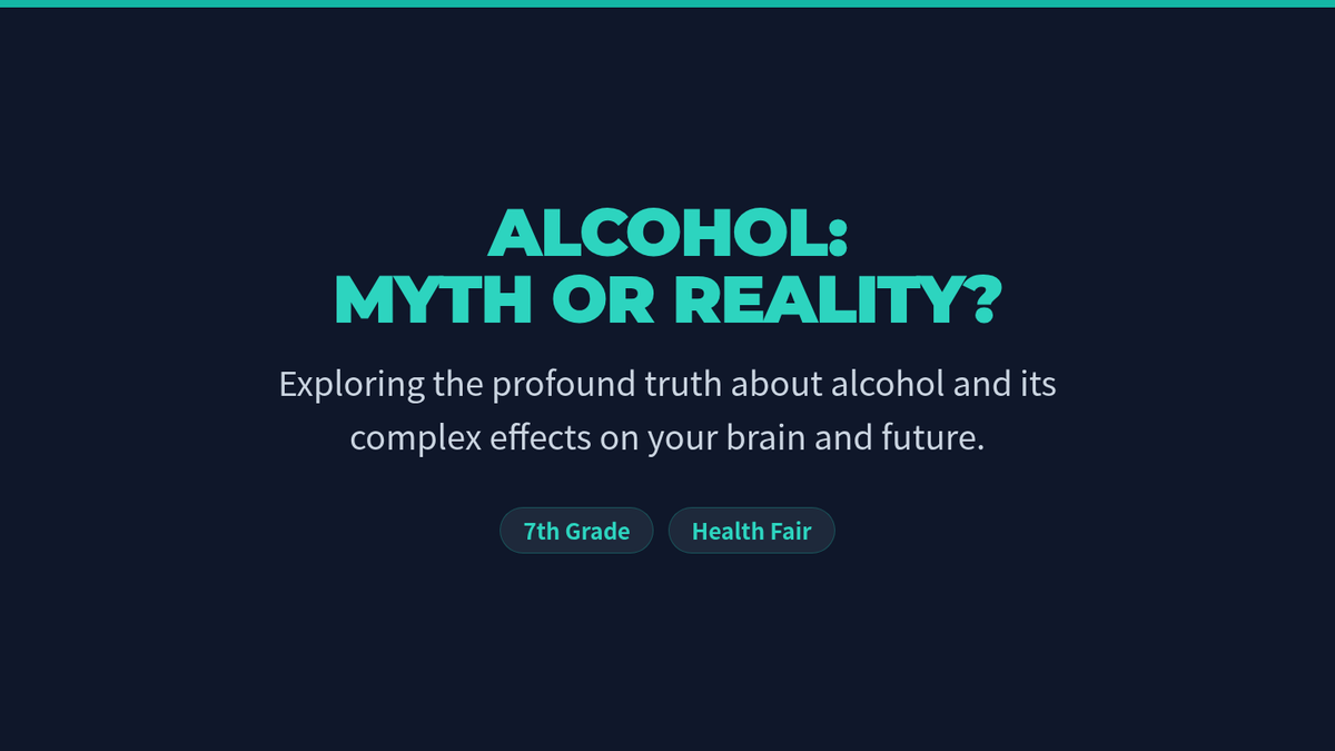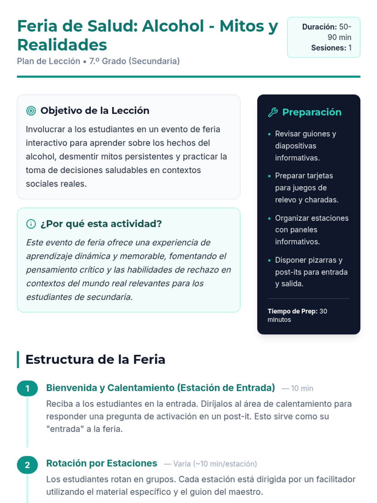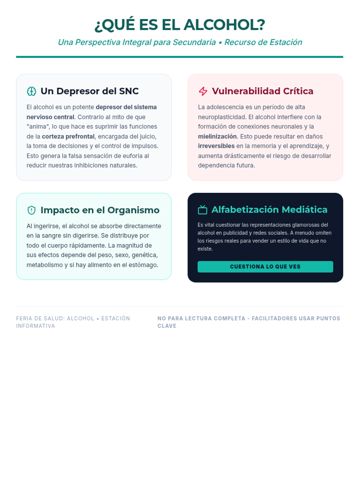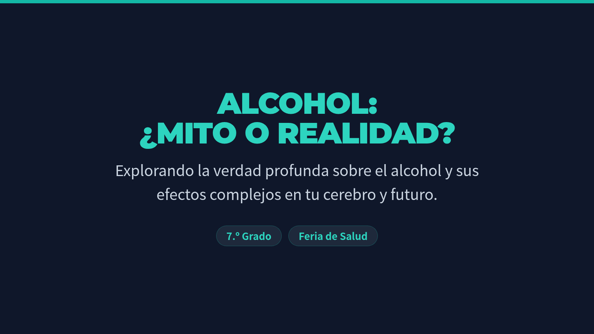 Una feria de salud interactiva diseñada para estudiantes de 7º grado para desmitificar creencias sobre el alcohol, entender sus efectos biológicos y practicar la toma de decisiones saludables. Brinda herramientas prácticas de resistencia y análisis crítico de medios.