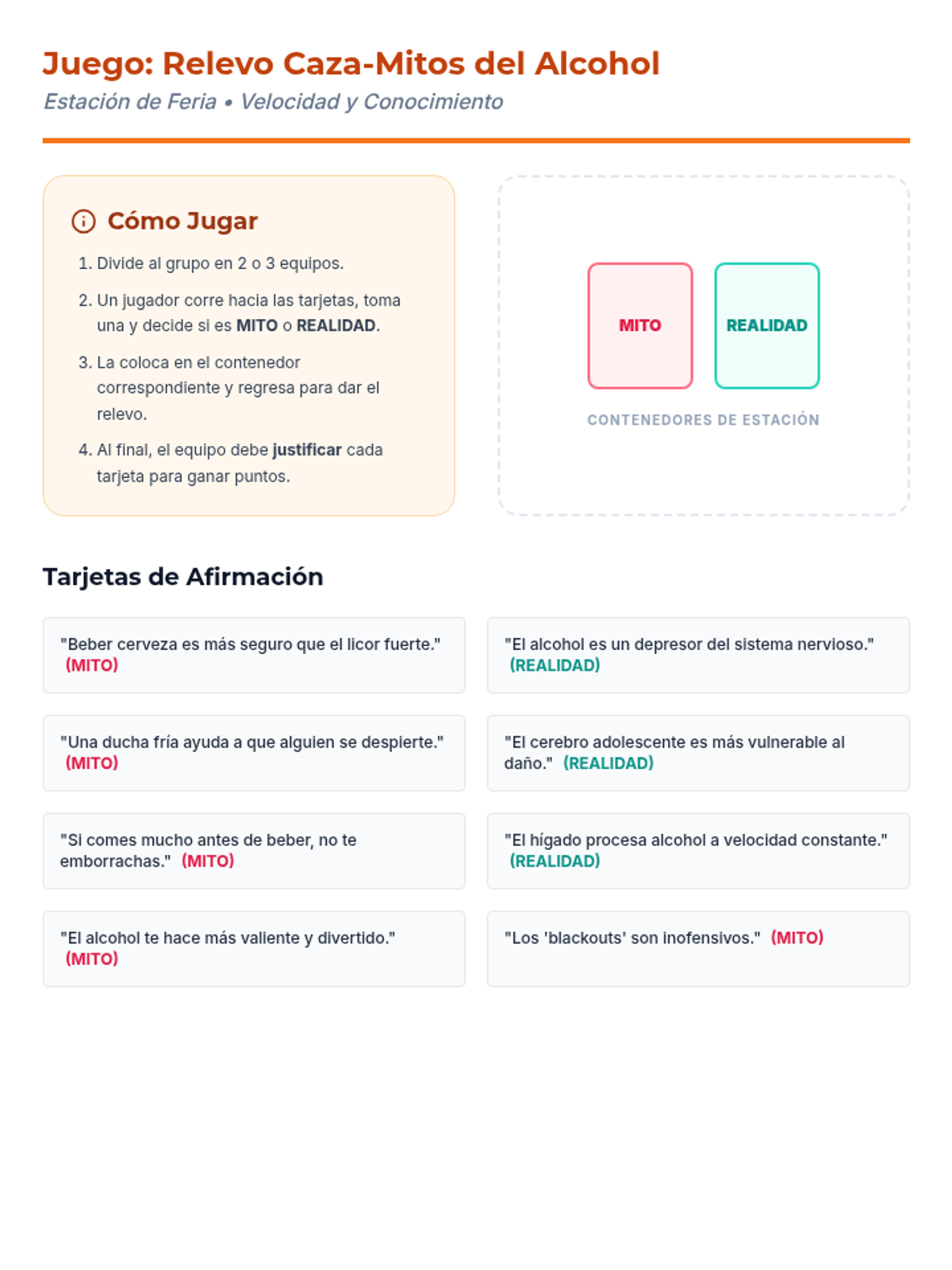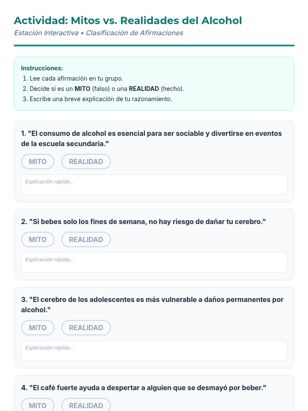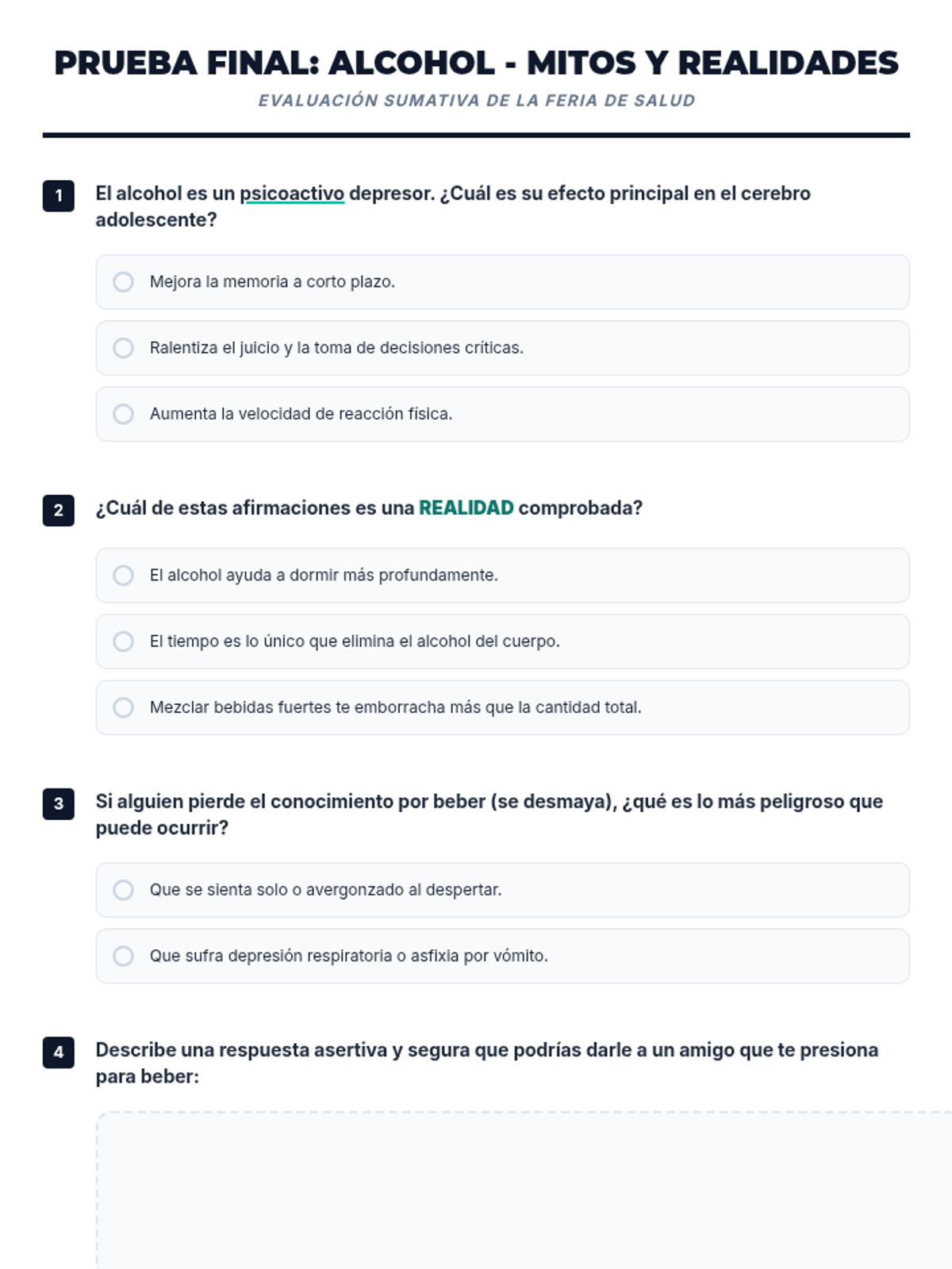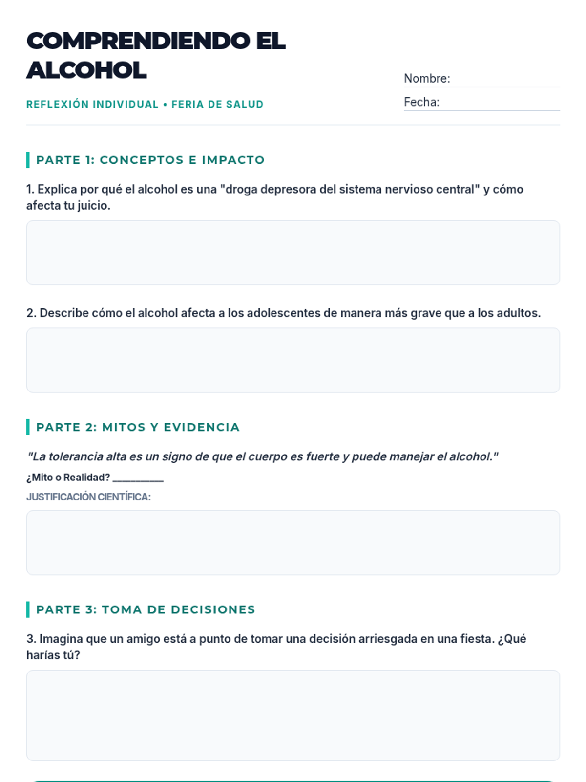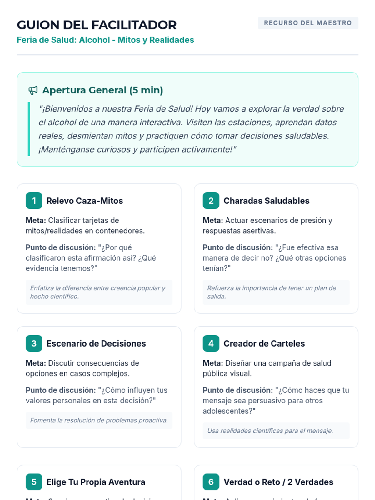 Una feria de salud interactiva diseñada para estudiantes de 7º grado para desmitificar creencias sobre el alcohol, entender sus efectos biológicos y practicar la toma de decisiones saludables. Brinda herramientas prácticas de resistencia y análisis crítico de medios.
