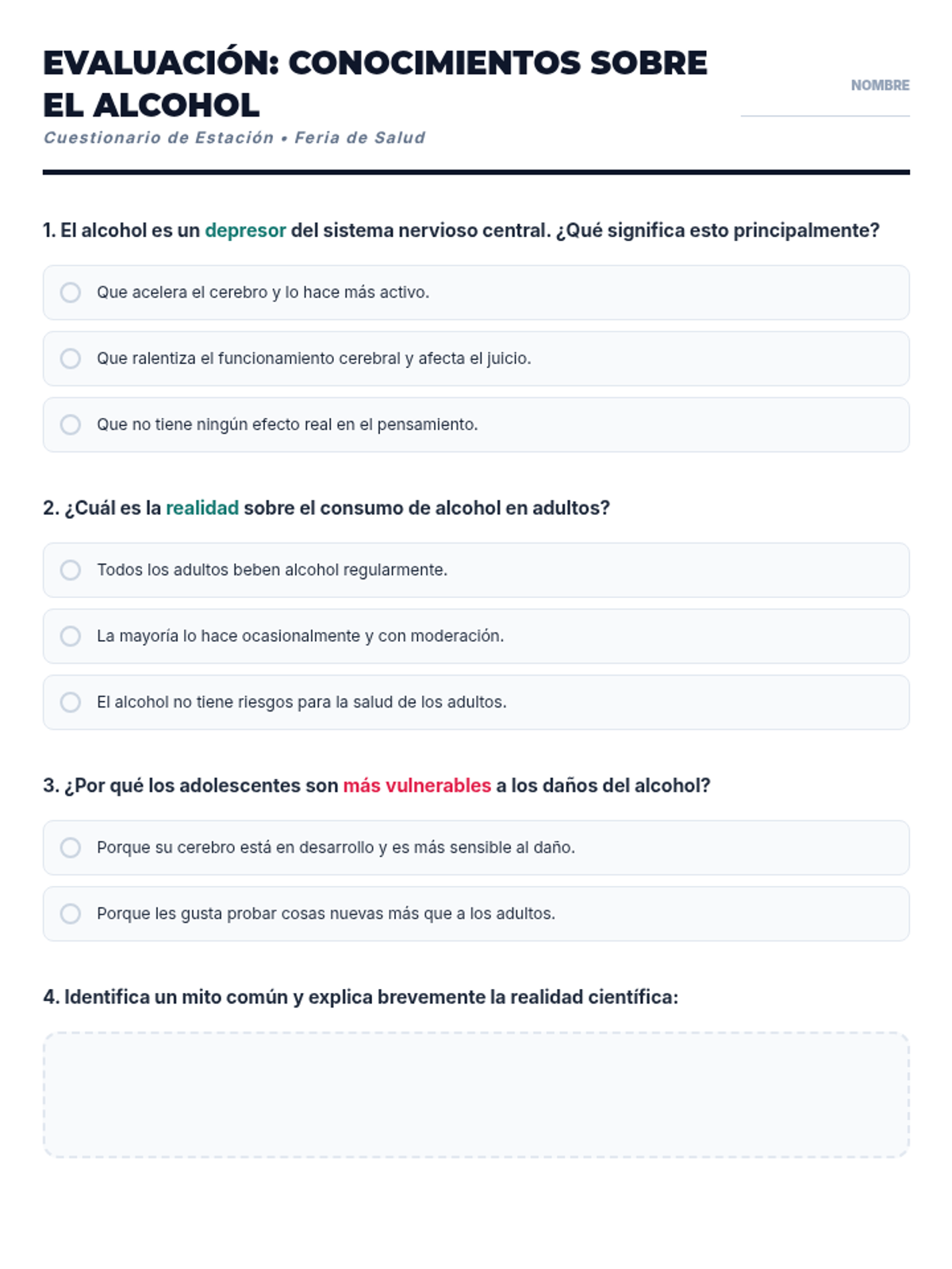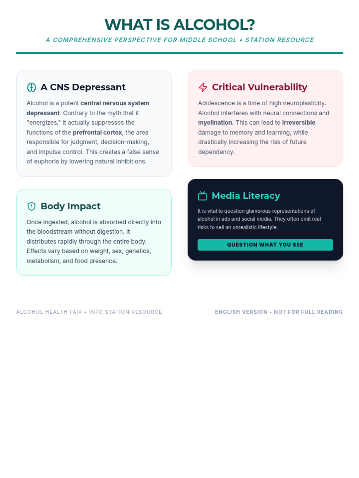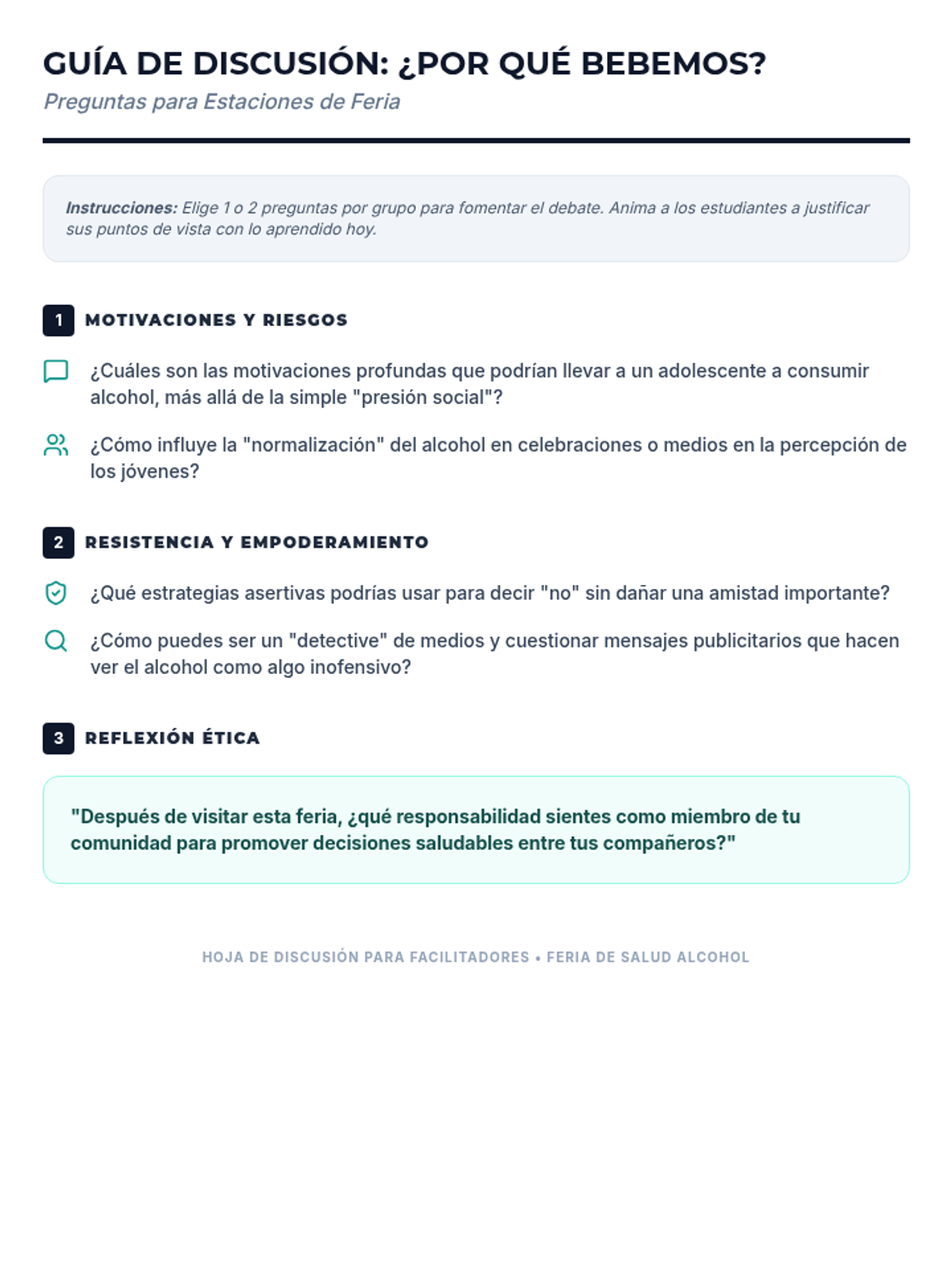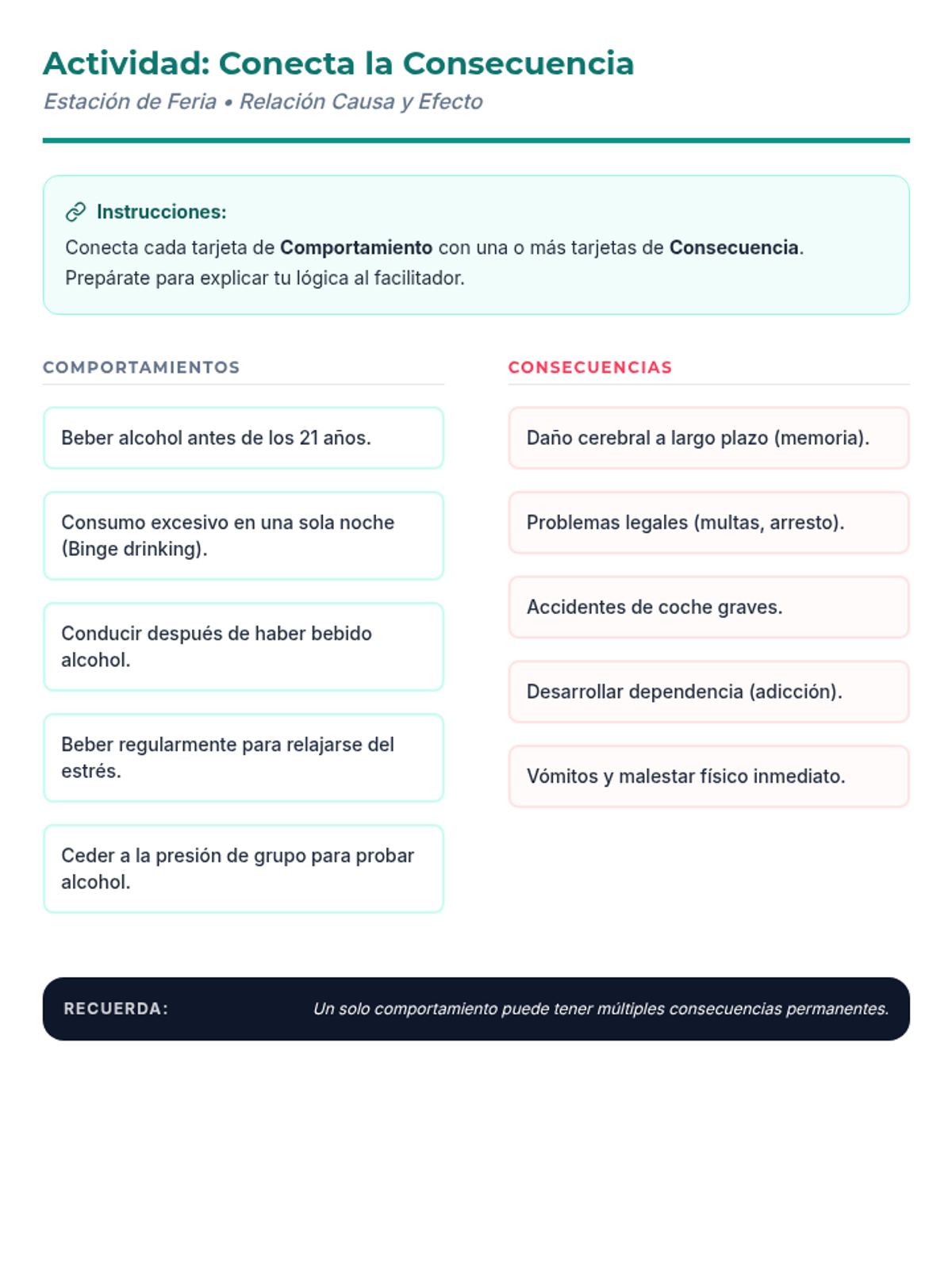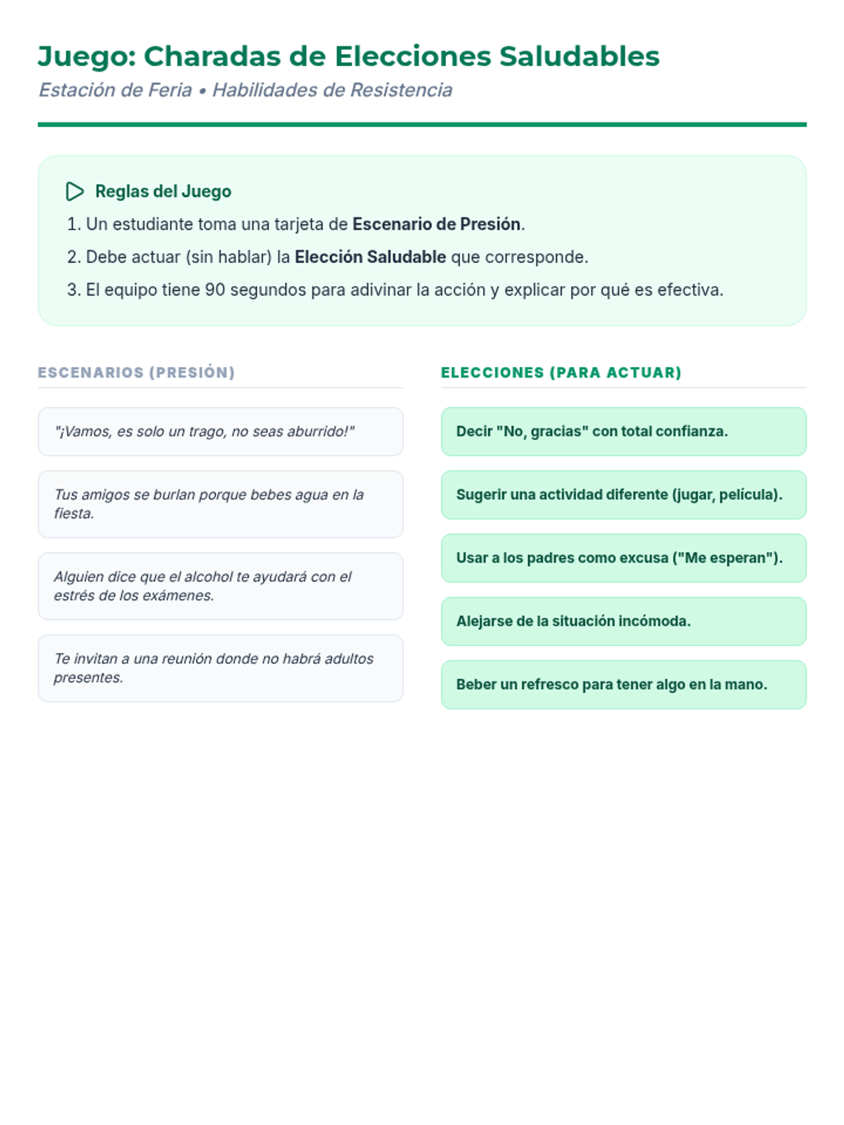 Una feria de salud interactiva diseñada para estudiantes de 7º grado para desmitificar creencias sobre el alcohol, entender sus efectos biológicos y practicar la toma de decisiones saludables. Brinda herramientas prácticas de resistencia y análisis crítico de medios.