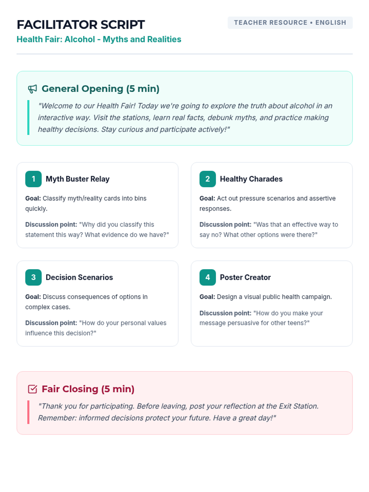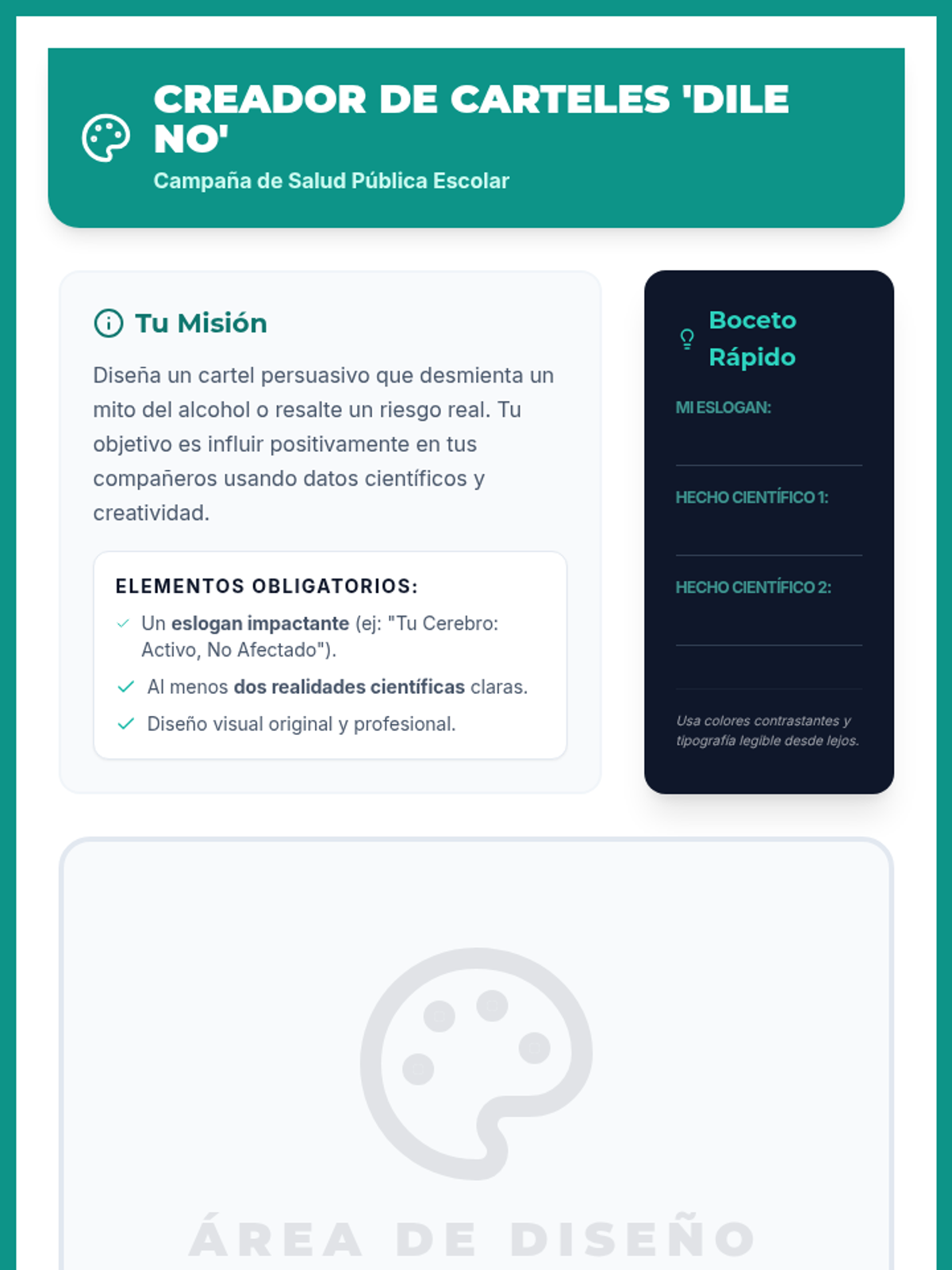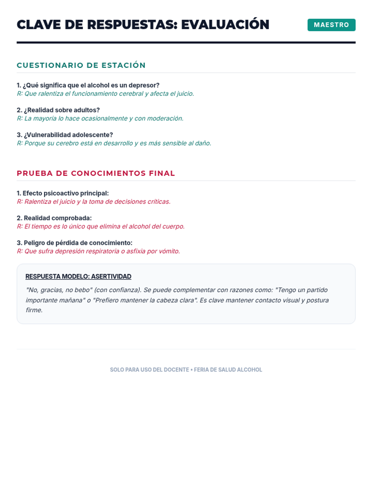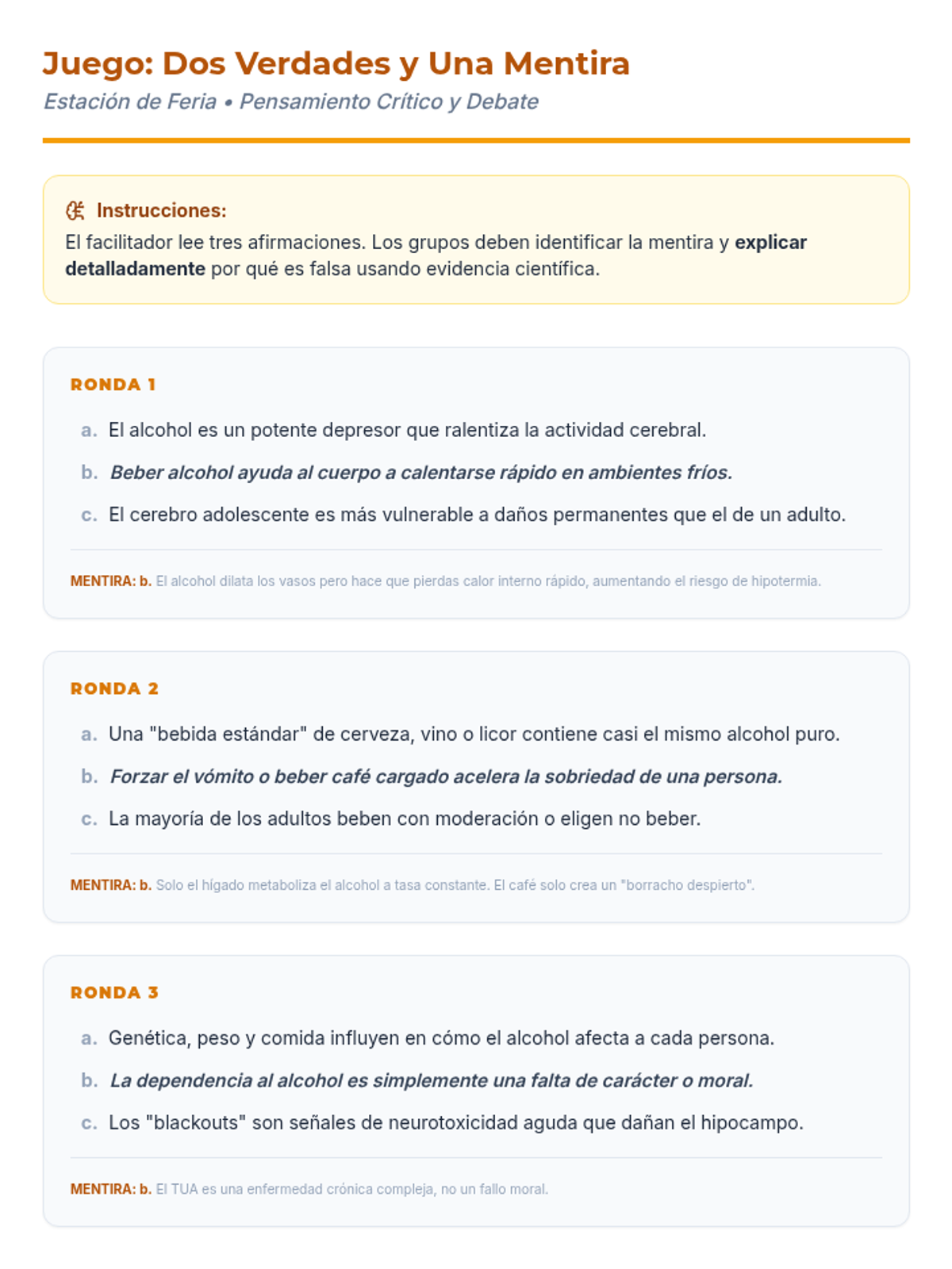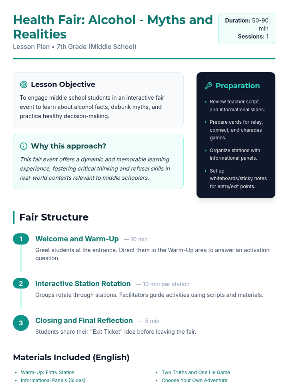 Una feria de salud interactiva diseñada para estudiantes de 7º grado para desmitificar creencias sobre el alcohol, entender sus efectos biológicos y practicar la toma de decisiones saludables. Brinda herramientas prácticas de resistencia y análisis crítico de medios.