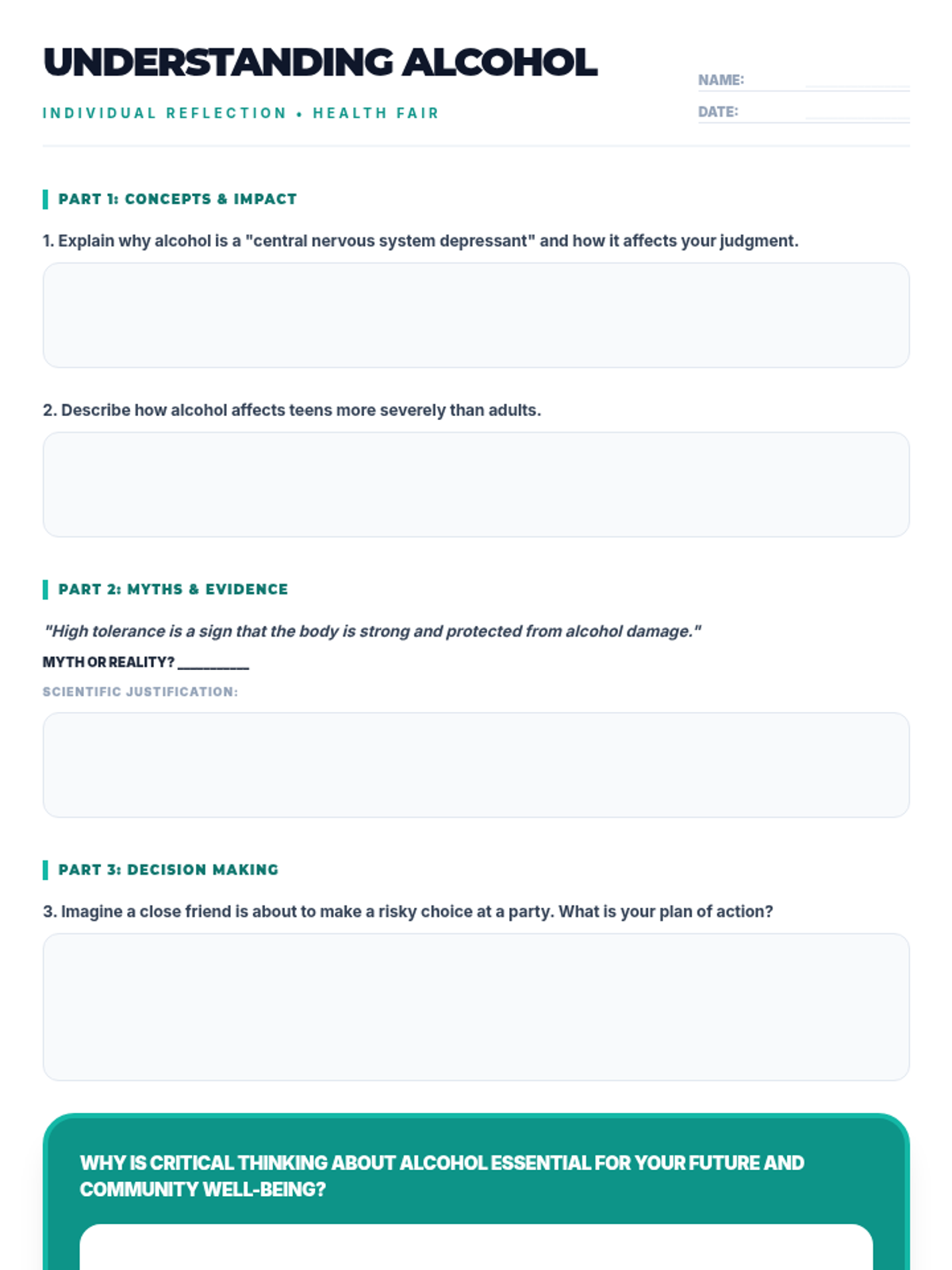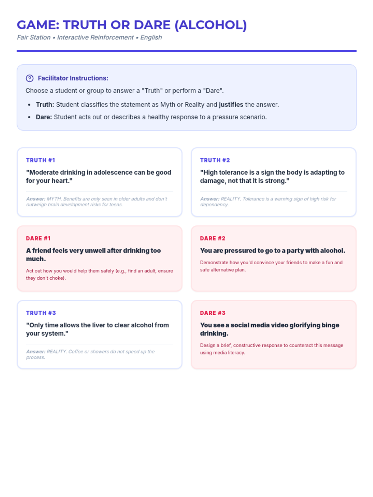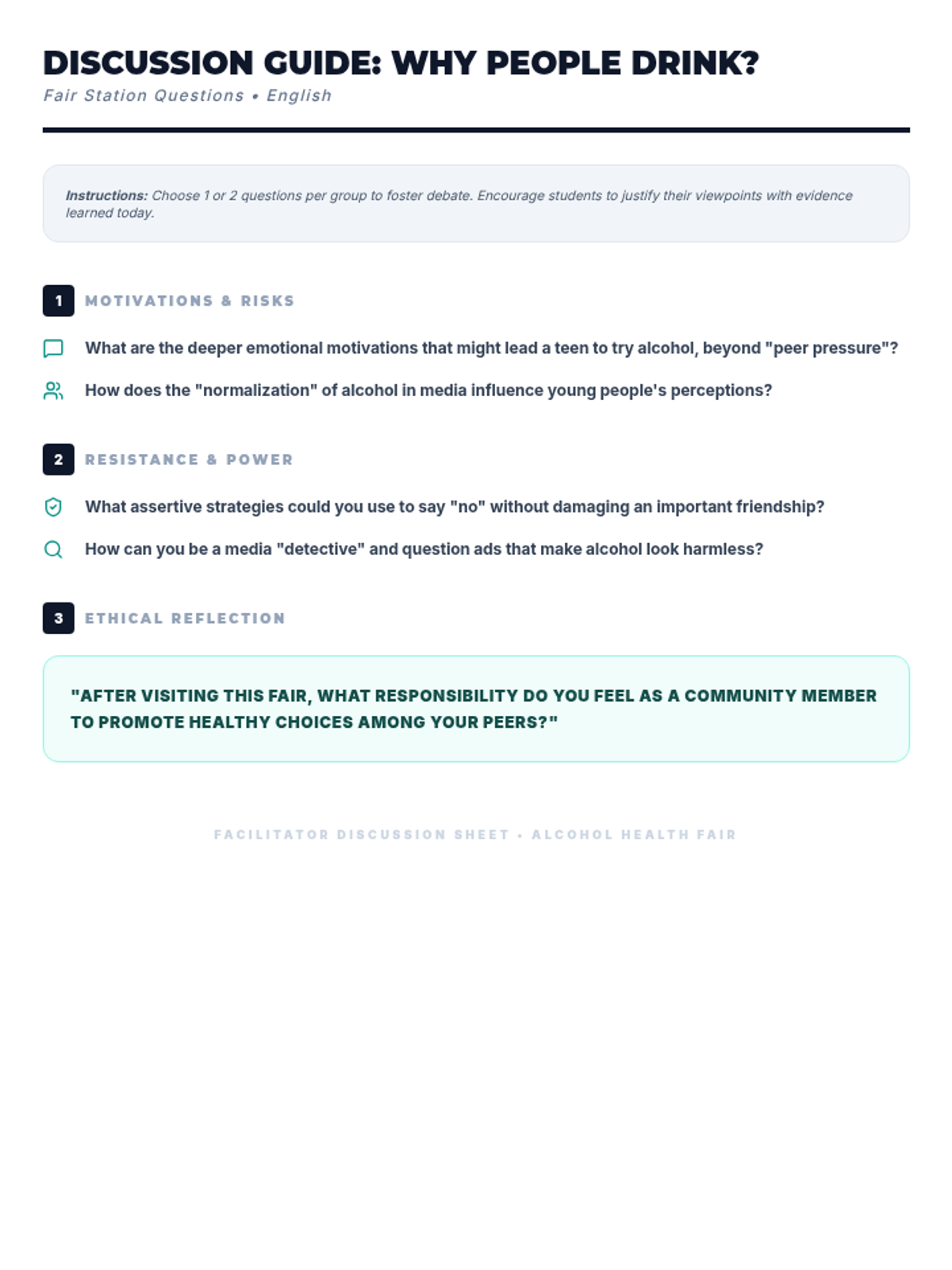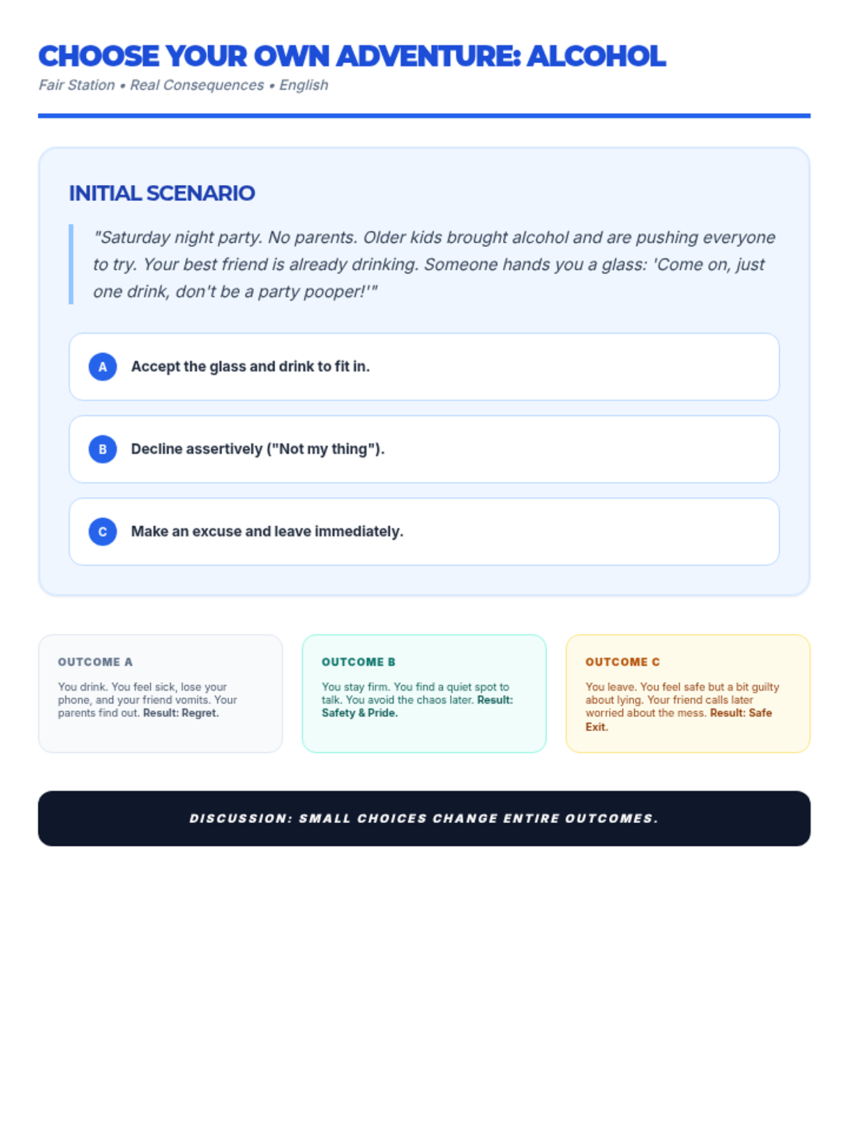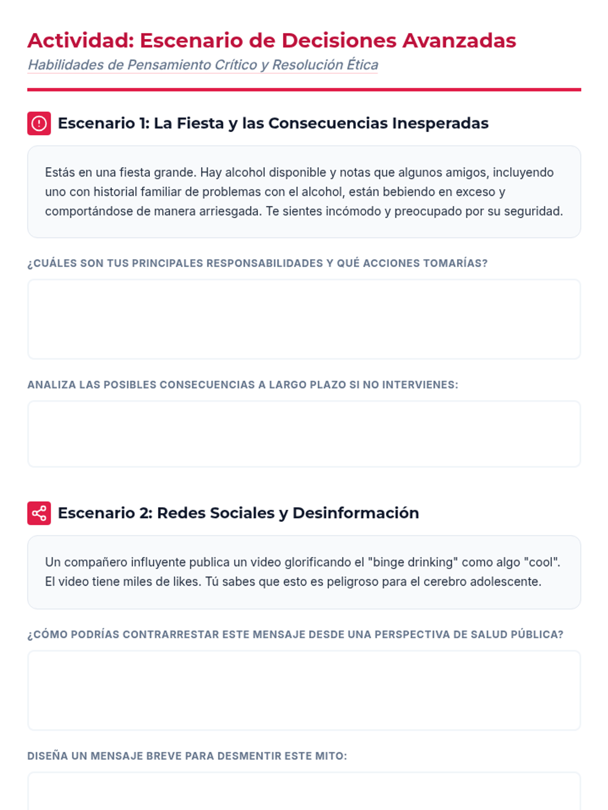 Una feria de salud interactiva diseñada para estudiantes de 7º grado para desmitificar creencias sobre el alcohol, entender sus efectos biológicos y practicar la toma de decisiones saludables. Brinda herramientas prácticas de resistencia y análisis crítico de medios.