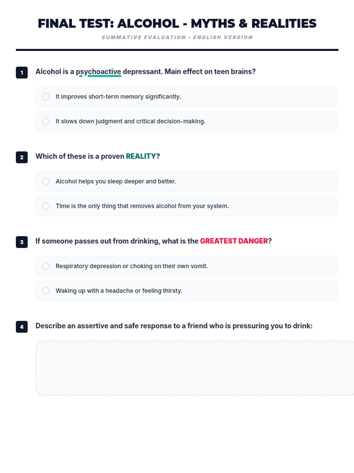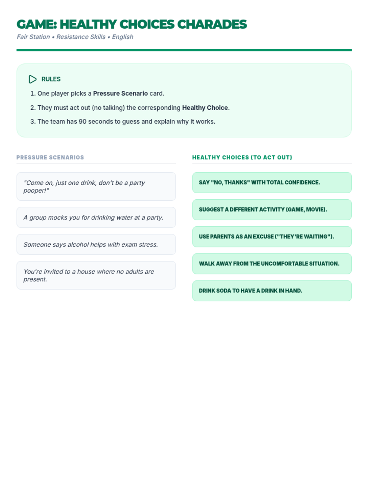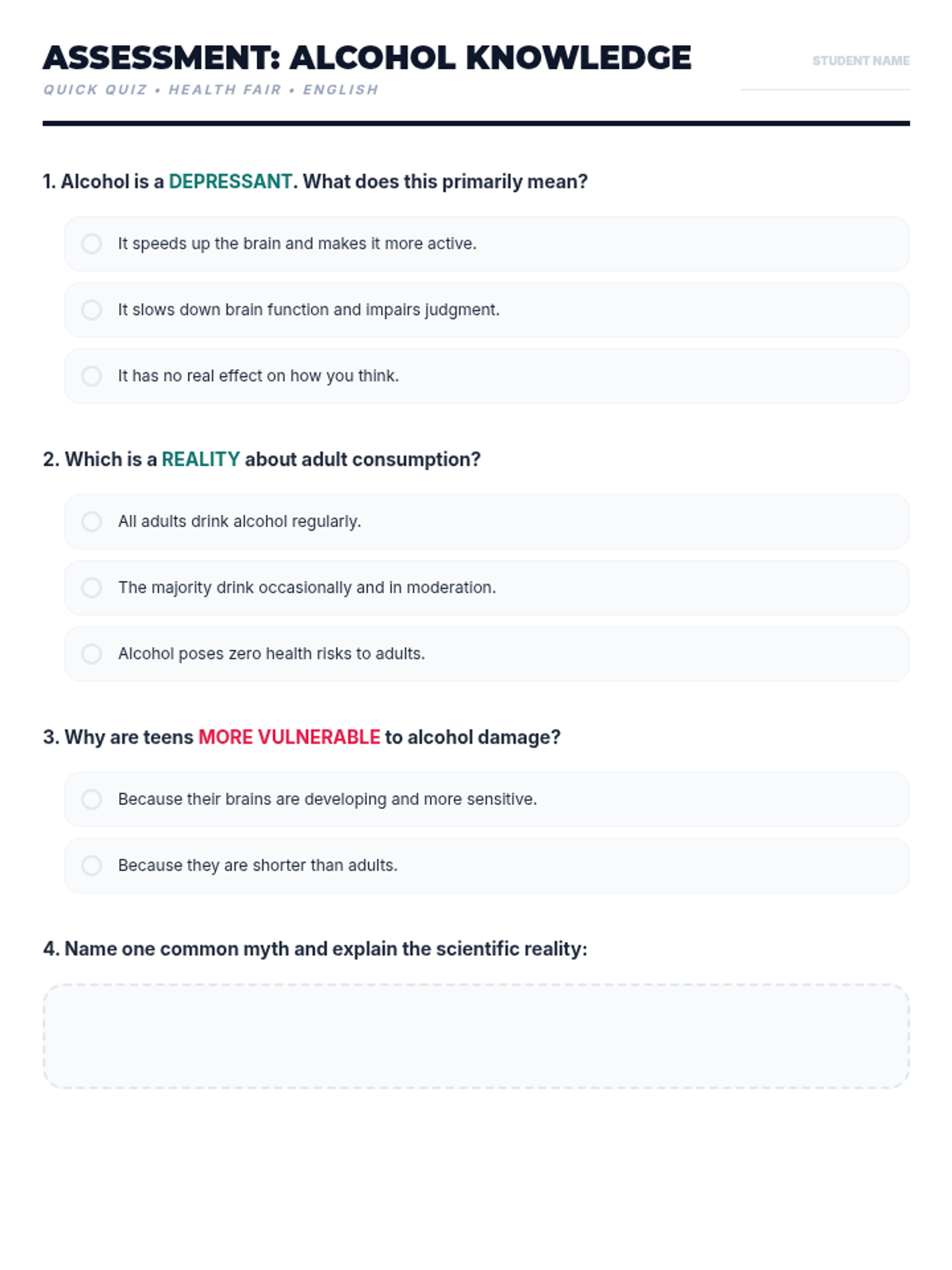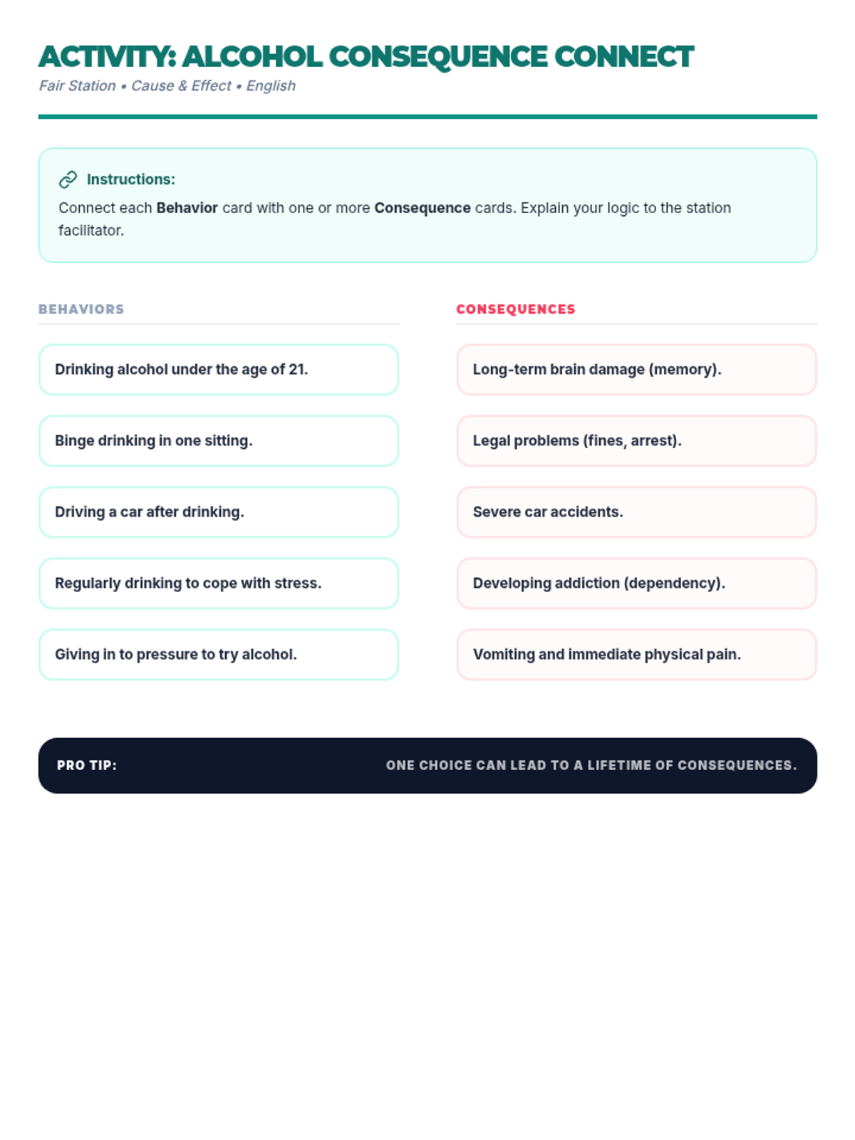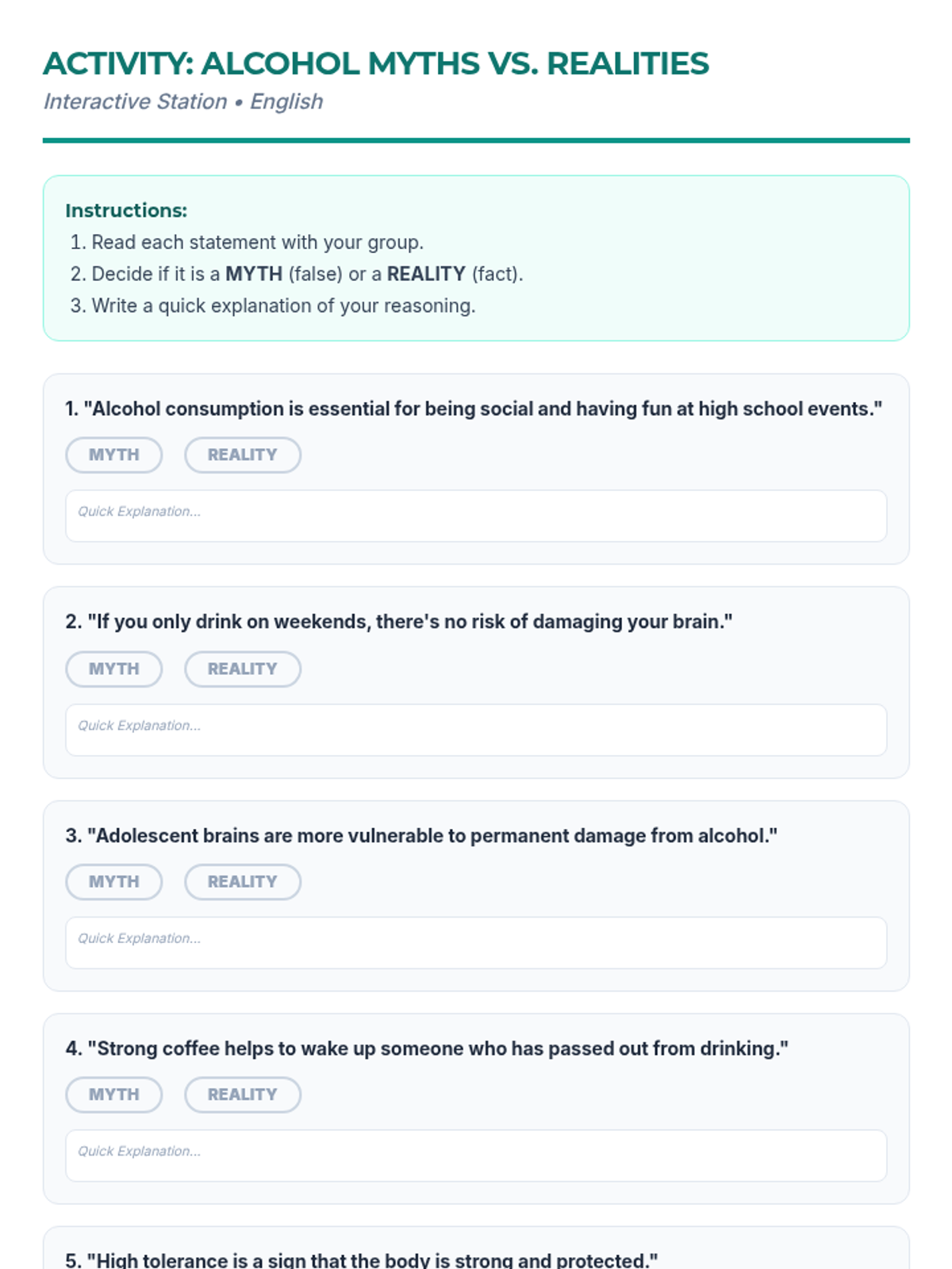 Una feria de salud interactiva diseñada para estudiantes de 7º grado para desmitificar creencias sobre el alcohol, entender sus efectos biológicos y practicar la toma de decisiones saludables. Brinda herramientas prácticas de resistencia y análisis crítico de medios.