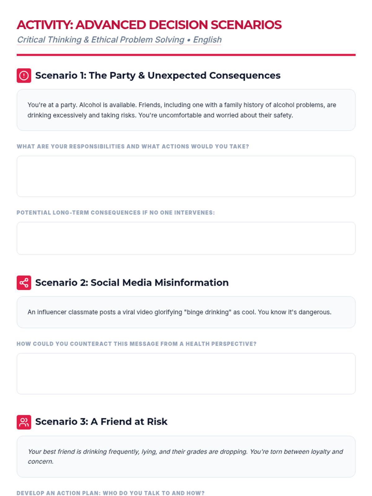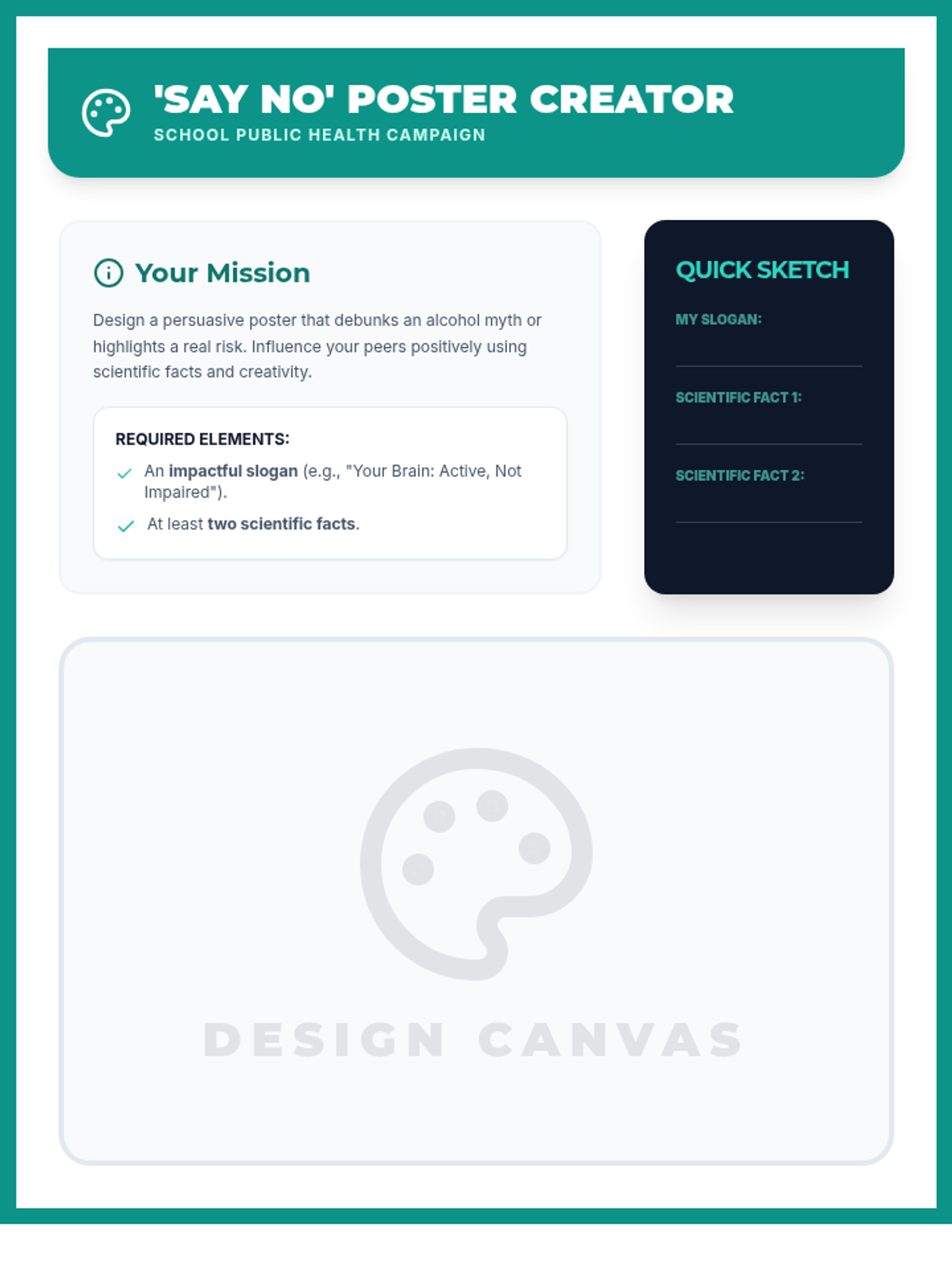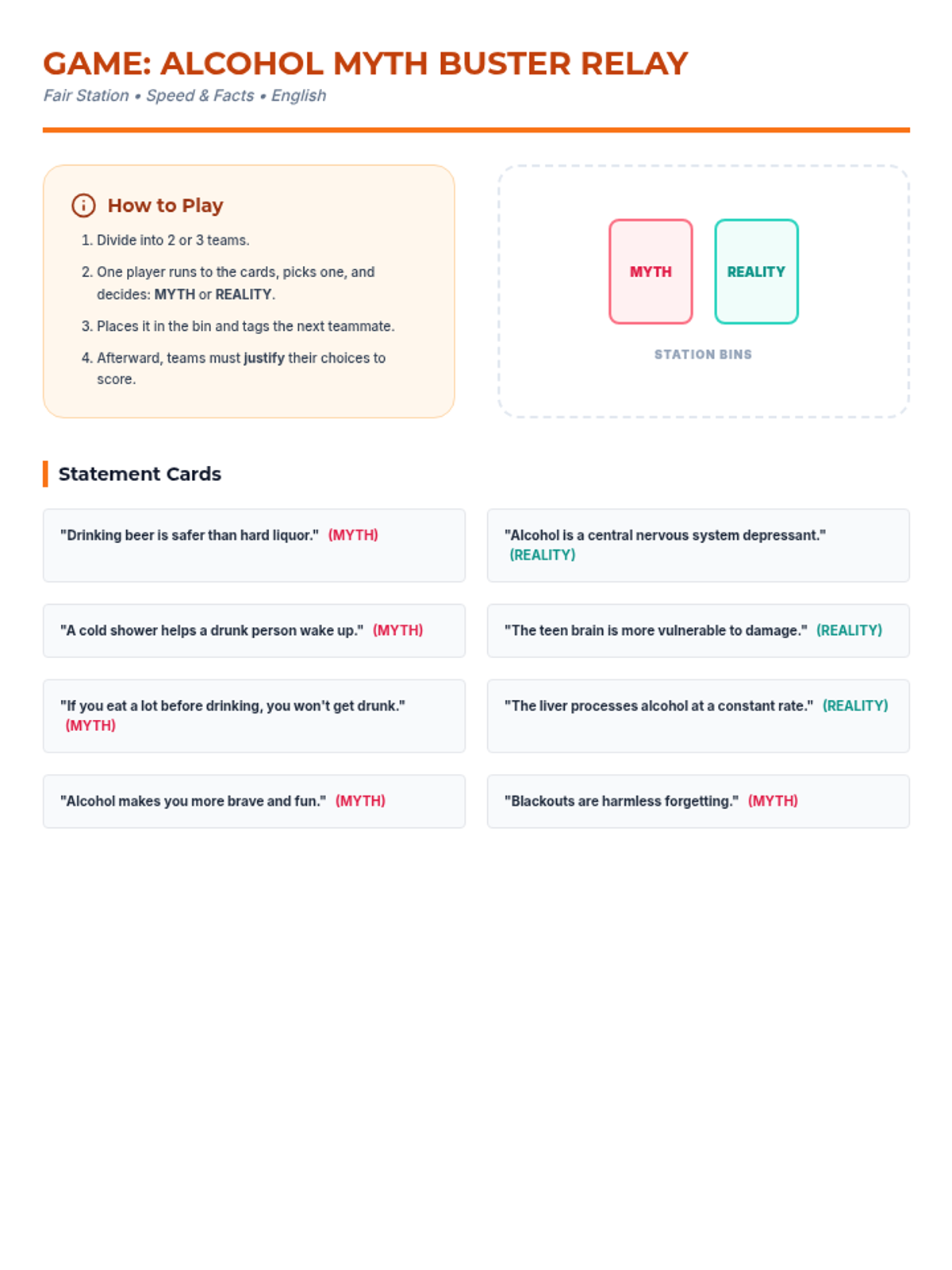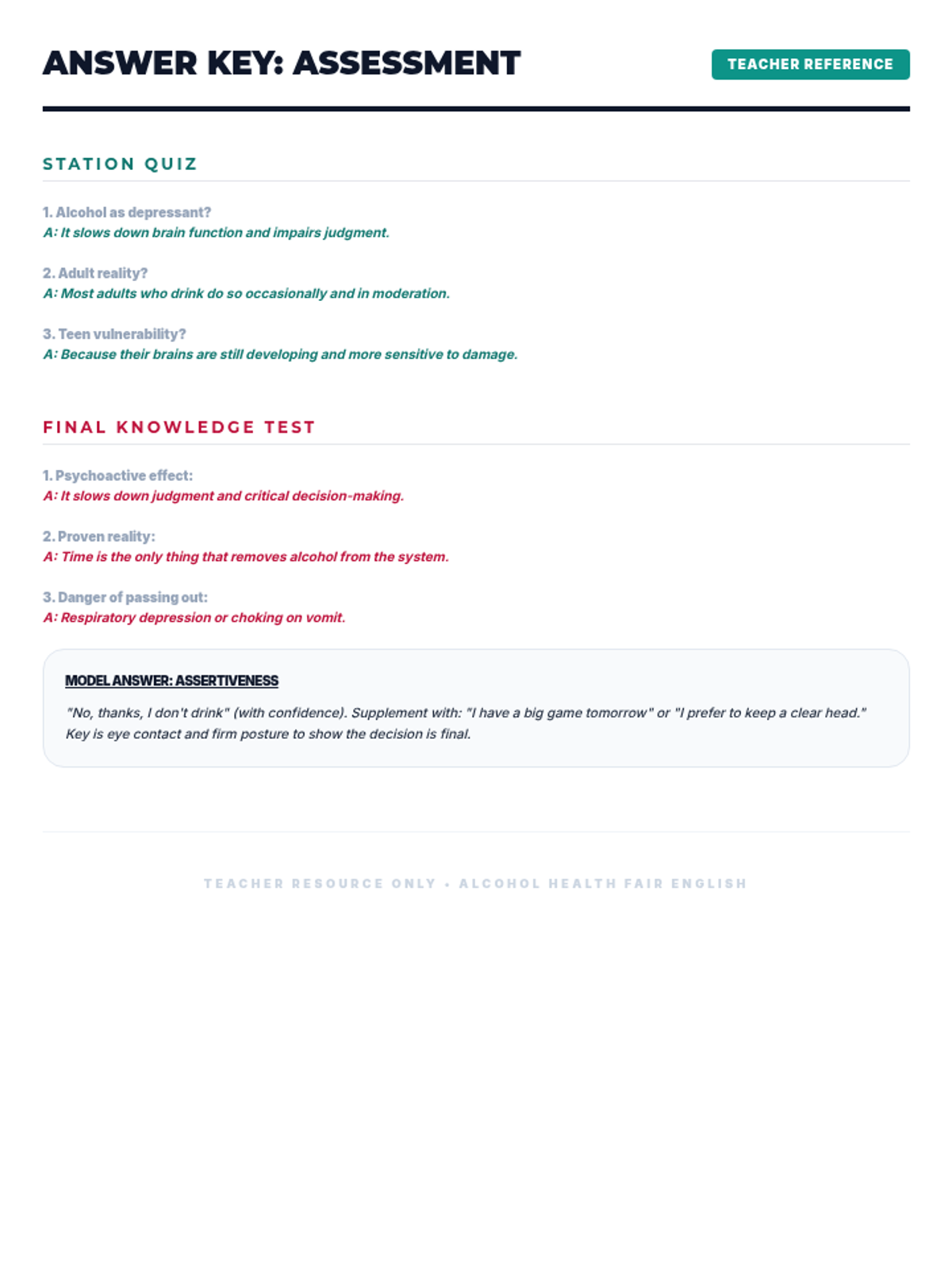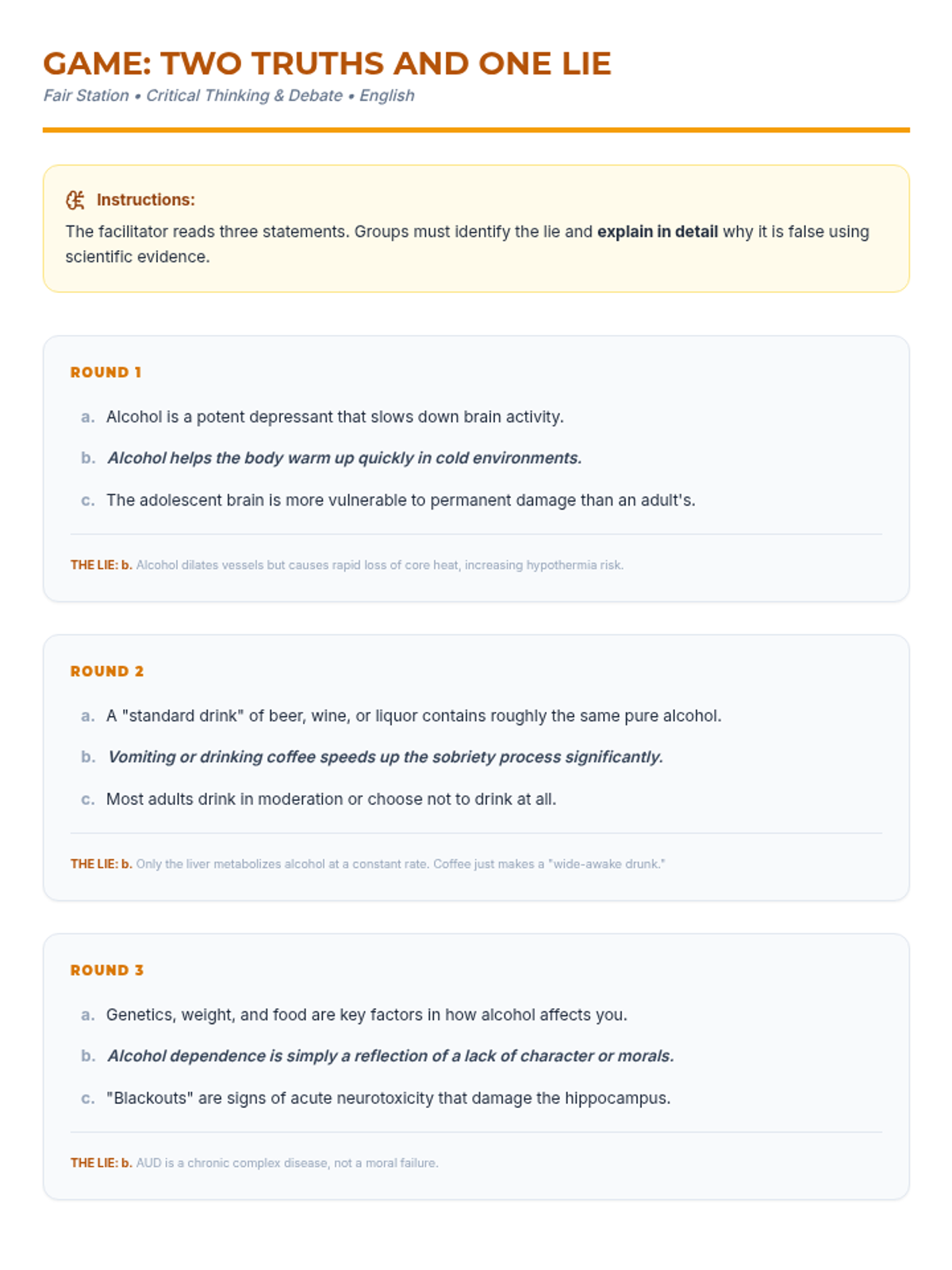 Una feria de salud interactiva diseñada para estudiantes de 7º grado para desmitificar creencias sobre el alcohol, entender sus efectos biológicos y practicar la toma de decisiones saludables. Brinda herramientas prácticas de resistencia y análisis crítico de medios.