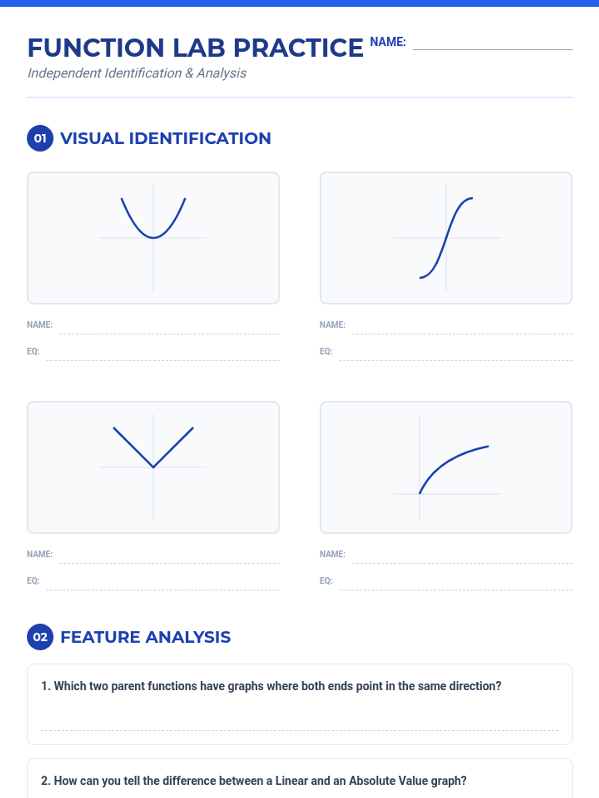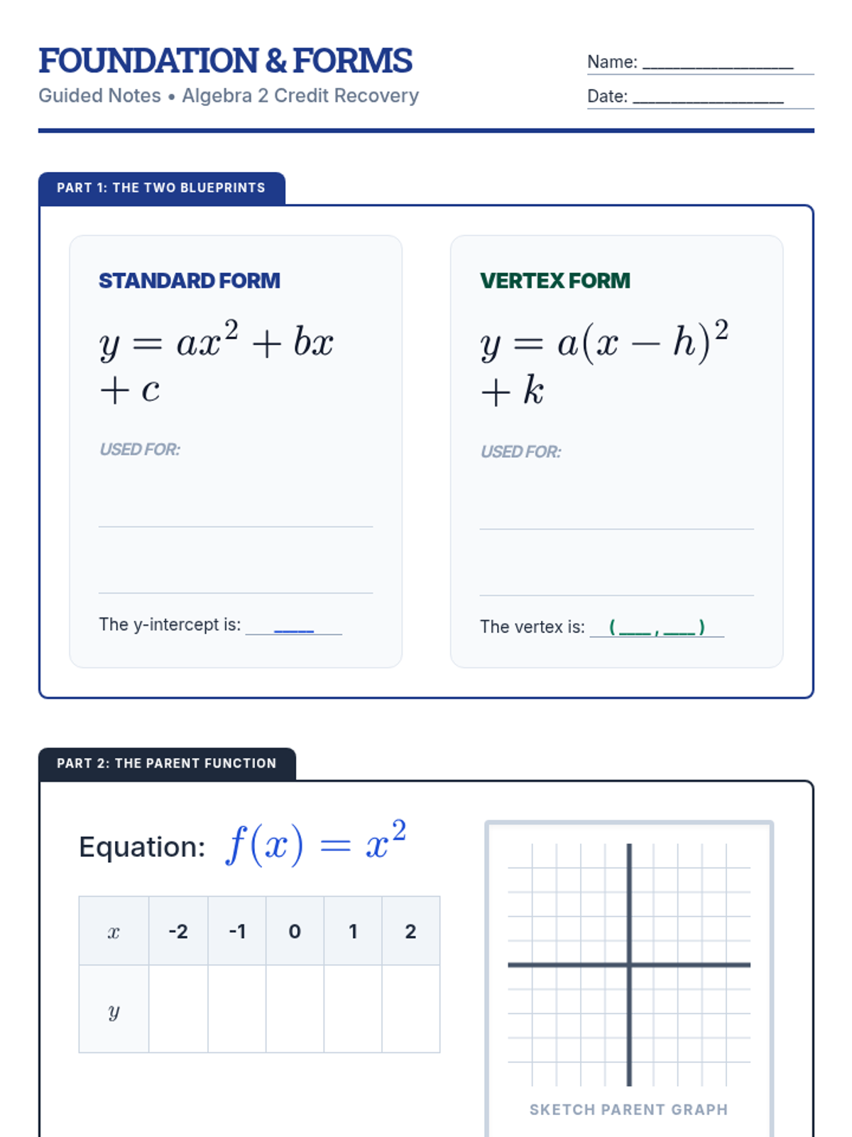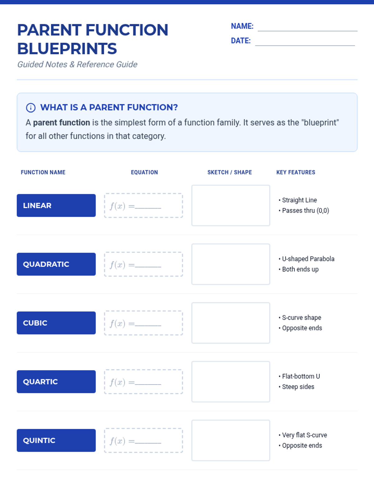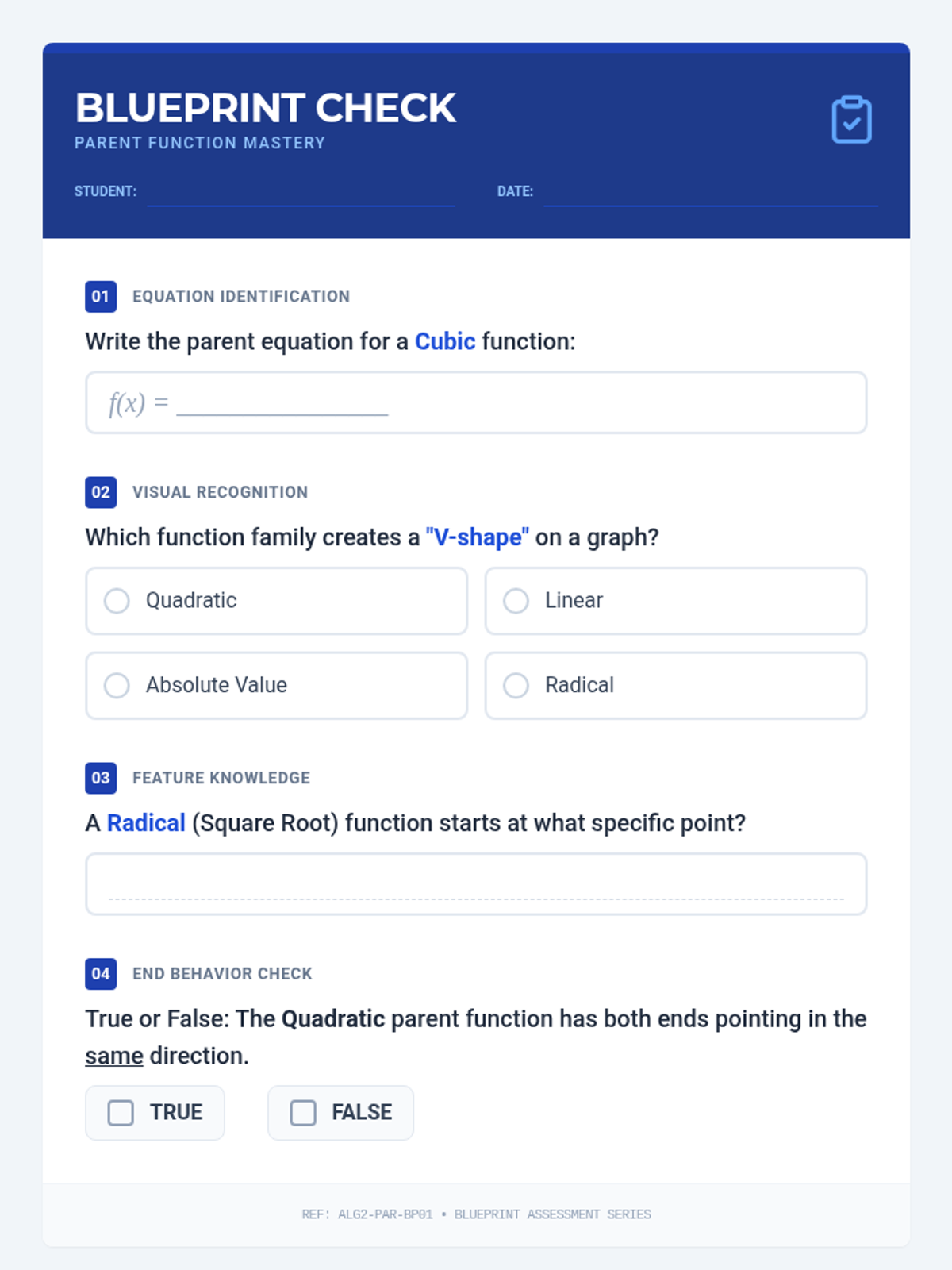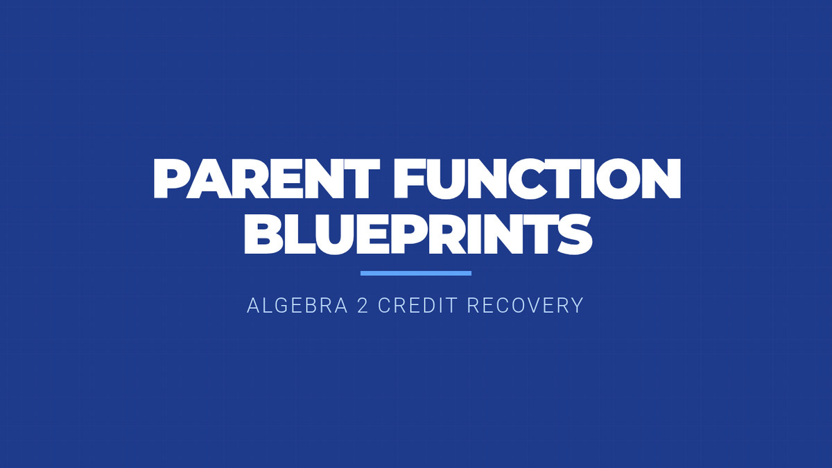 A comprehensive lesson on core parent functions for Algebra 2, focusing on identification, key features, and visual recognition using a blueprint theme.