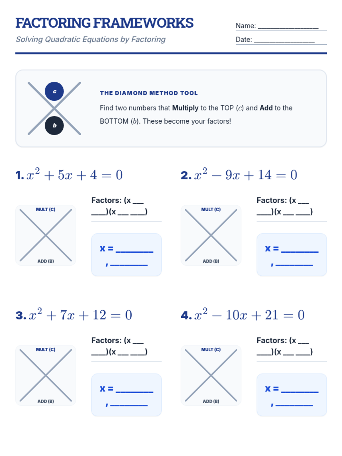 Students learn to solve quadratic equations by factoring trinomials and using the Zero Product Property, focusing on real roots and equations in standard form.