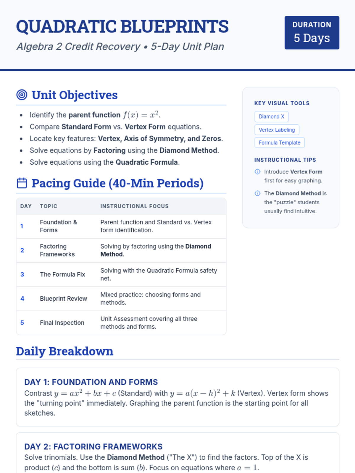 A comprehensive review of all three methods (graphing, factoring, formula) and identifying key features to prepare for the unit assessment.