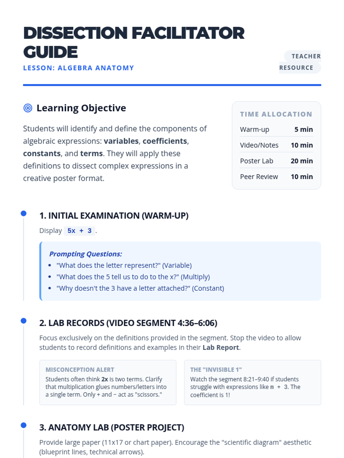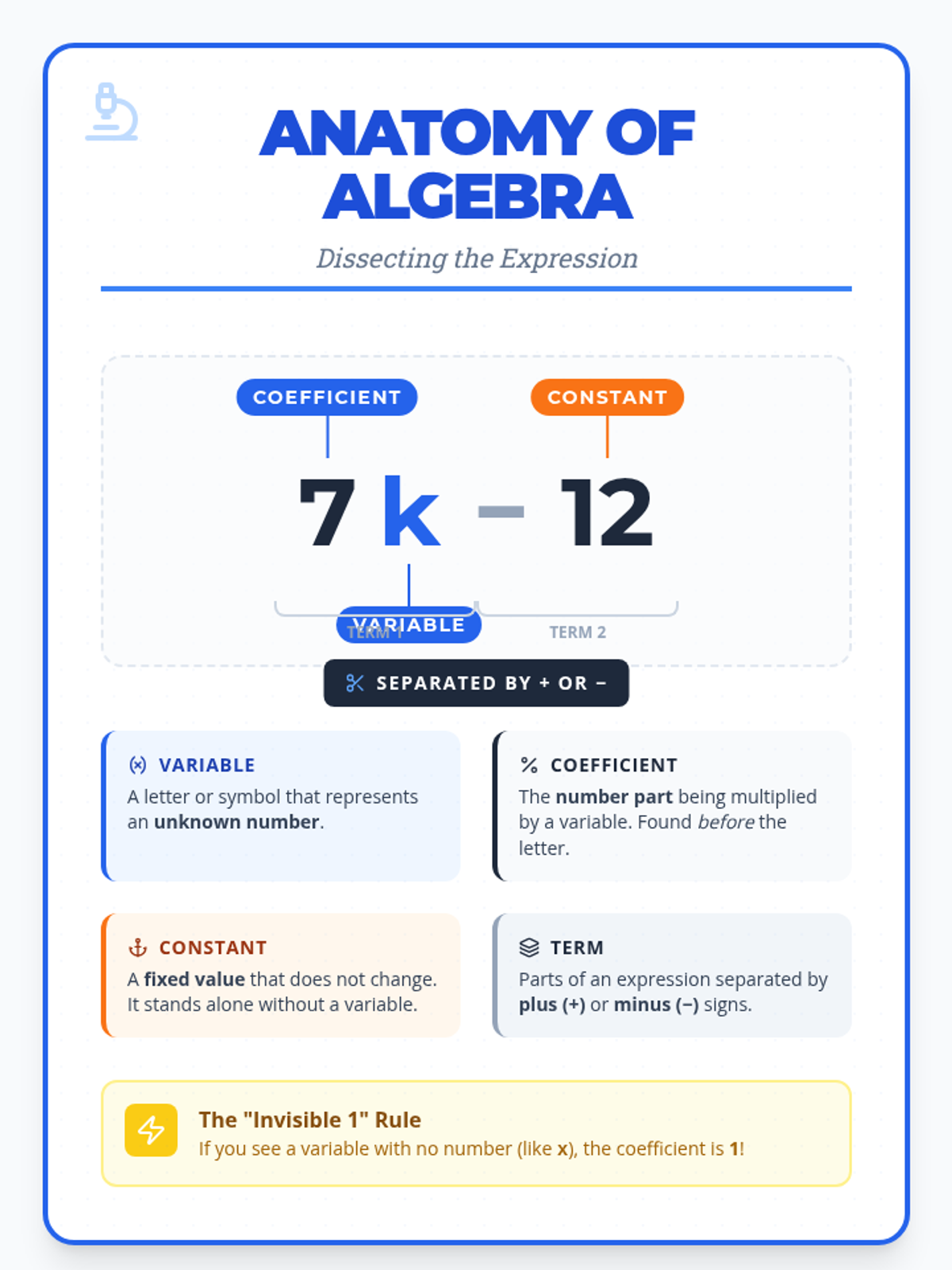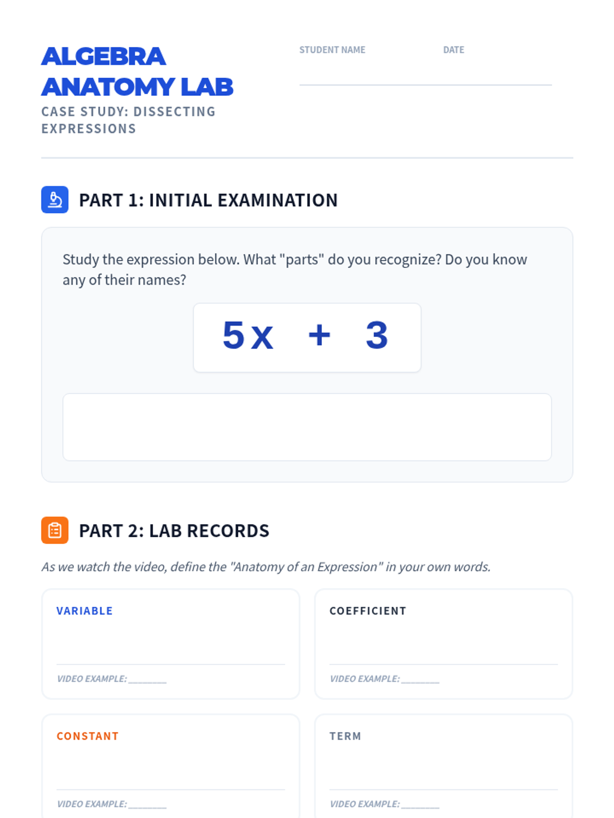 Students will learn to identify and define the key components of algebraic expressions—variables, coefficients, constants, and terms—through video analysis and a creative 'Anatomy of Algebra' poster project.