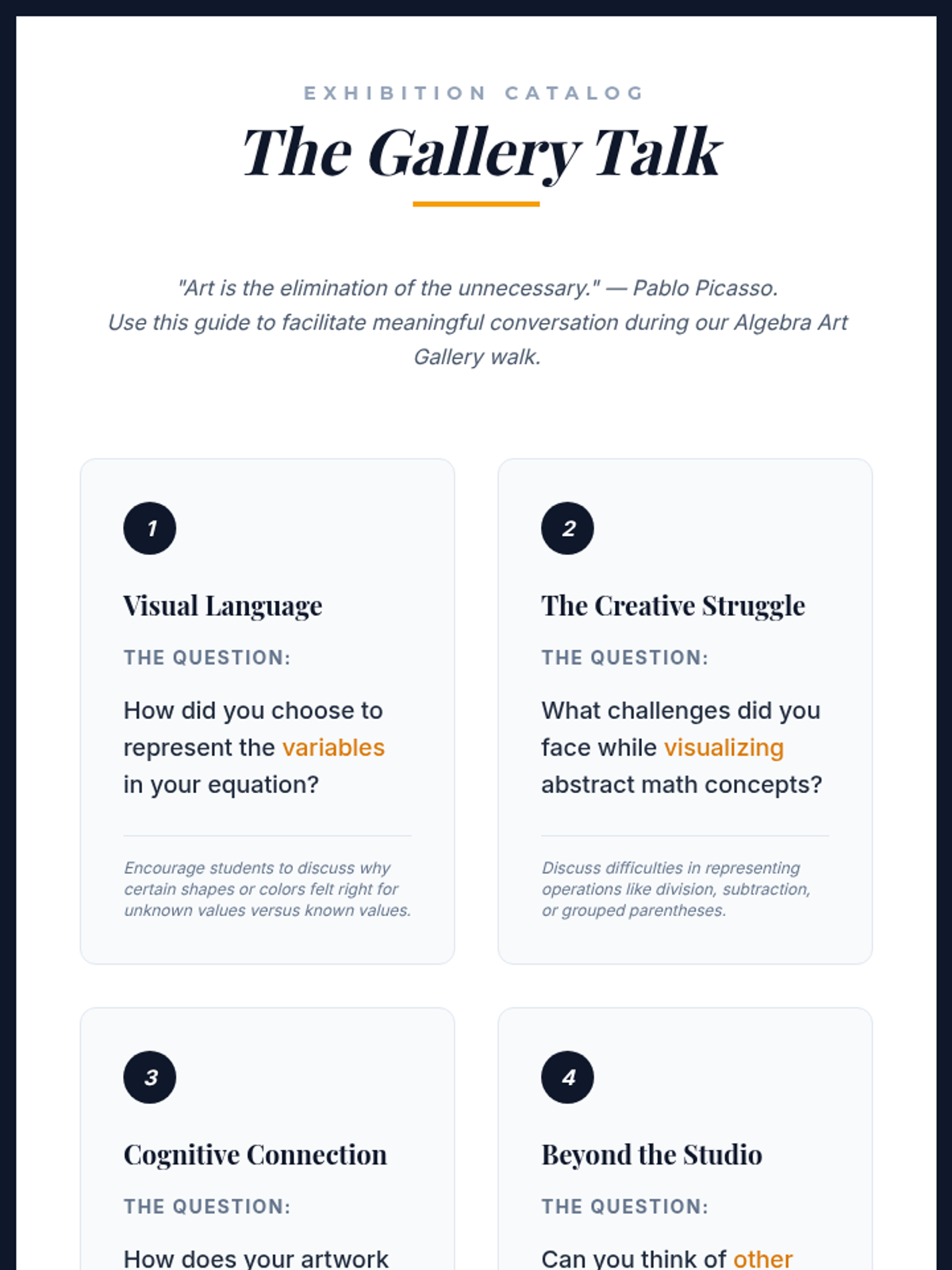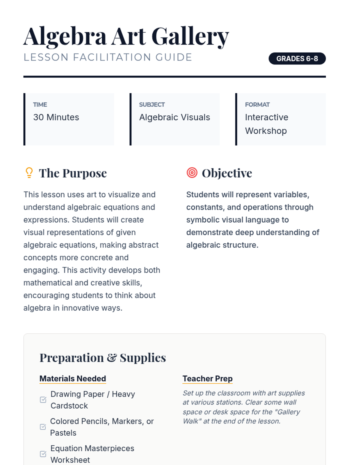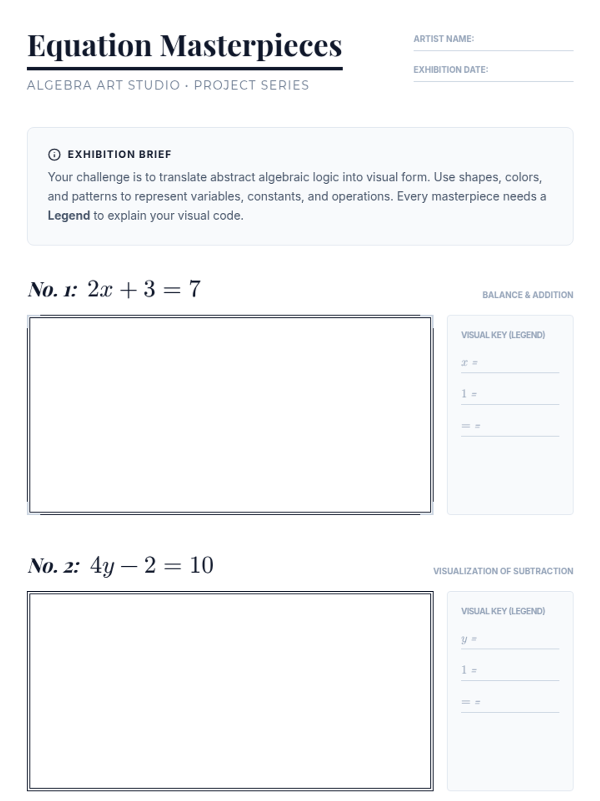 A creative lesson where students visualize algebraic equations and expressions through art, turning abstract math into concrete masterpieces.