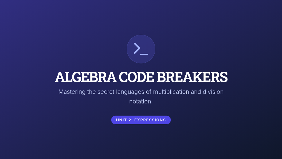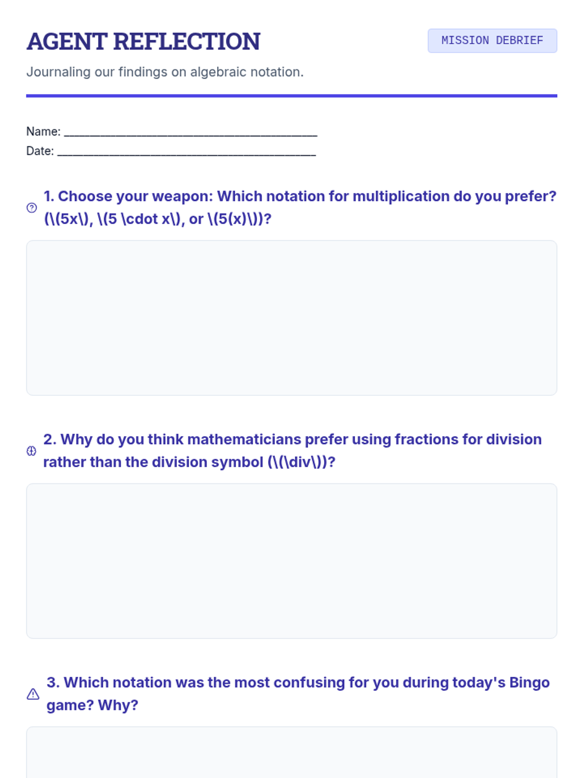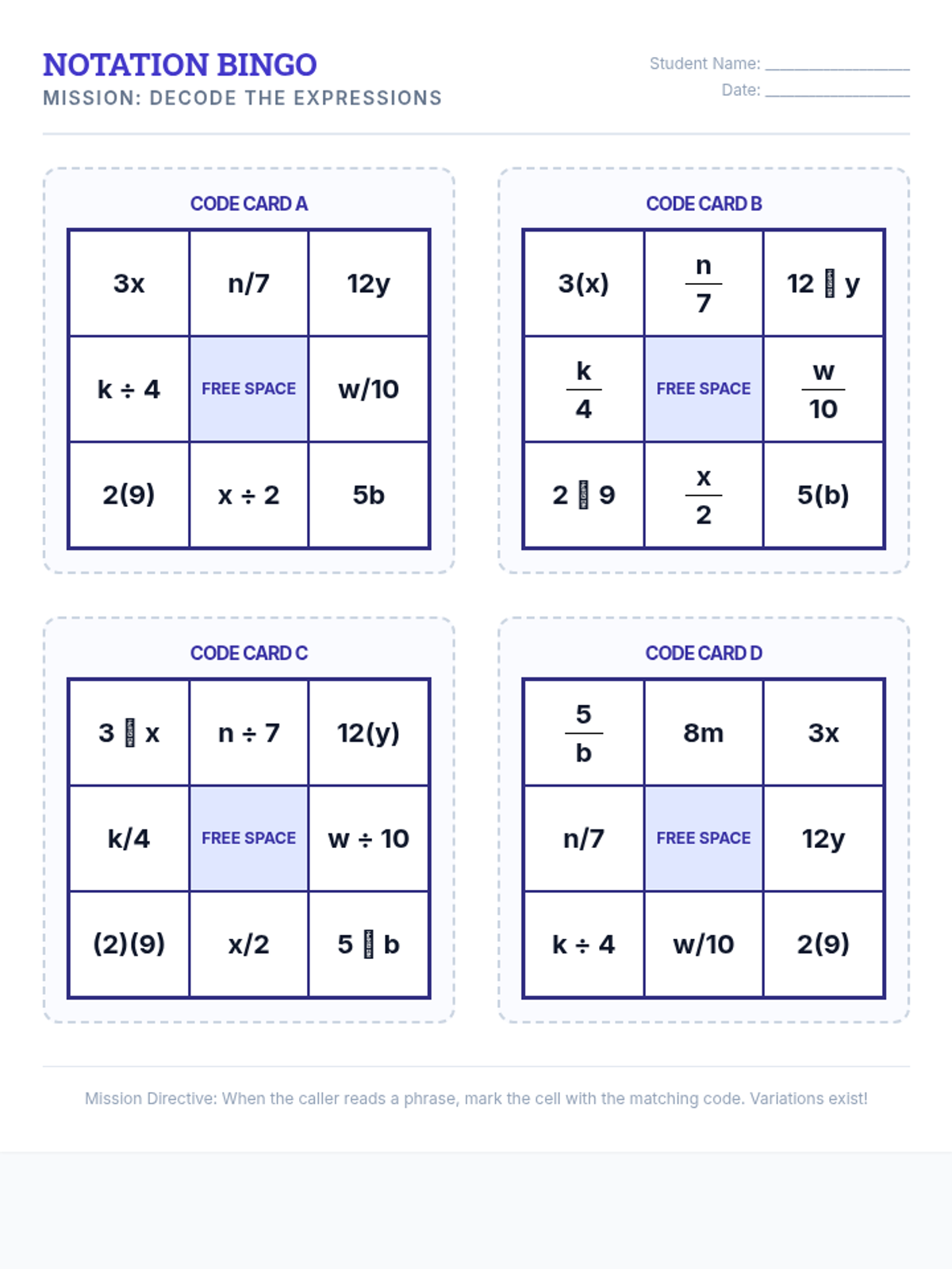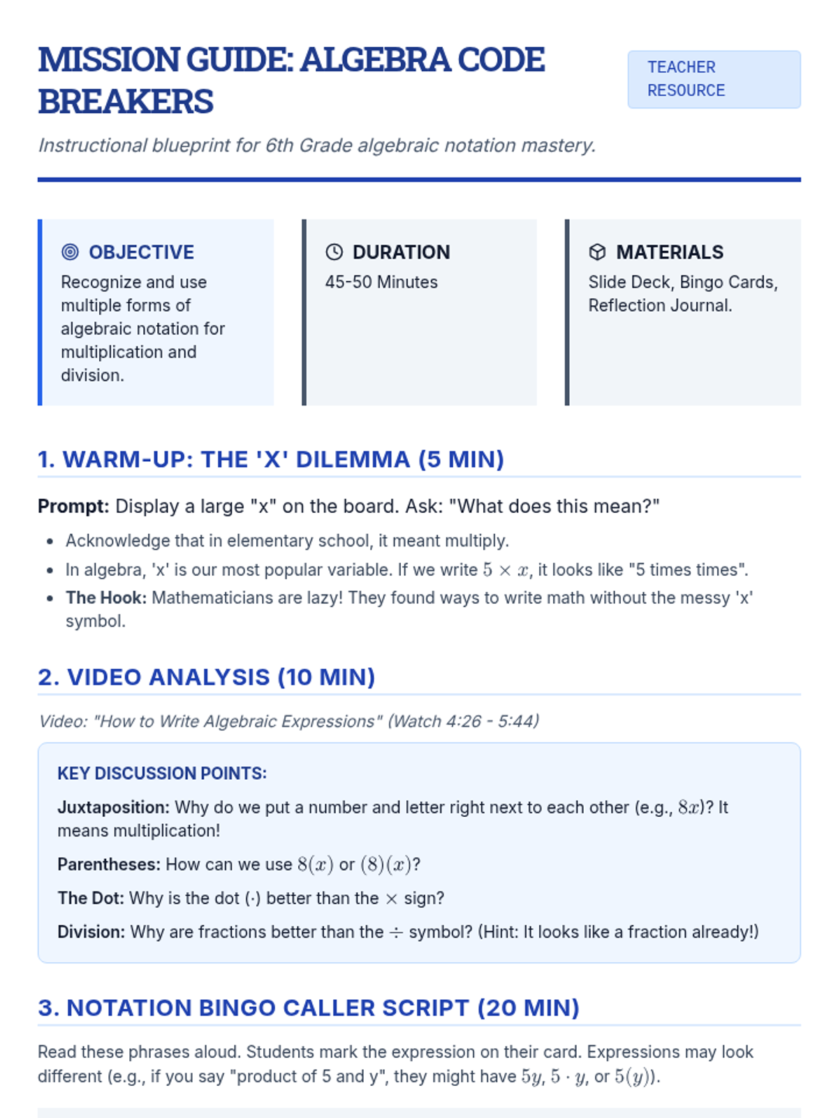A lesson focused on deciphering and using algebraic notation for multiplication and division, moving beyond the traditional 'x' and division symbols. Students explore juxtaposition, dots, parentheses, and fraction bars through a video-guided discussion and an interactive Bingo game.