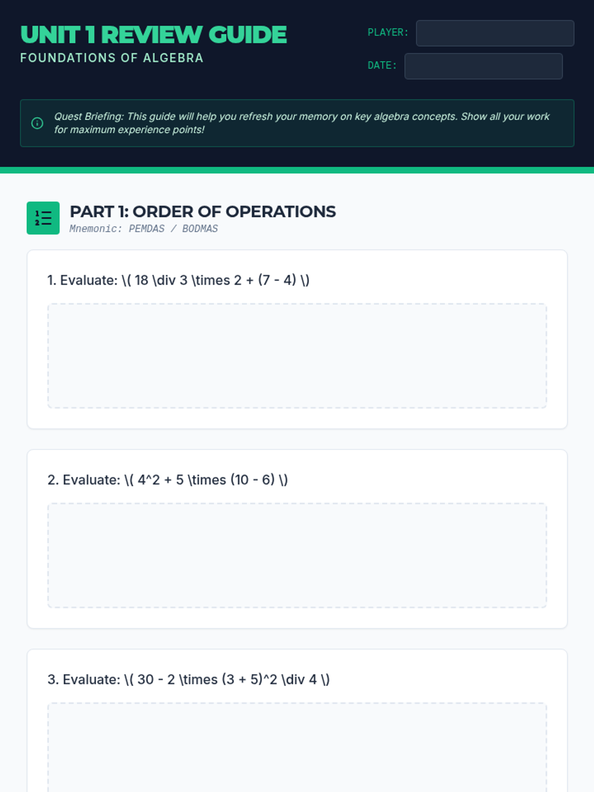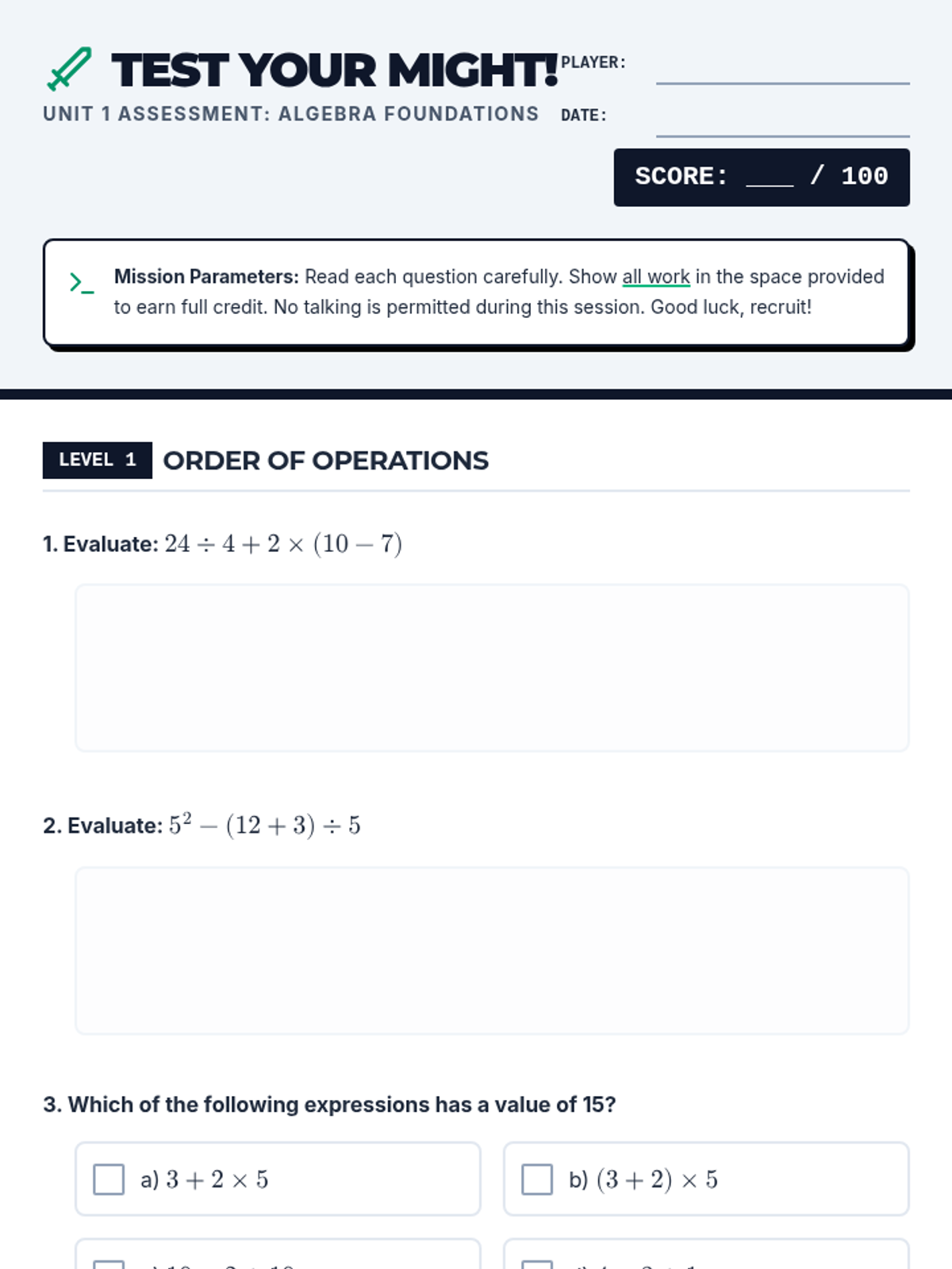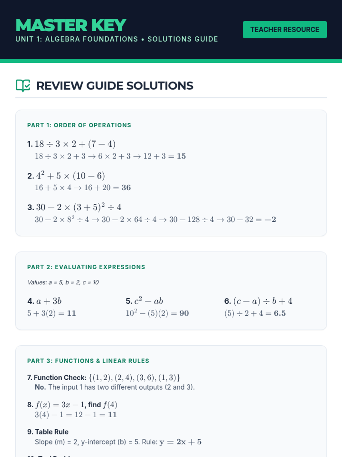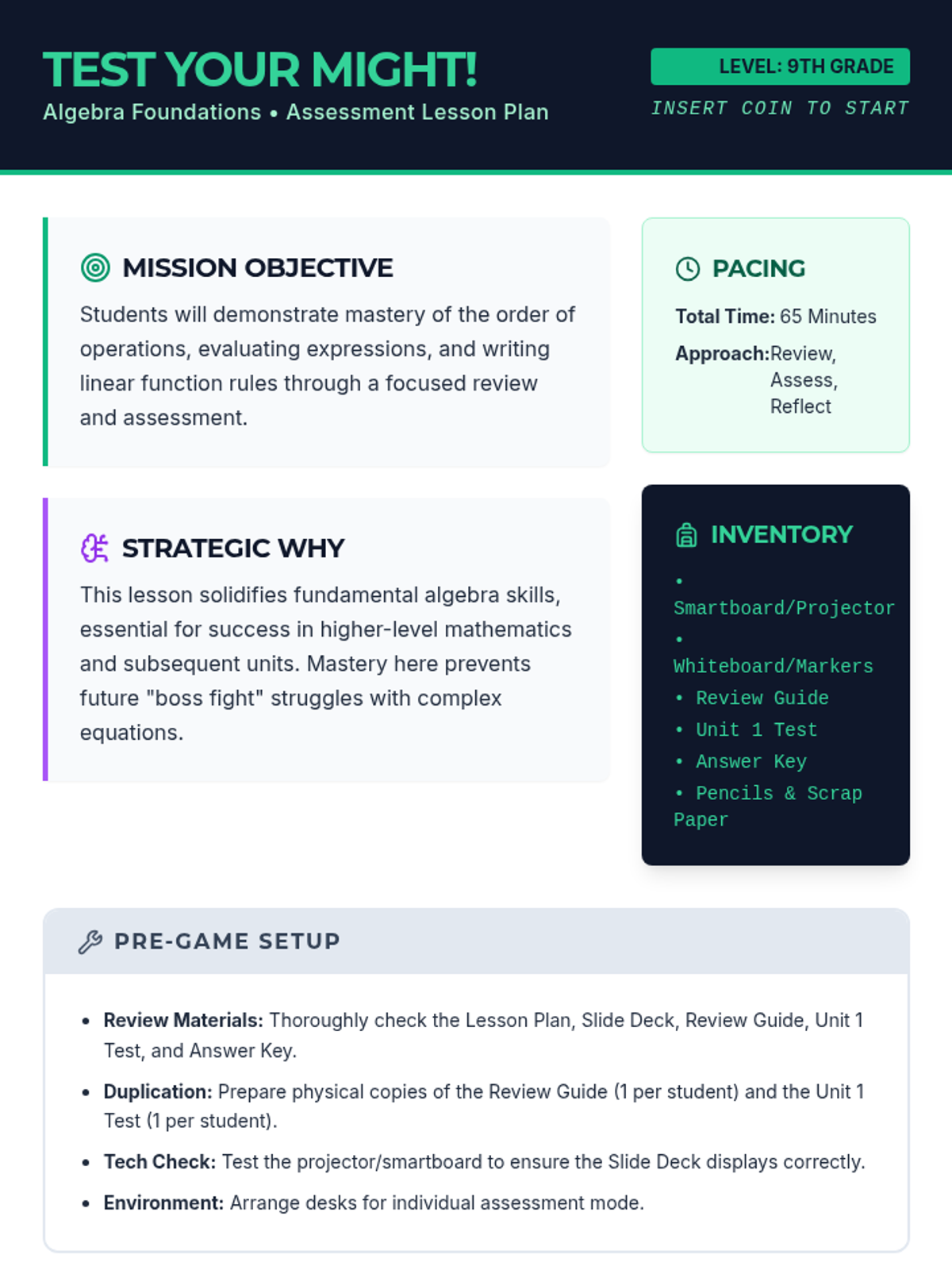 This lesson assesses 9th-grade students' understanding of foundational algebra concepts, including the order of operations, evaluating expressions, and writing linear function rules. It's designed to build a strong base for future math topics through review and assessment.