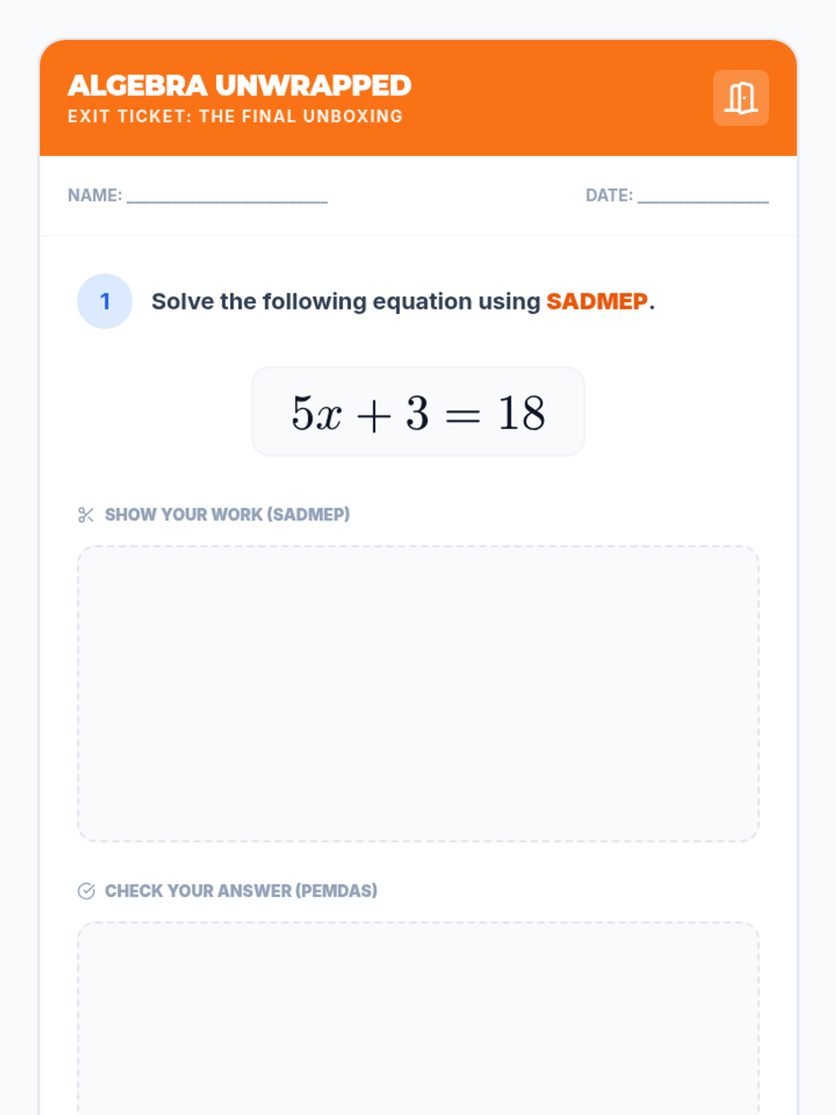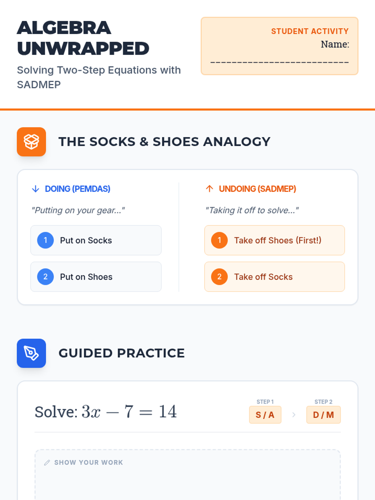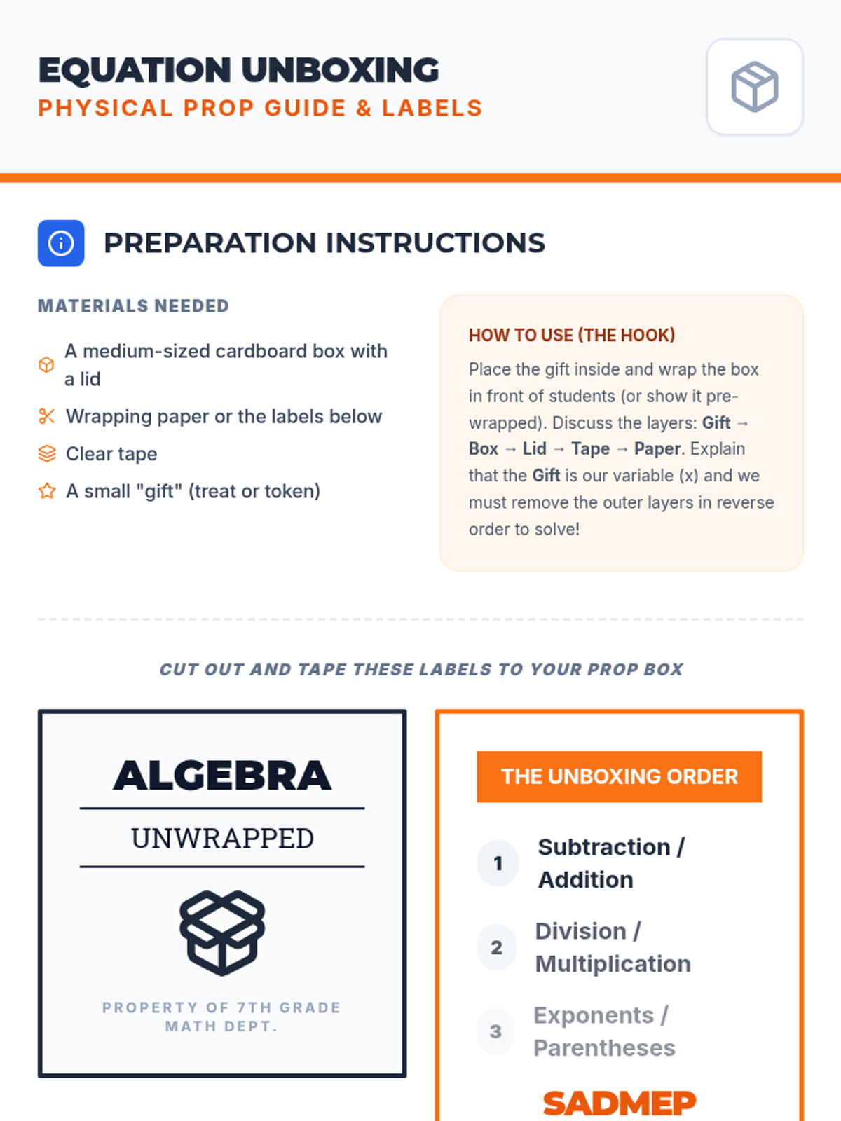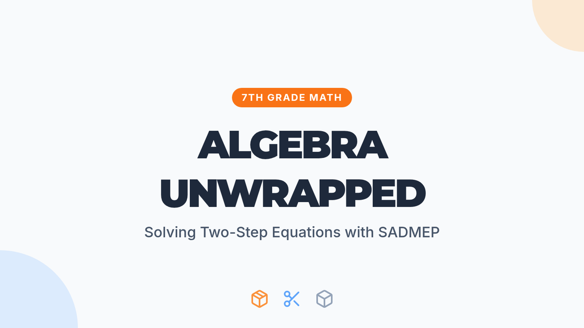 A comprehensive lesson introducing students to solving two-step linear equations using the SADMEP (reverse PEMDAS) method through an 'unboxing' analogy.