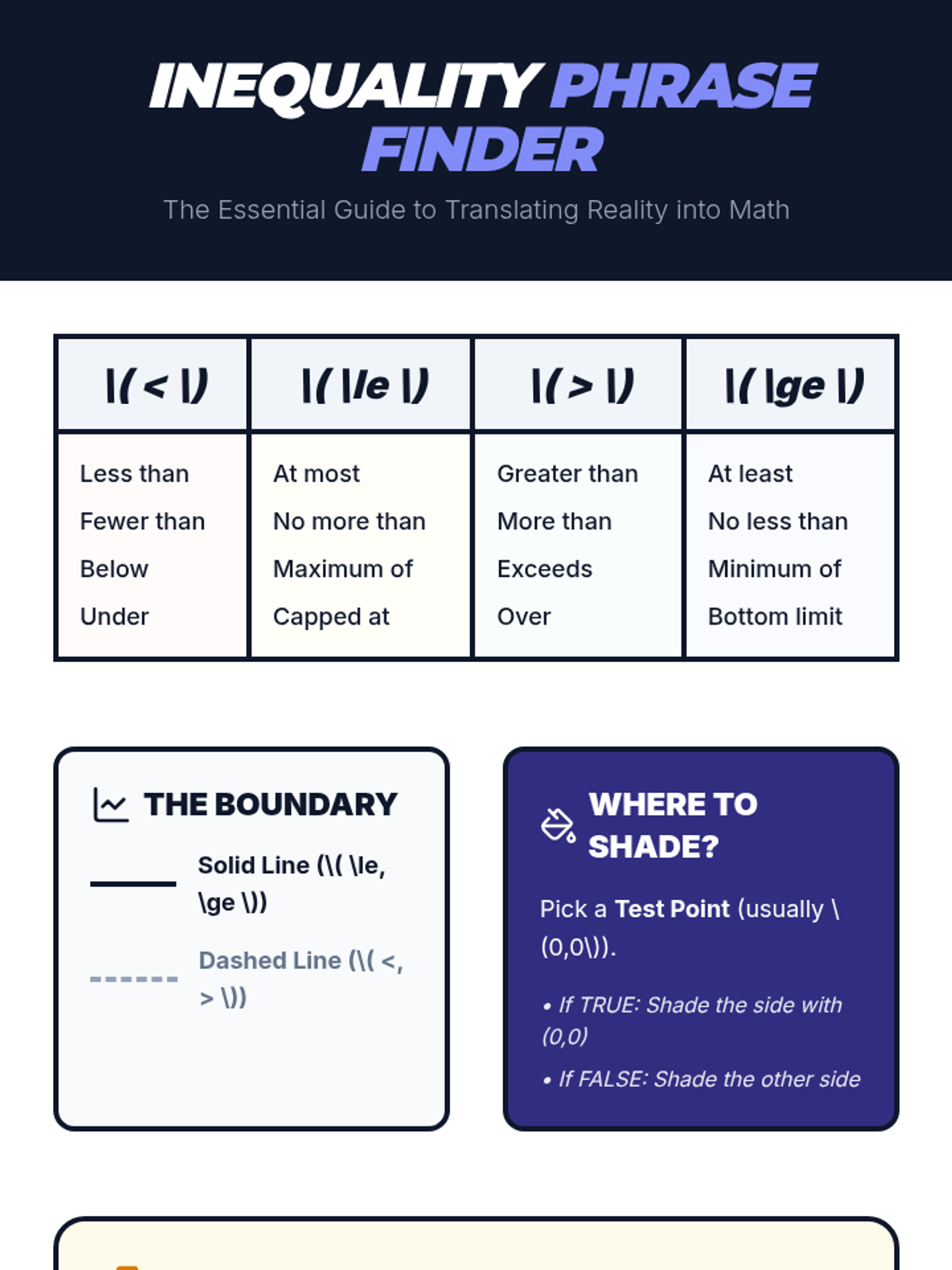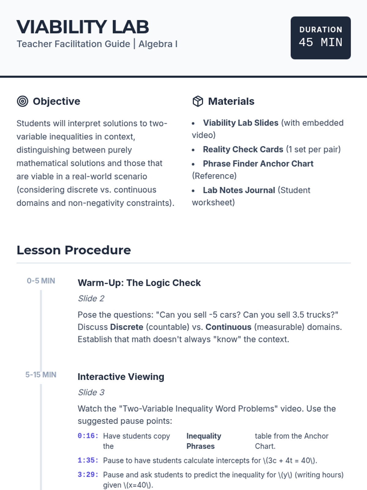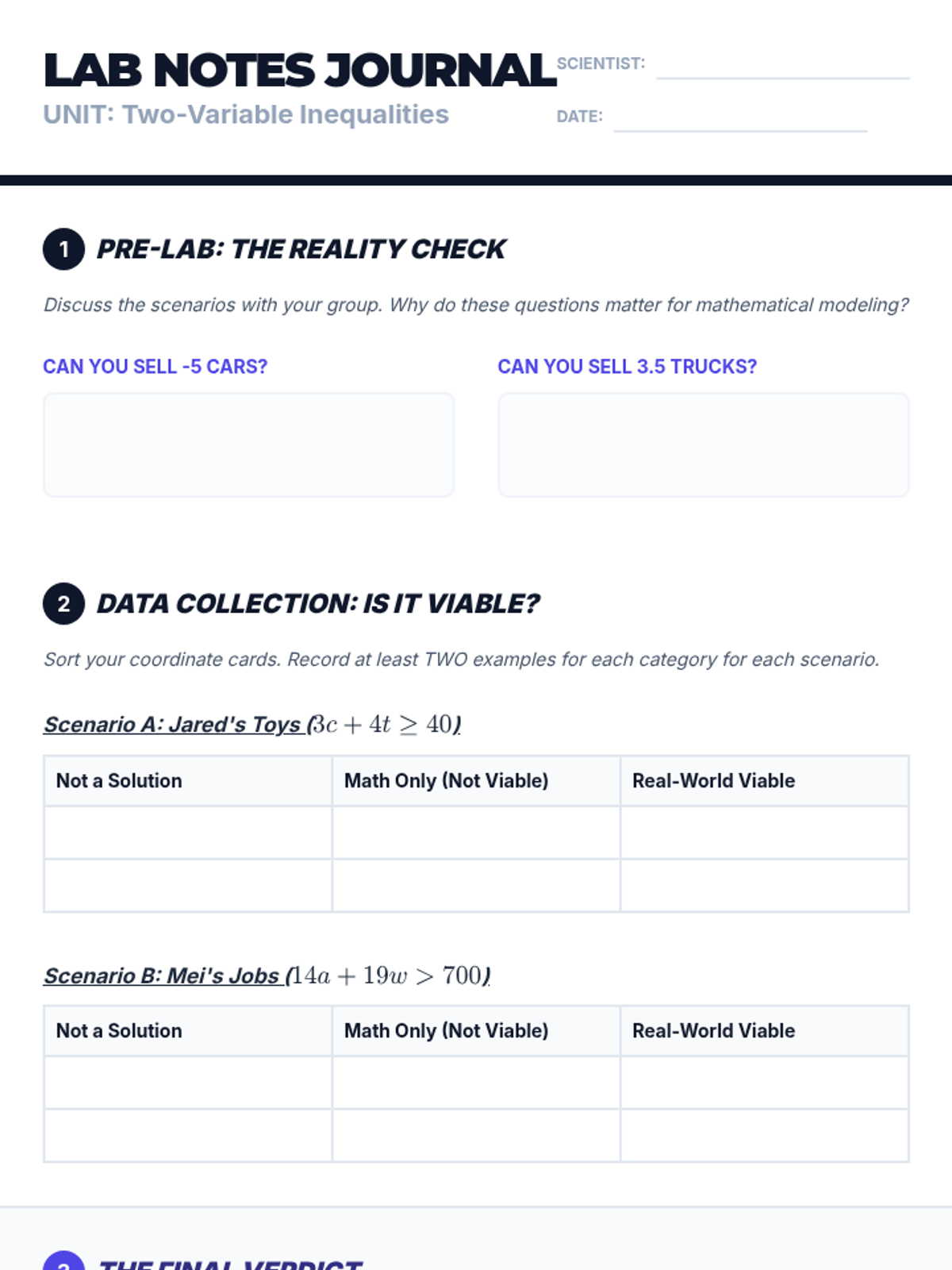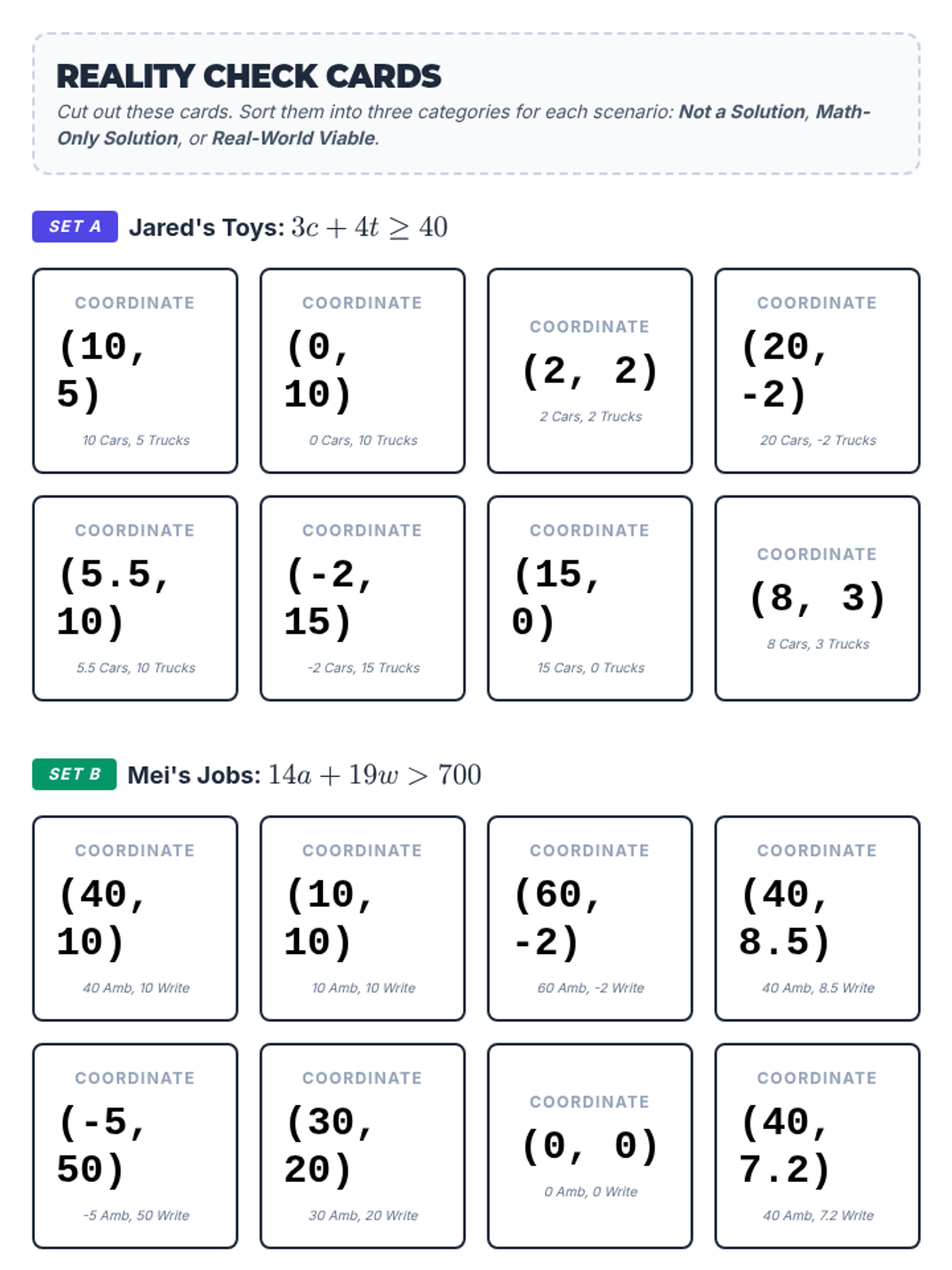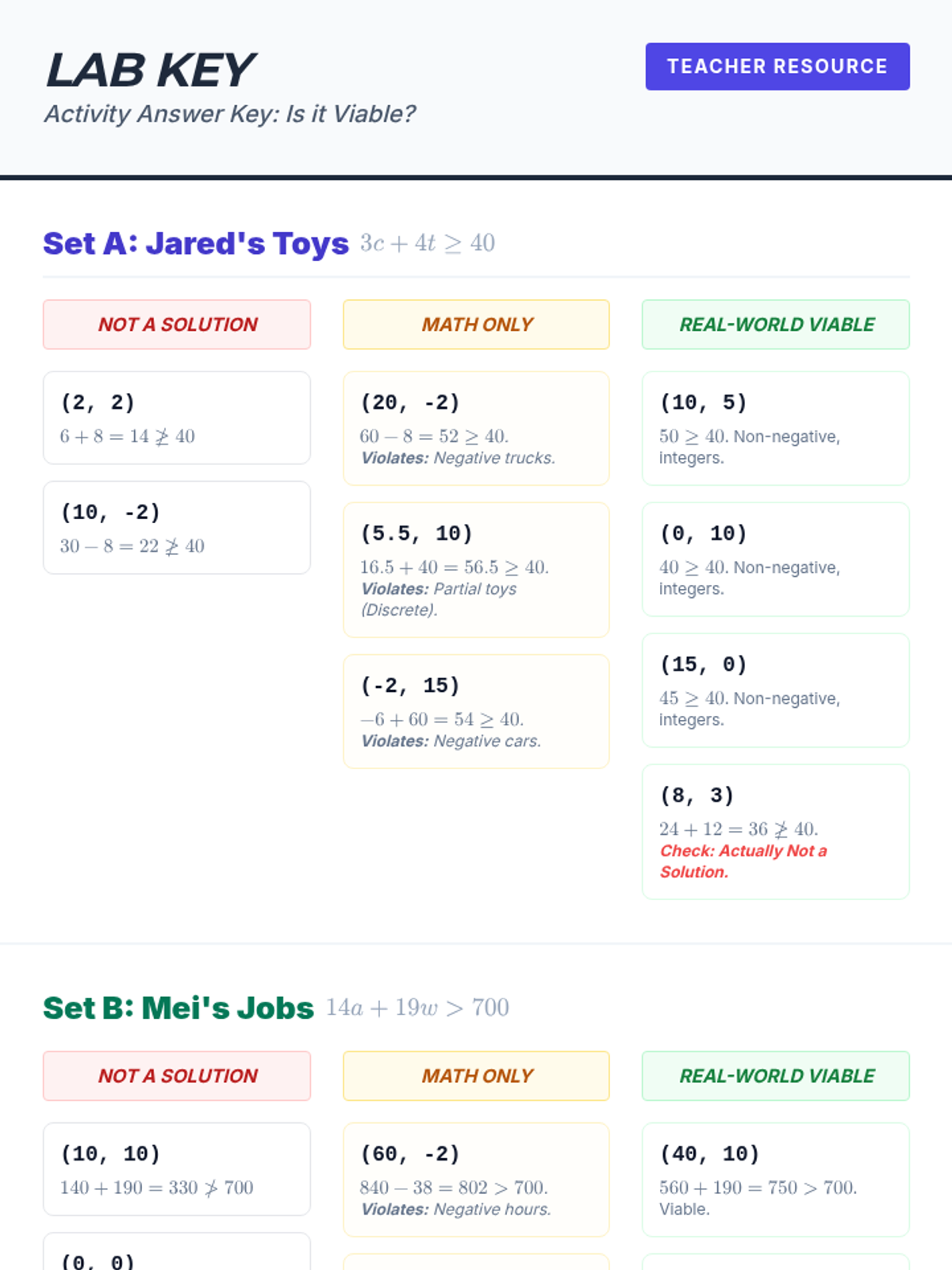 A lesson focusing on interpreting two-variable inequalities in real-world contexts, helping students distinguish between mathematical solutions and viable practical solutions.