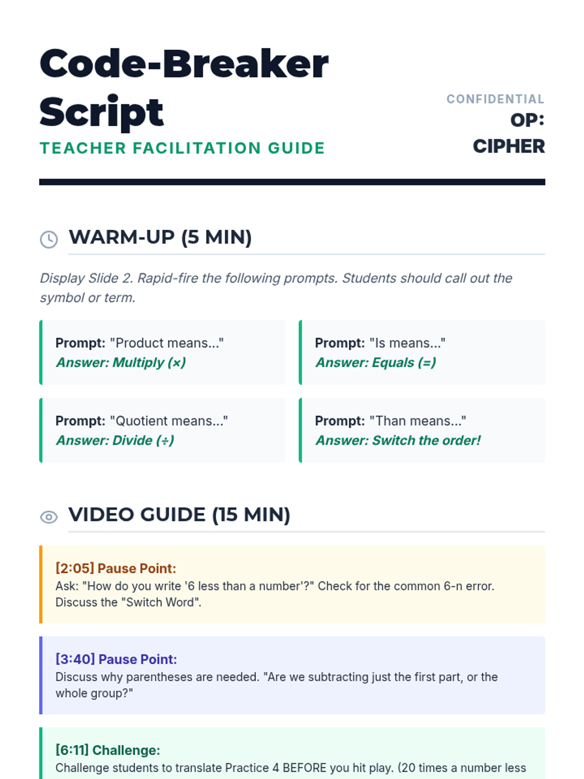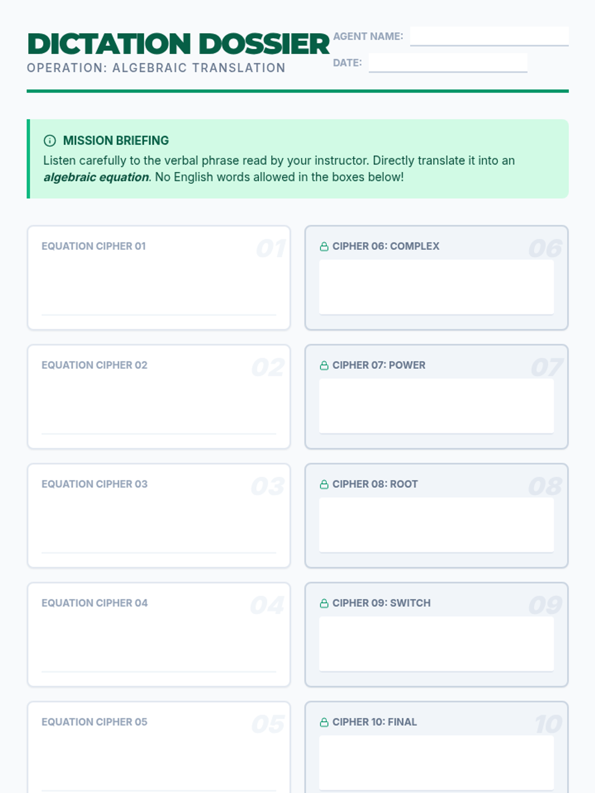 A high-energy lesson where Algebra 1 students learn to translate complex verbal sentences into algebraic equations through a 'dictation' challenge and peer-decoding activity.
