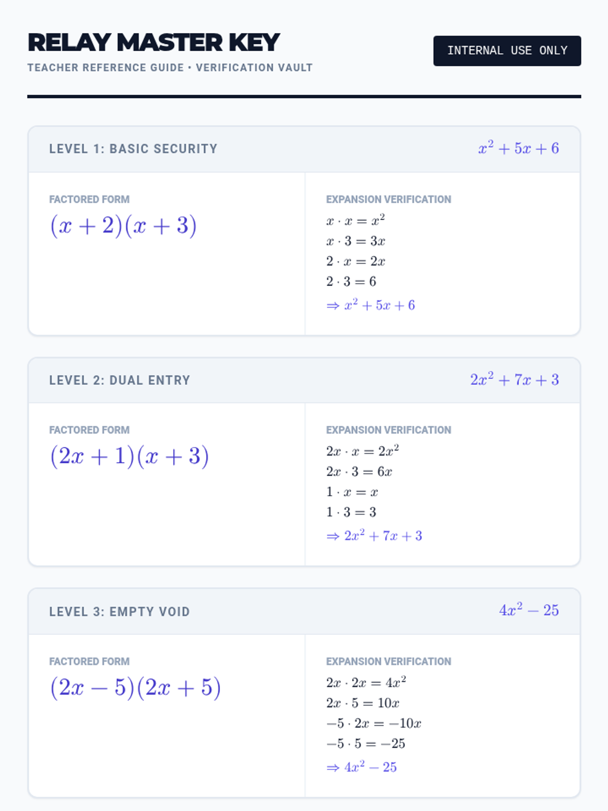 Students will learn to verify algebraic equivalence by expanding factored expressions back into their original polynomial form, using FOIL and distribution techniques. The lesson features a video-based analysis of verification and a collaborative 'Factor & Check' relay activity.