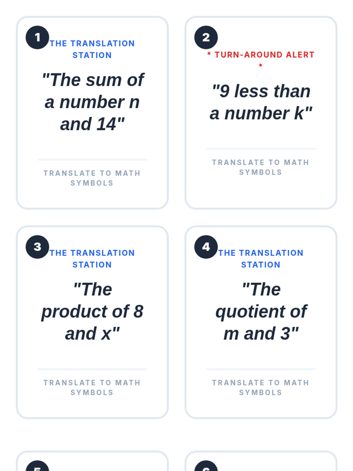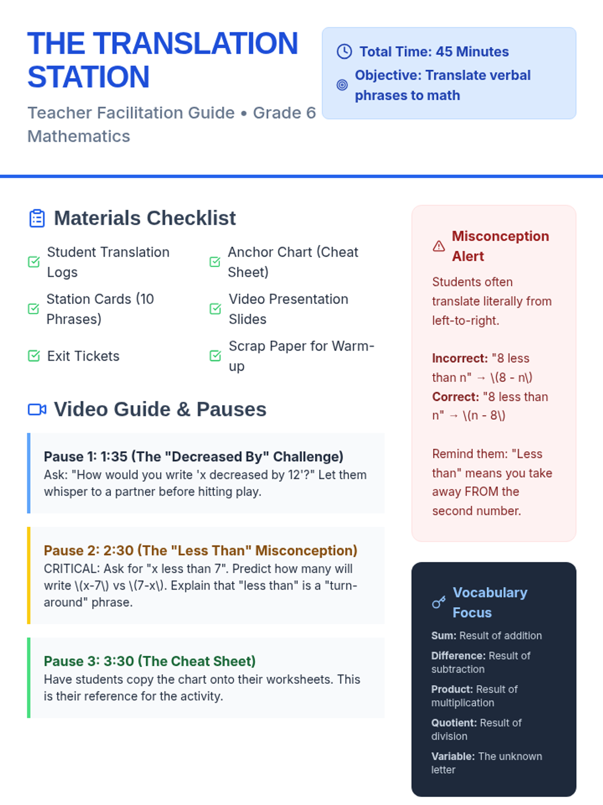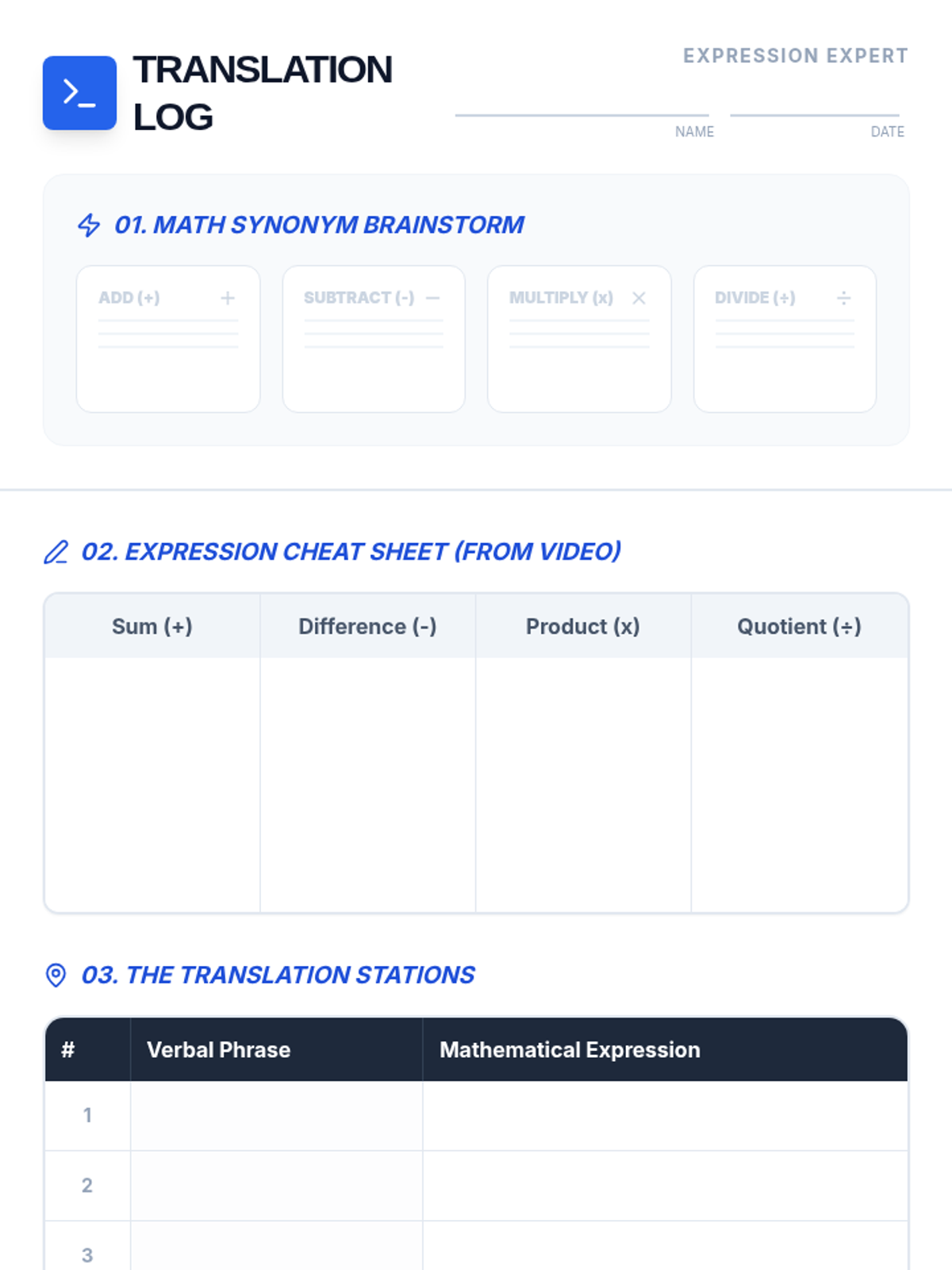 A 6th-grade math lesson focused on translating verbal phrases into algebraic expressions using key operational vocabulary and a 'cheat sheet' approach. Students brainstorm synonyms, watch a guided video, and rotate through stations to practice translation.