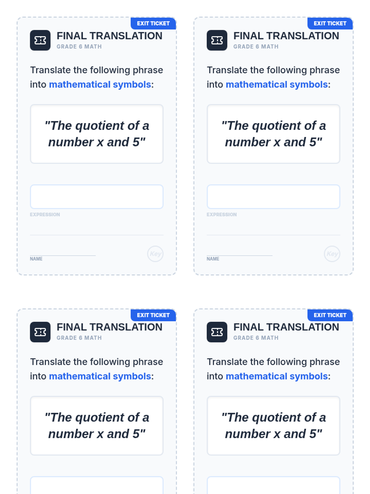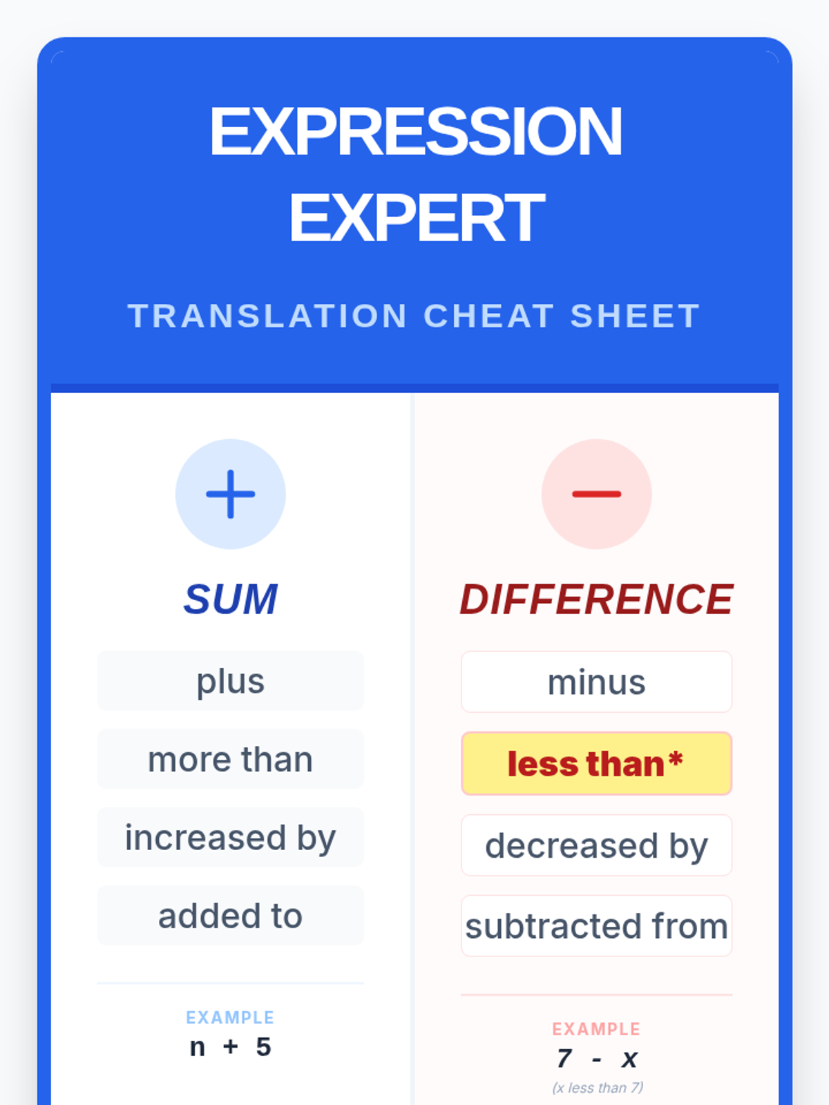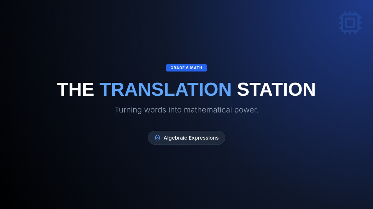 A 6th-grade math lesson focused on translating verbal phrases into algebraic expressions using key operational vocabulary and a 'cheat sheet' approach. Students brainstorm synonyms, watch a guided video, and rotate through stations to practice translation.