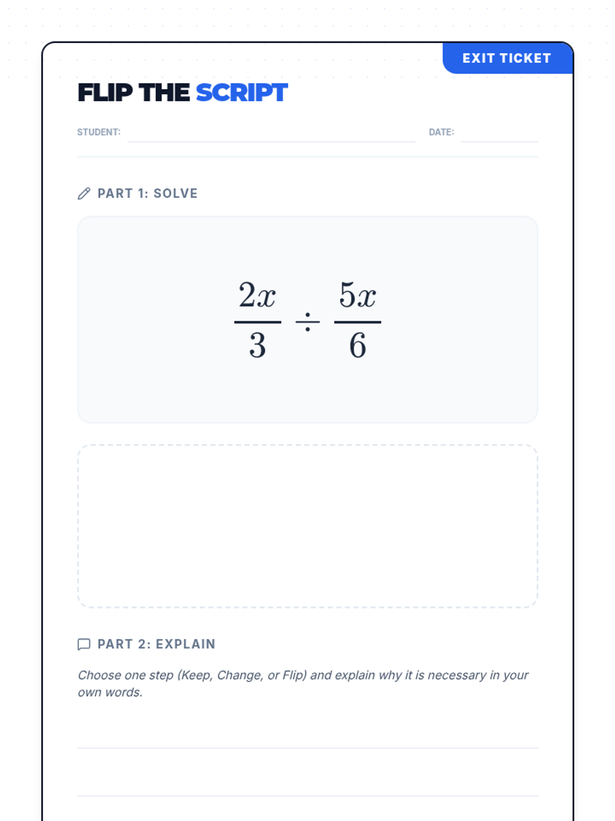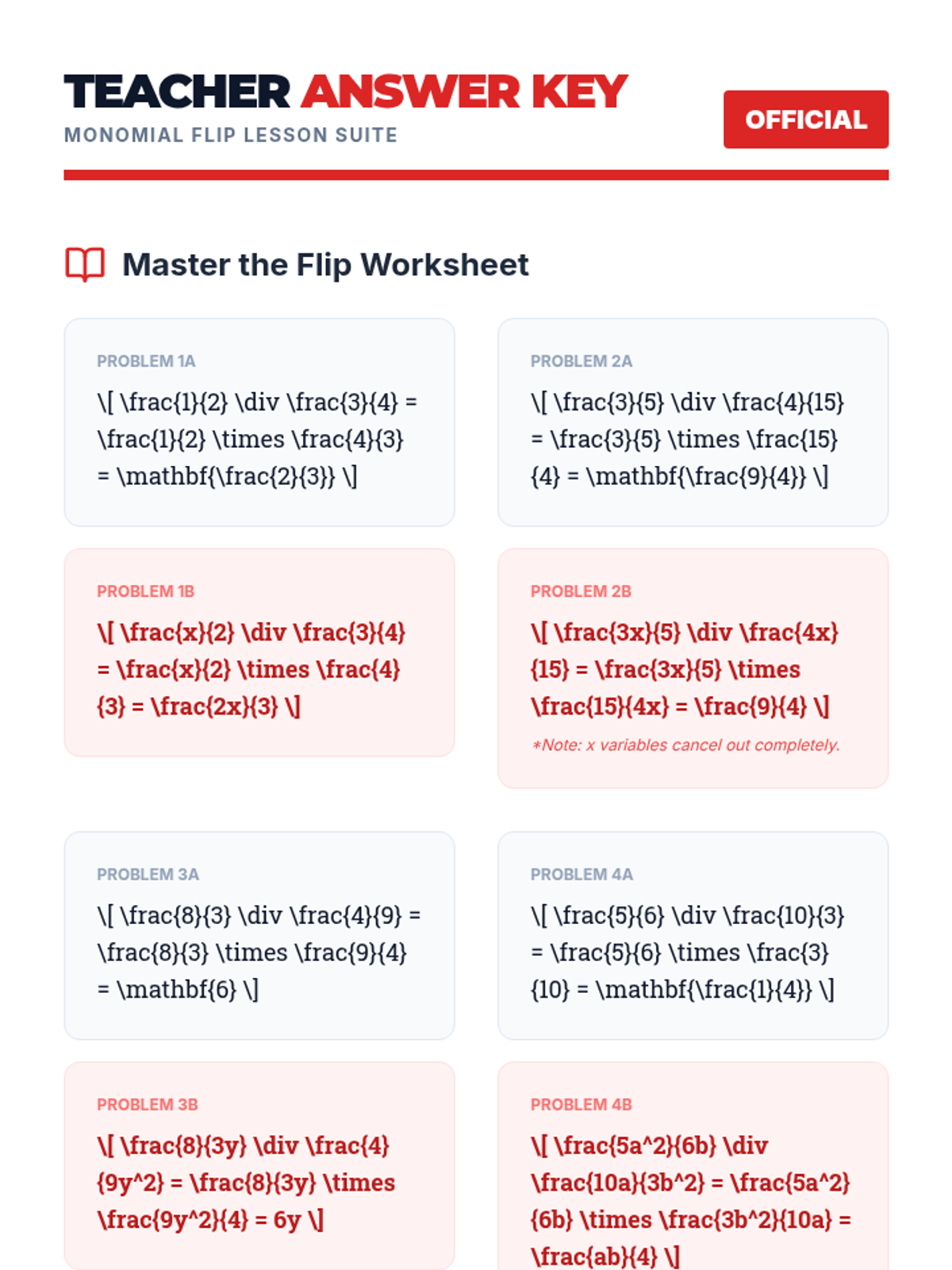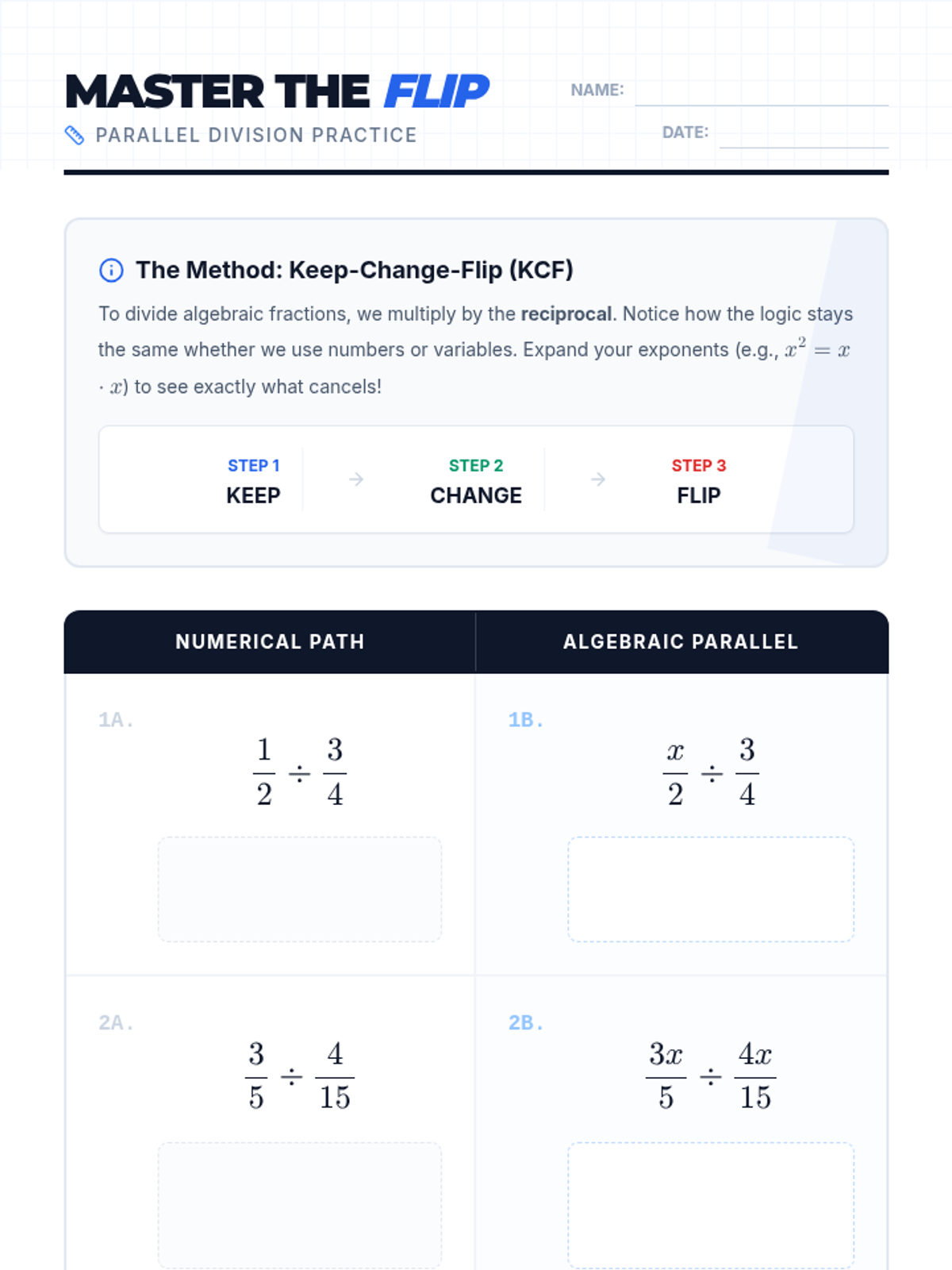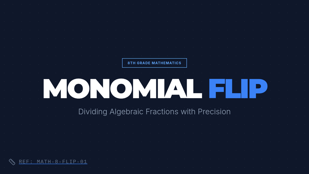 Students will master the 'Keep-Change-Flip' rule for dividing monomial algebraic fractions through parallel arithmetic and algebraic practice. The lesson includes a video-based discussion and a structured worksheet comparing numerical and variable-based operations.