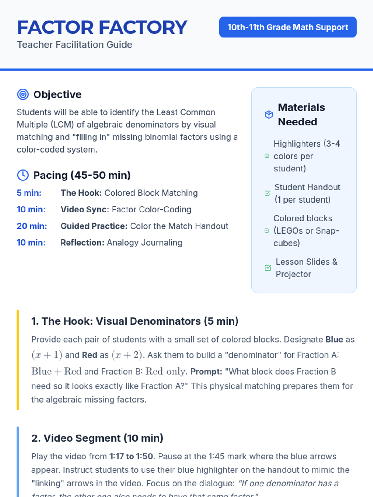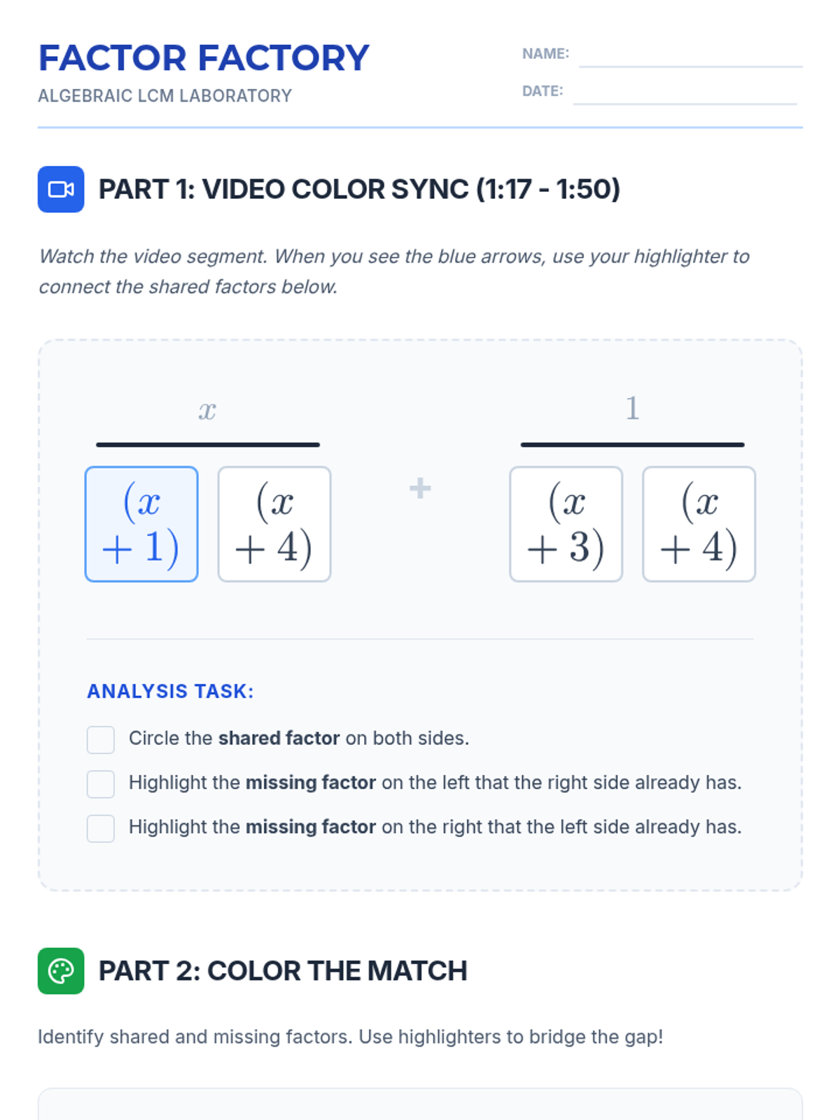 A remedial math support lesson focused on identifying the Least Common Multiple (LCM) in algebraic denominators using visual color-coding techniques. Students use highlighters to bridge the gap between numerical LCMs and algebraic factors.
