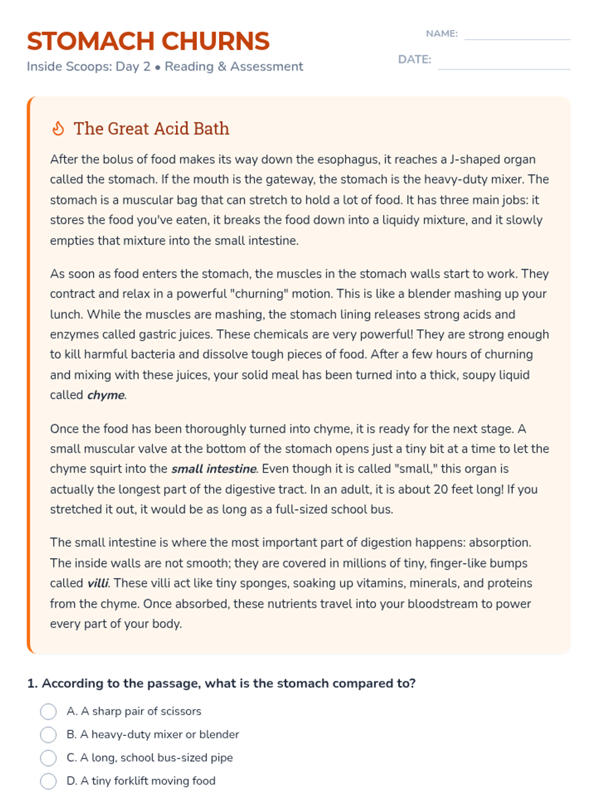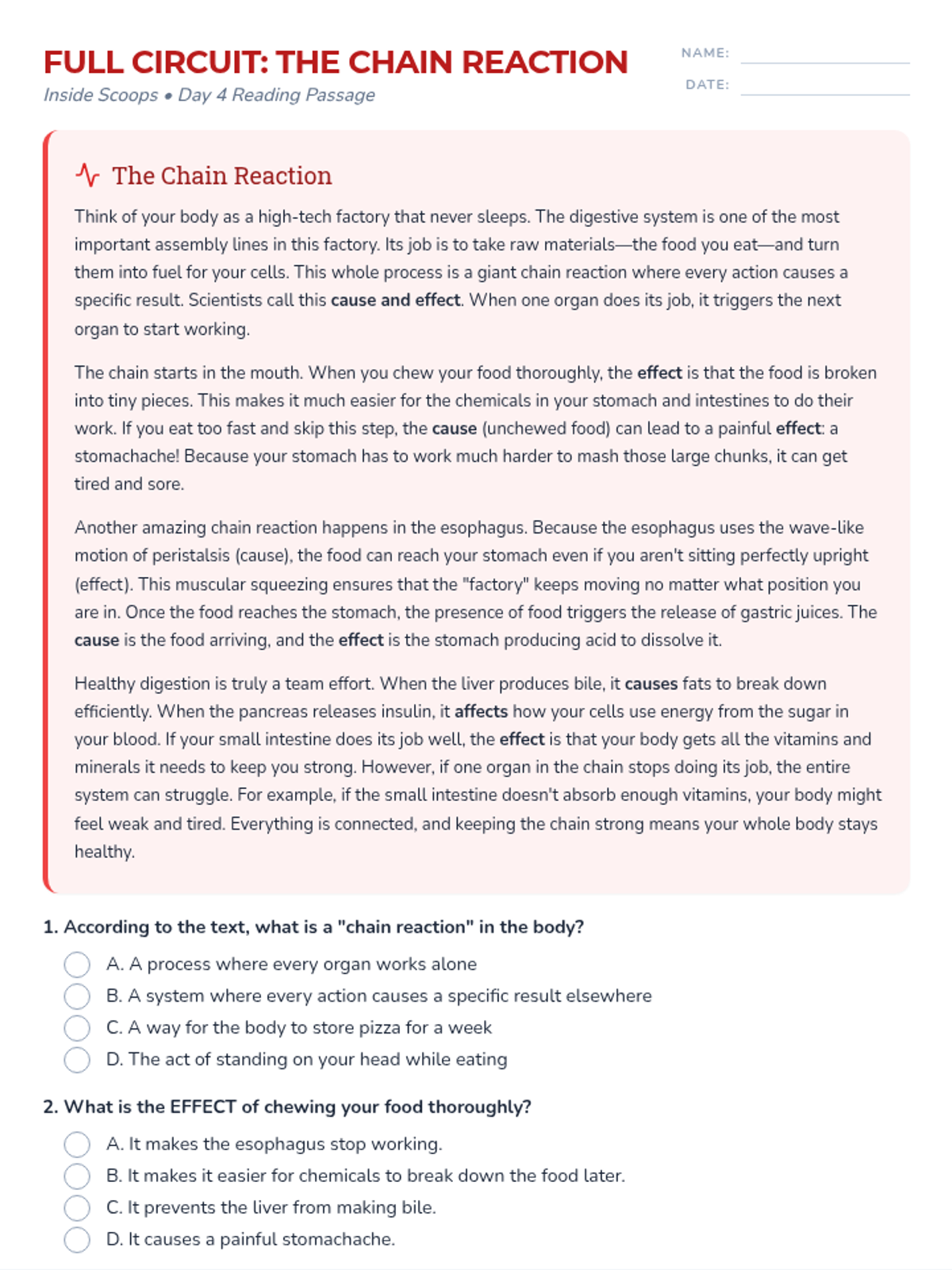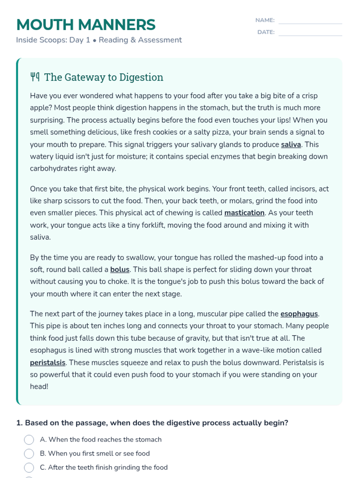 Focuses on the beginning of the digestive journey, exploring the roles of the mouth and esophagus through context clues practice.