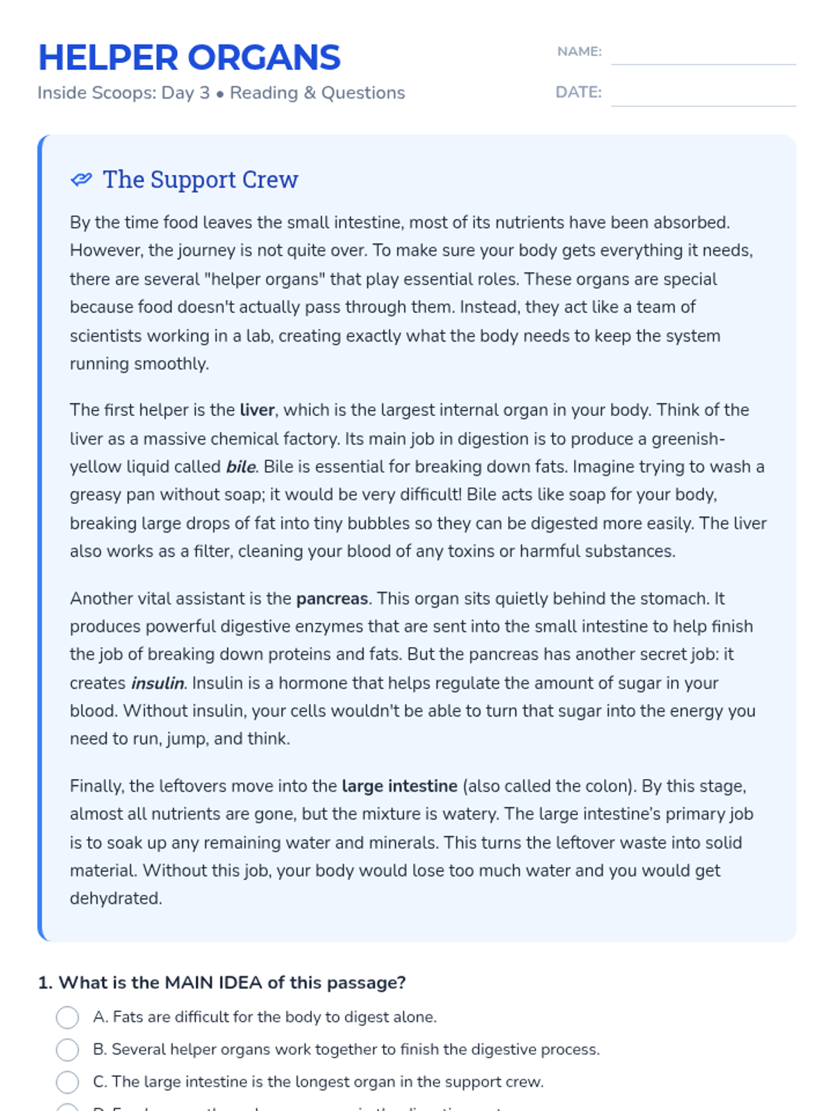Investigates the liver, pancreas, and large intestine, focusing on identifying main ideas and supporting details.
