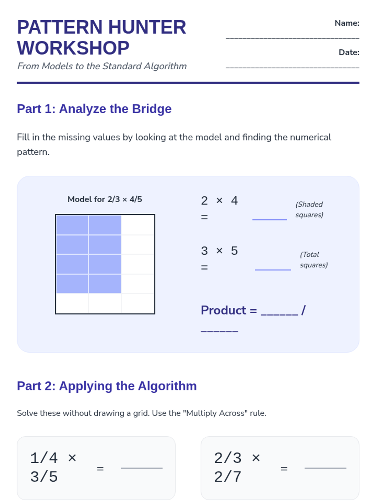 Students analyze their area models from previous lessons to find numerical patterns. They discover that multiplying numerators and denominators yields the same result as counting the shaded grid sections.