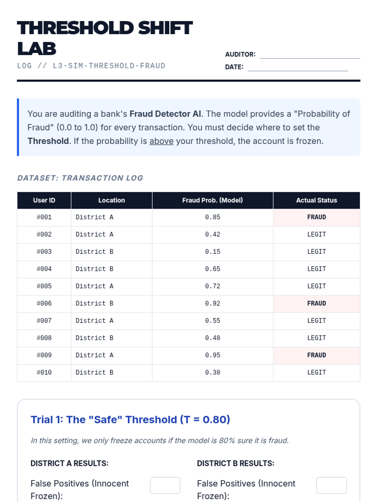 Students use simulation concepts to understand how changing model thresholds impacts different populations and explore auditing toolsets.