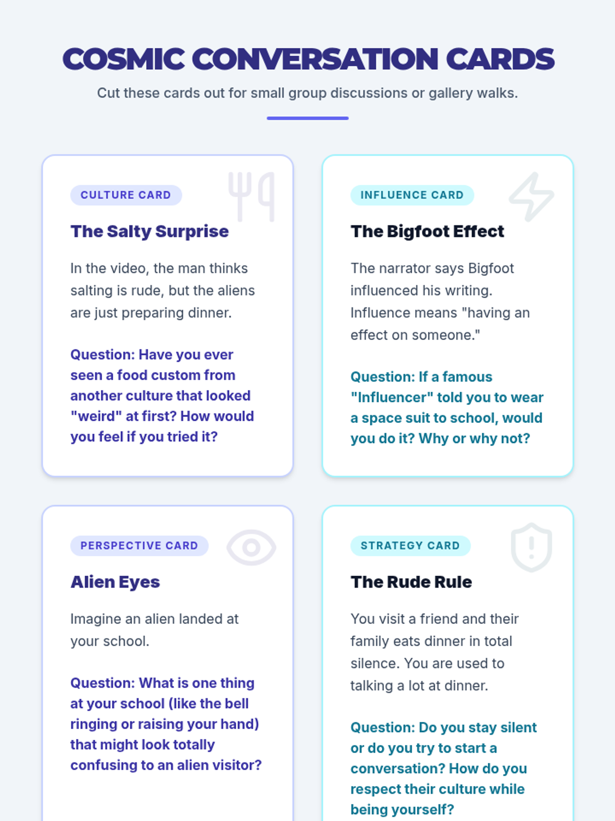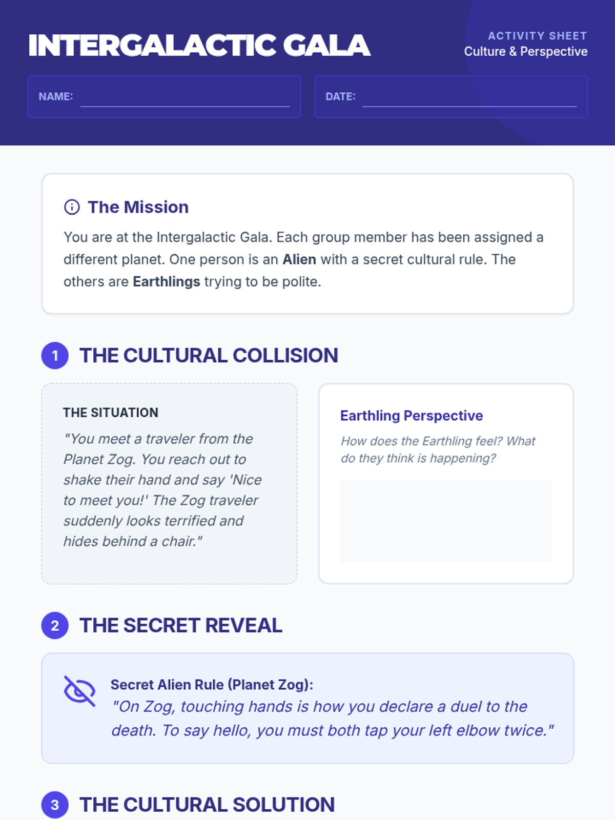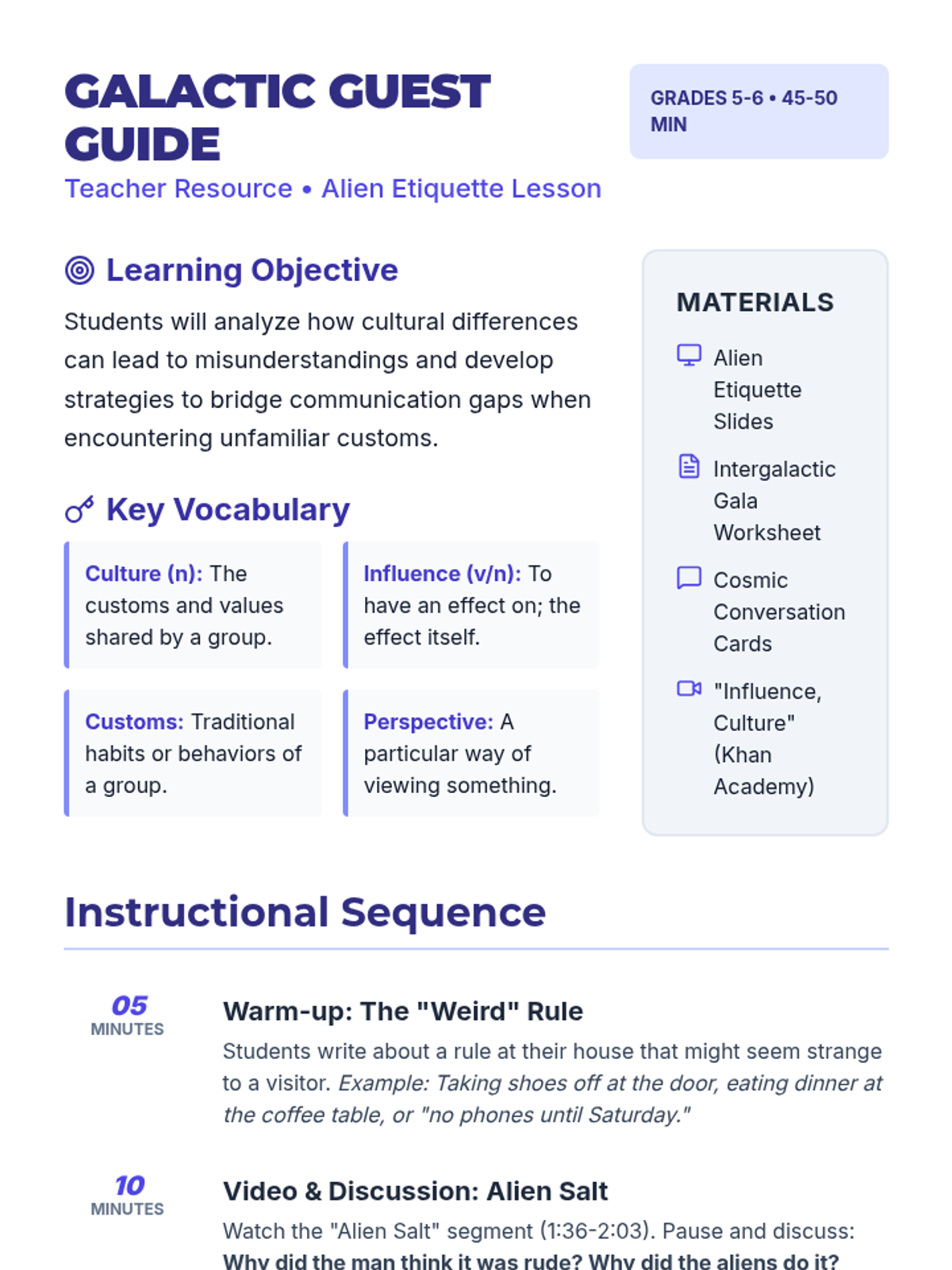 Students explore the concepts of culture and influence through the lens of intergalactic encounters, learning to navigate and resolve cultural misunderstandings.
