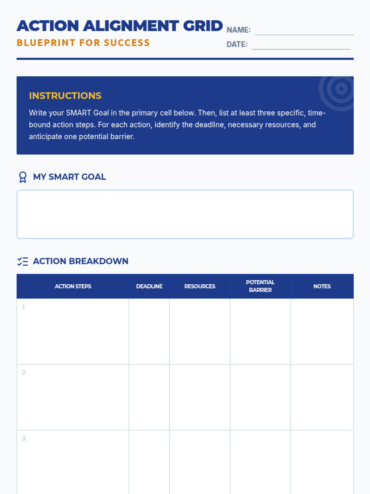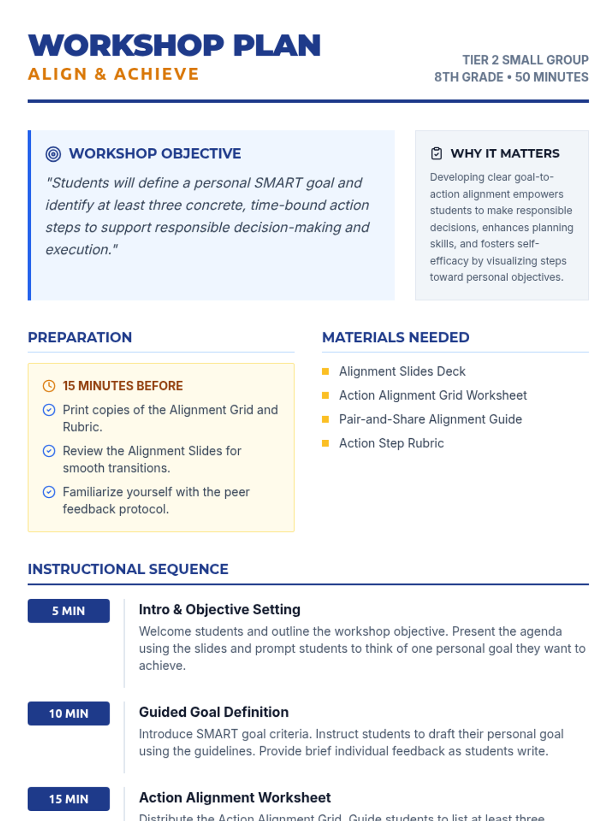 A small-group workshop for 8th graders focusing on aligning personal SMART goals with concrete, time-bound action steps through interactive activities and guided reflections.
