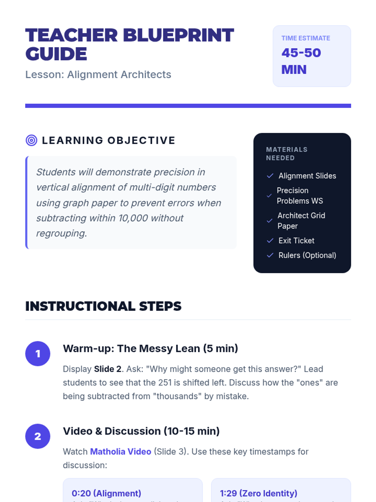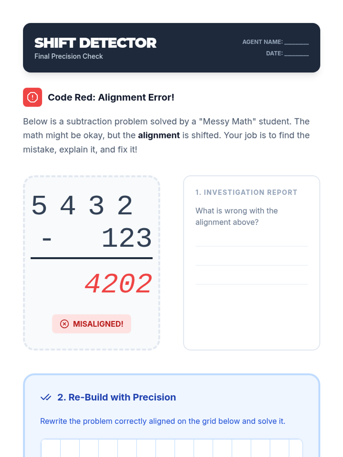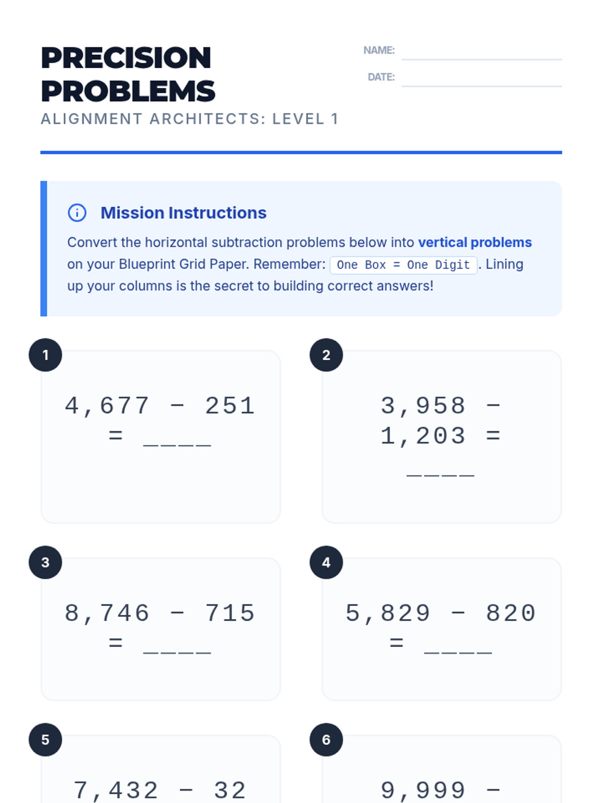 A math lesson for 3rd and 4th graders focused on using vertical alignment and graph paper to solve subtraction problems with multi-digit numbers. Students identify errors caused by poor alignment and practice precise placement to ensure accuracy.